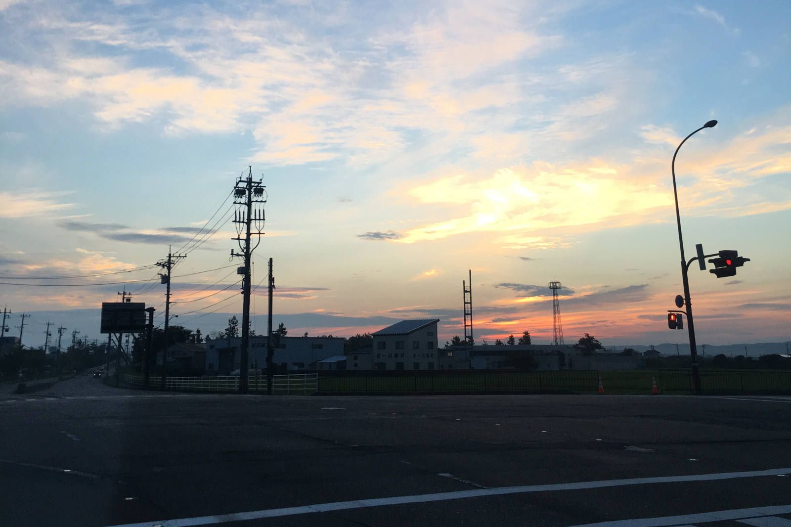 早朝、まだ夜が明ける前に集合し、ハイエースにパンパンの荷物を積み込みいざ富山へ!!天気予報は晴れ!綺麗な朝焼けを眺めながら出発です。