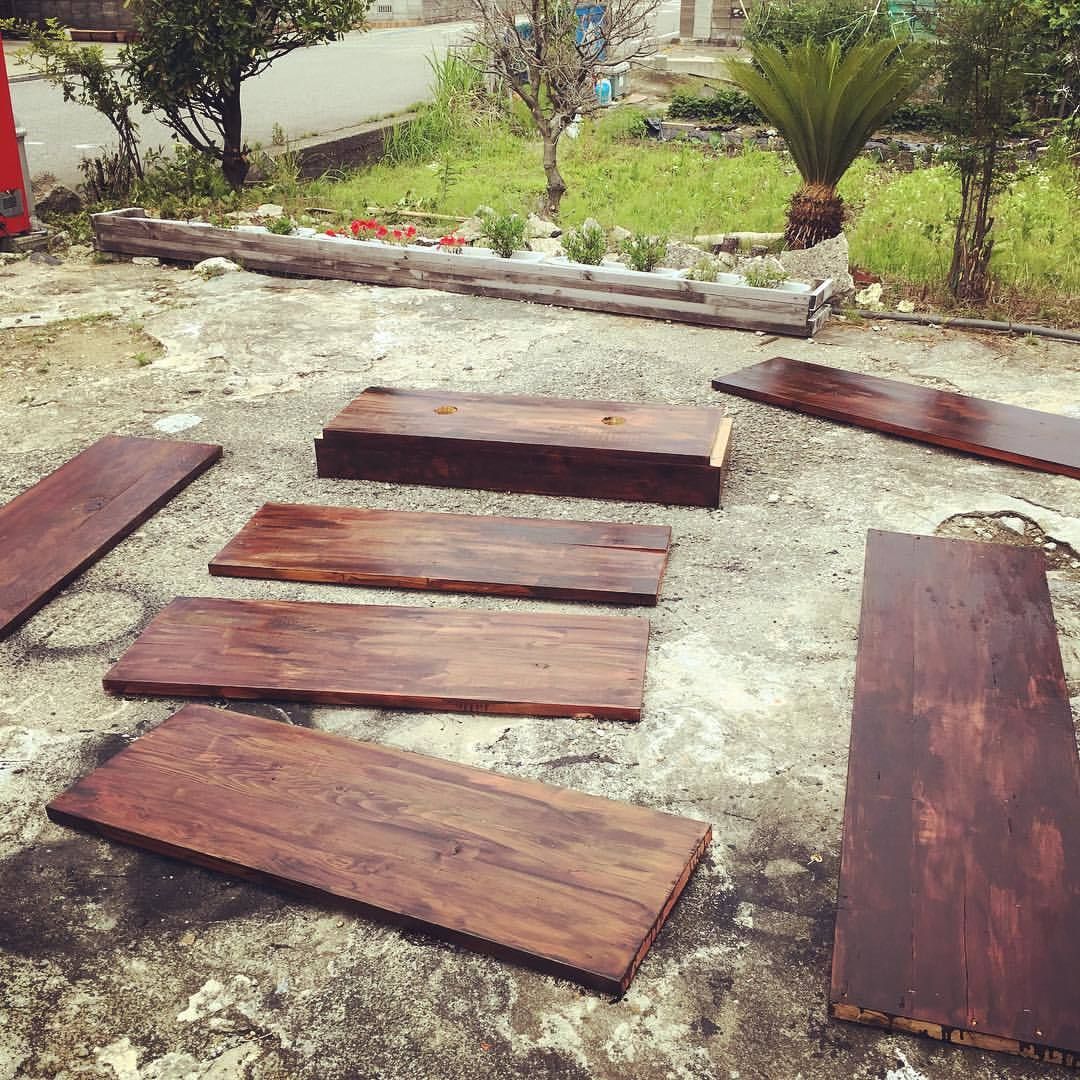 店舗の大まかな改装が終わると次は什器です!2x4材を使ってカウンターを作ります。ちなみにこの段階で、一旦床板を並べ替え、汚れや傷が不自然にならないようにします。そして固定し、什器の制作に入ります。
