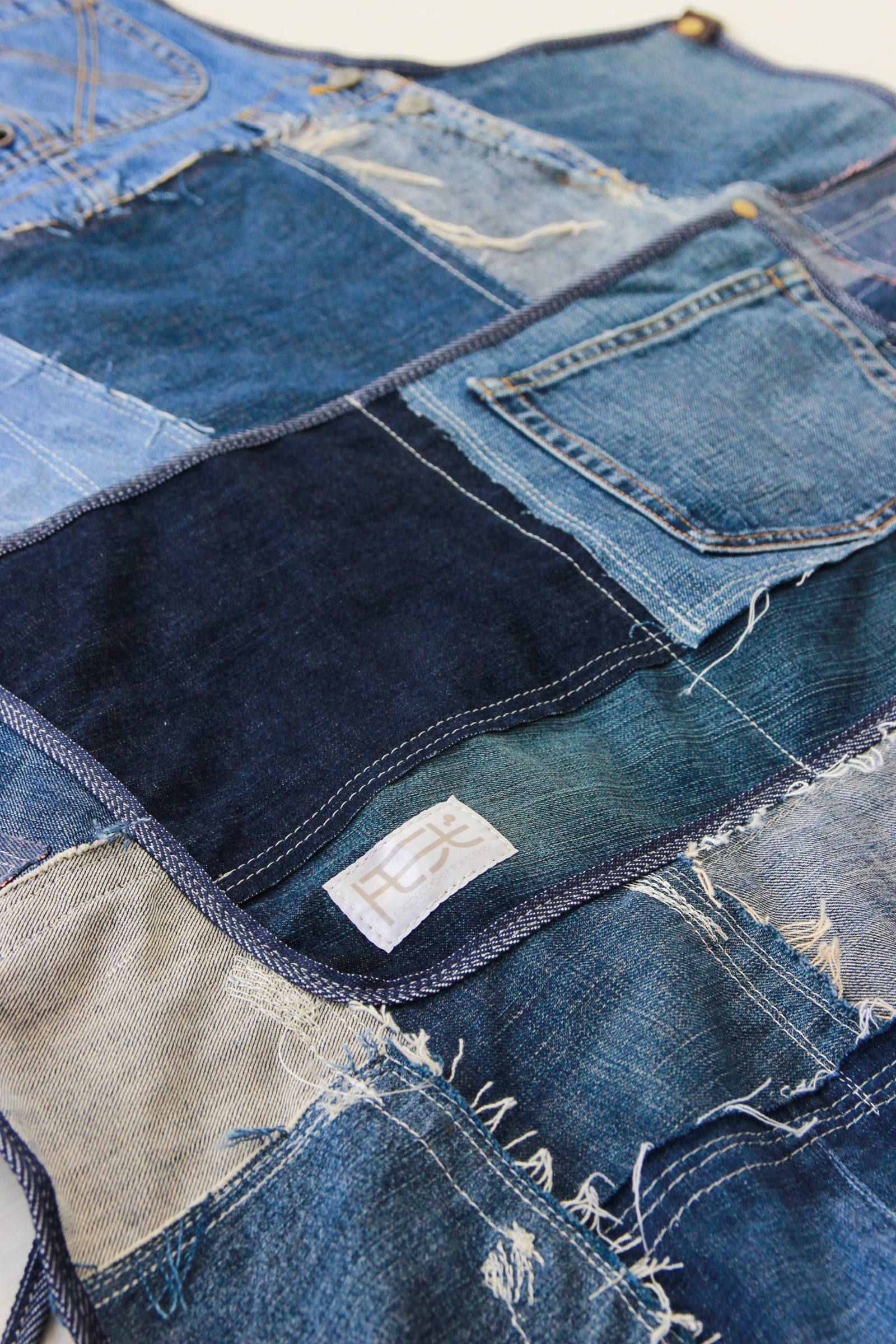 全て古着のデニムを解体した生地を使い、ランダムにパッチワーク。ほつれた部分が活かされる様に縫いました。