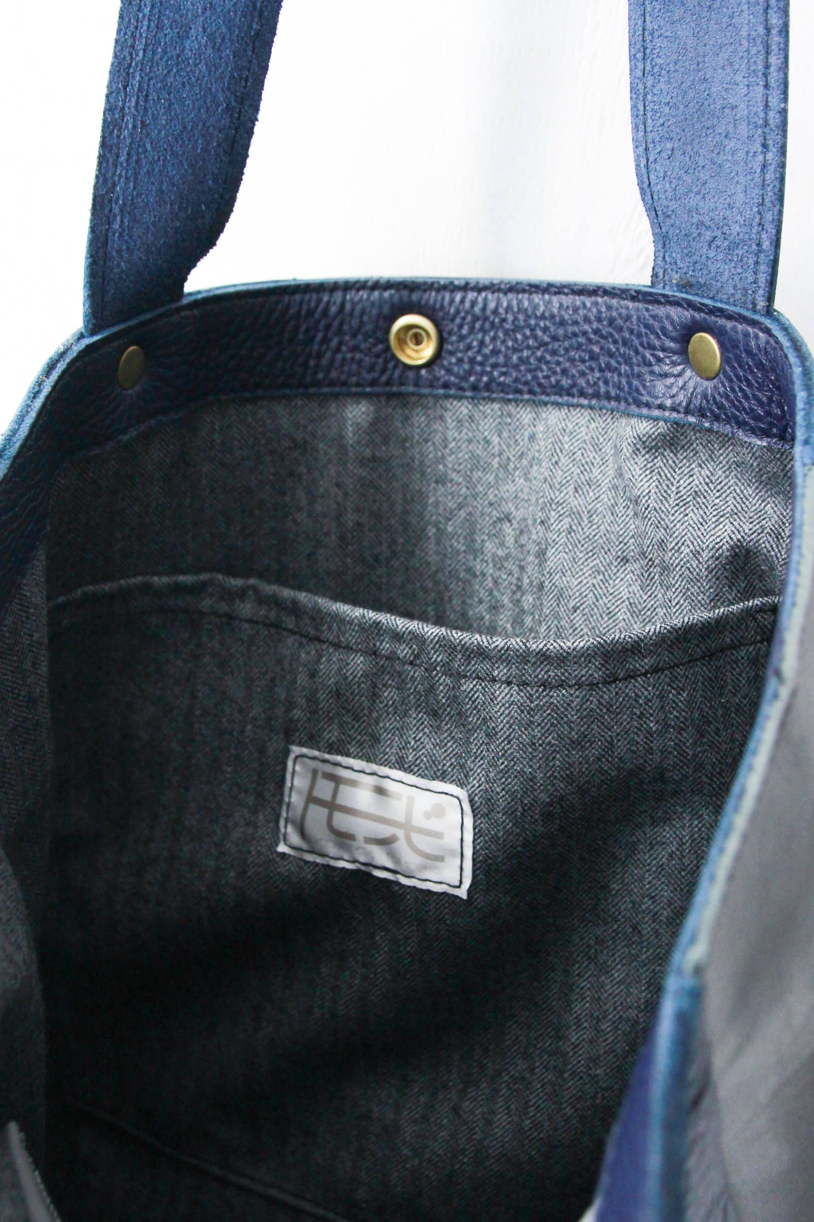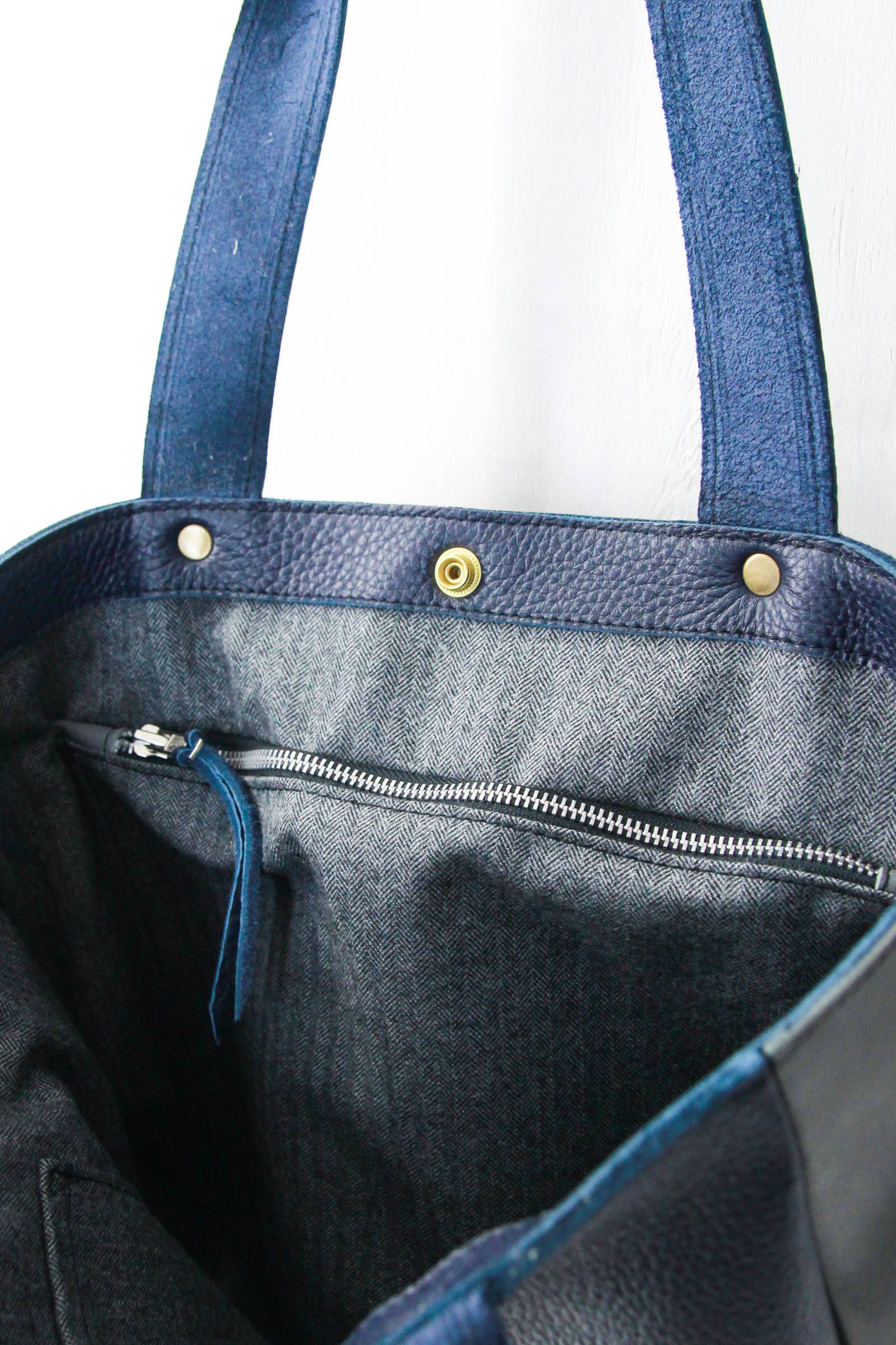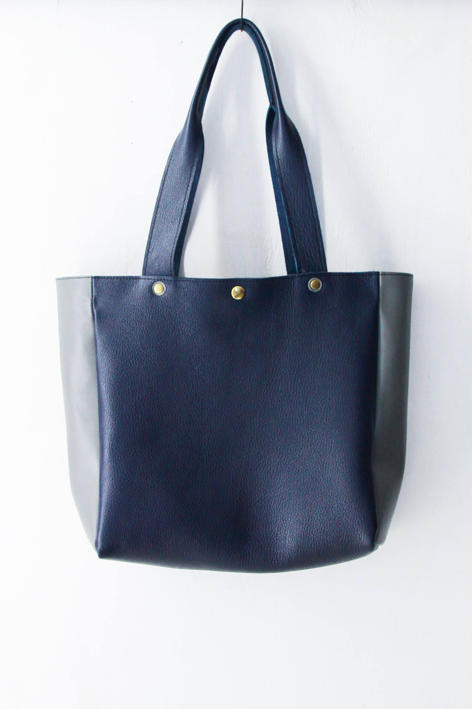 牛革を使用した2トーン仕様のトートバッグ。シボのある柔らかなネイビーの革と、ツルッとした表情のグレーの革のコントラストが何ともオシャレで良い色合いです。