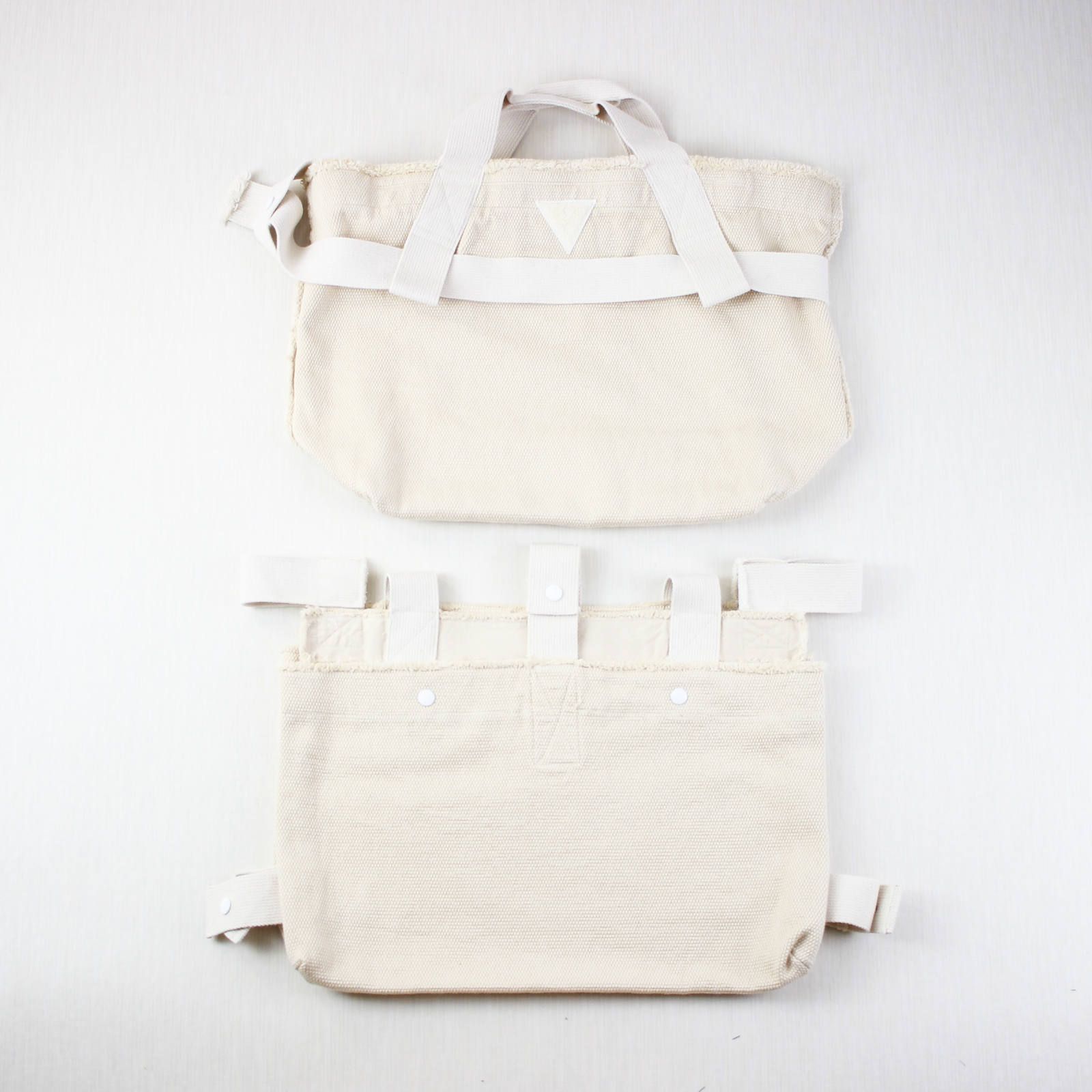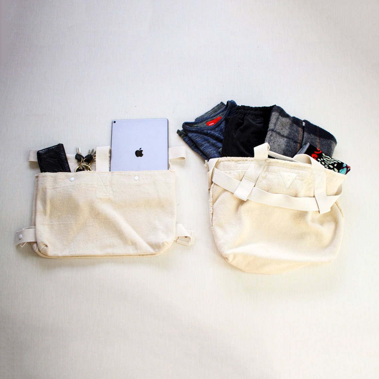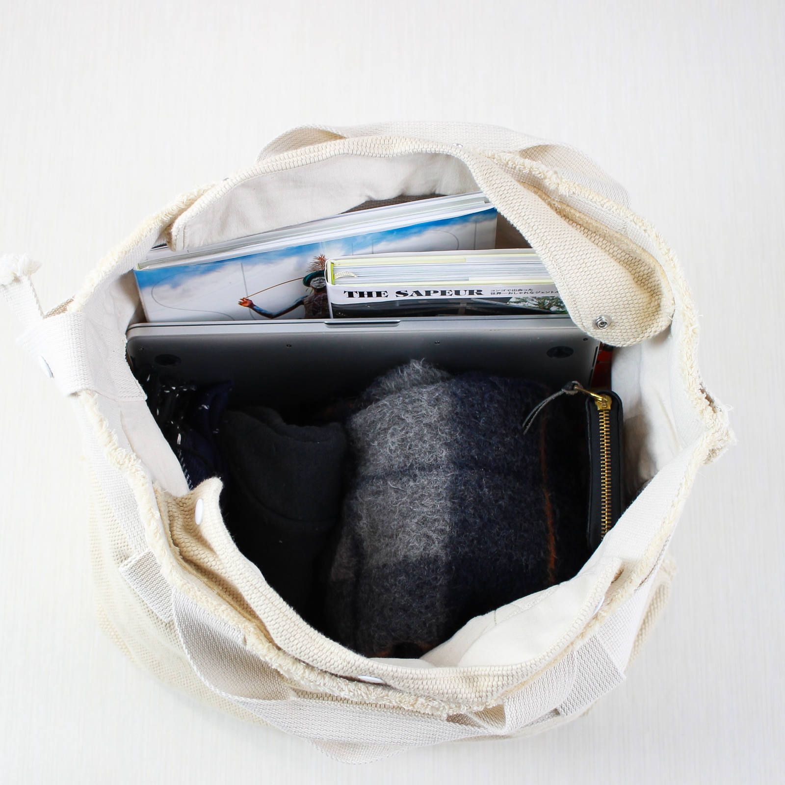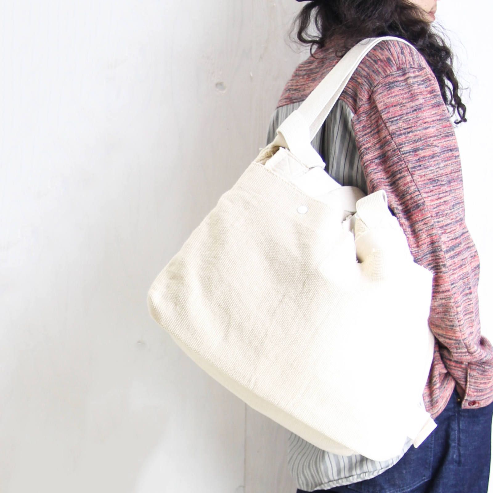 ベースとなるのはトートバッグ。ショルダー紐を本体に添わせて固定すれば手提げ鞄、ショルダー紐を端にホックで固定すればショルダーバッグとして使用出来ます。