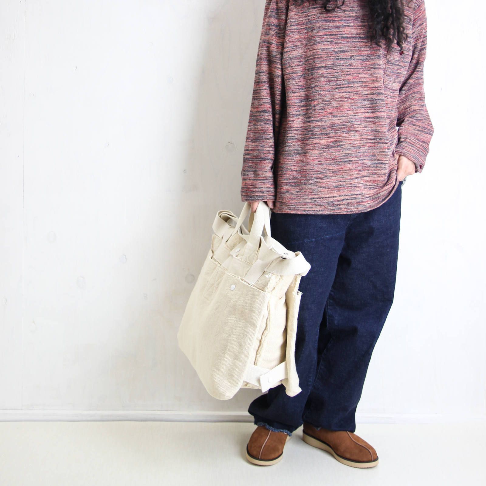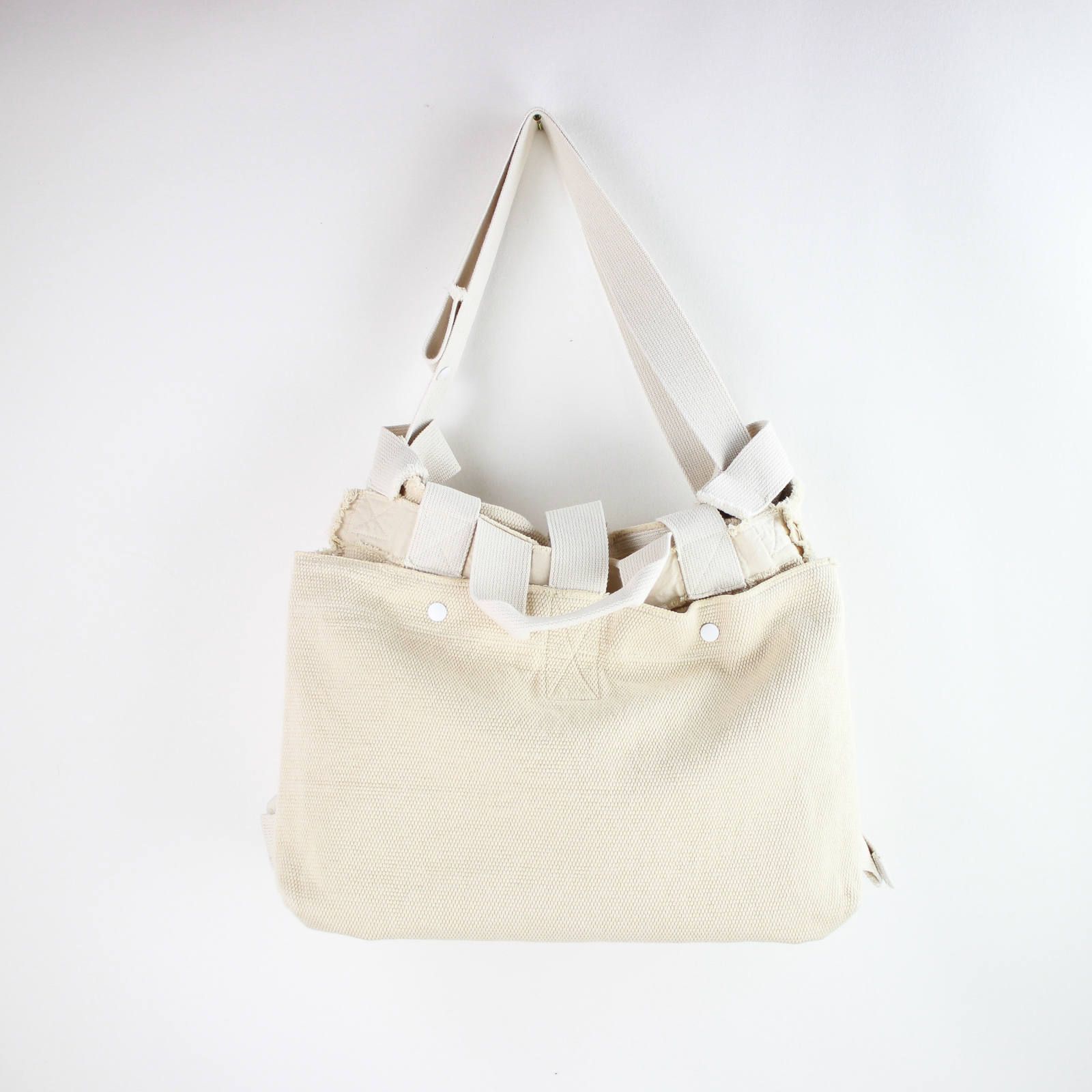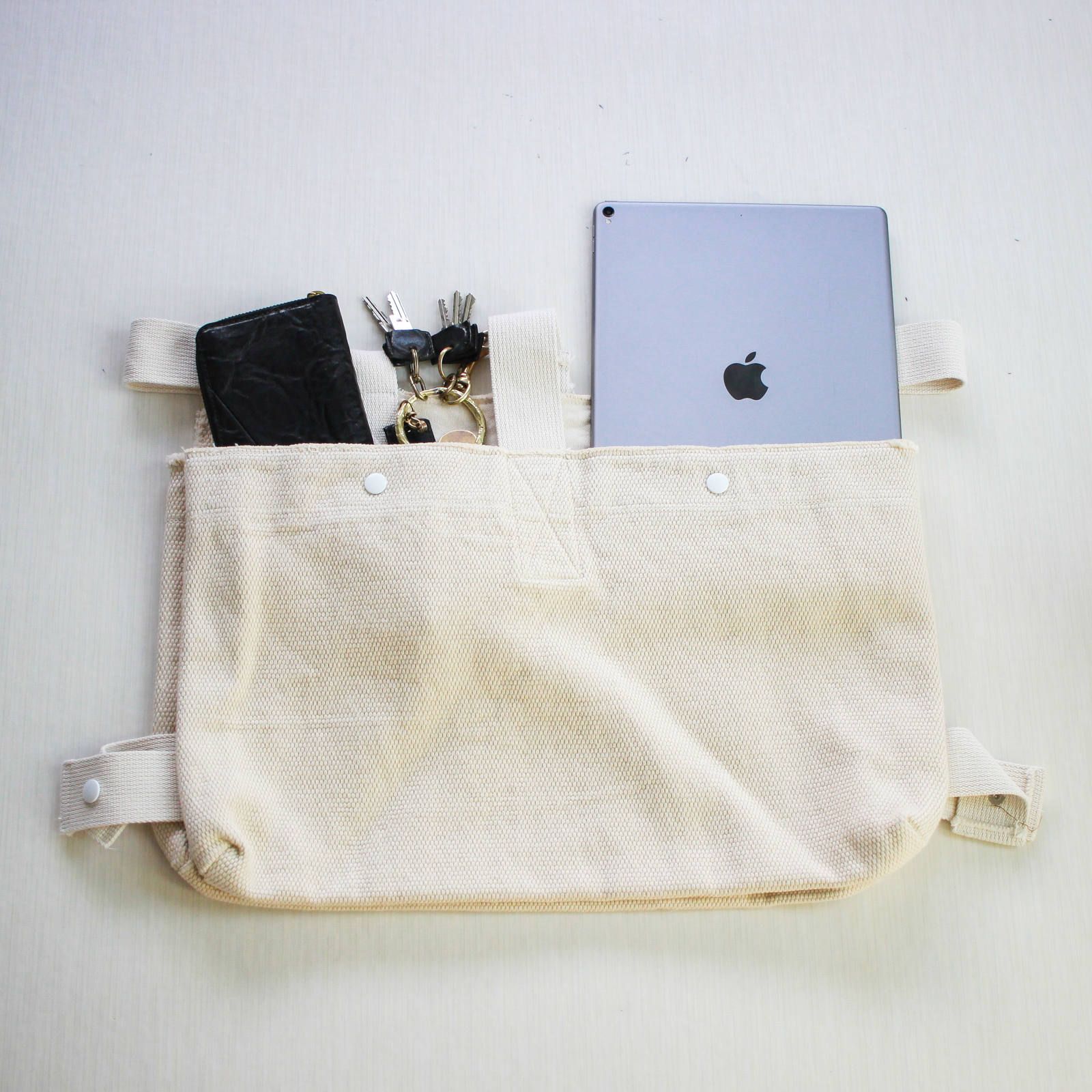 ベースとなるのはトートバッグ。ショルダー紐を本体に添わせて固定すれば手提げ鞄、ショルダー紐を端にホックで固定すればショルダーバッグとして使用出来ます。