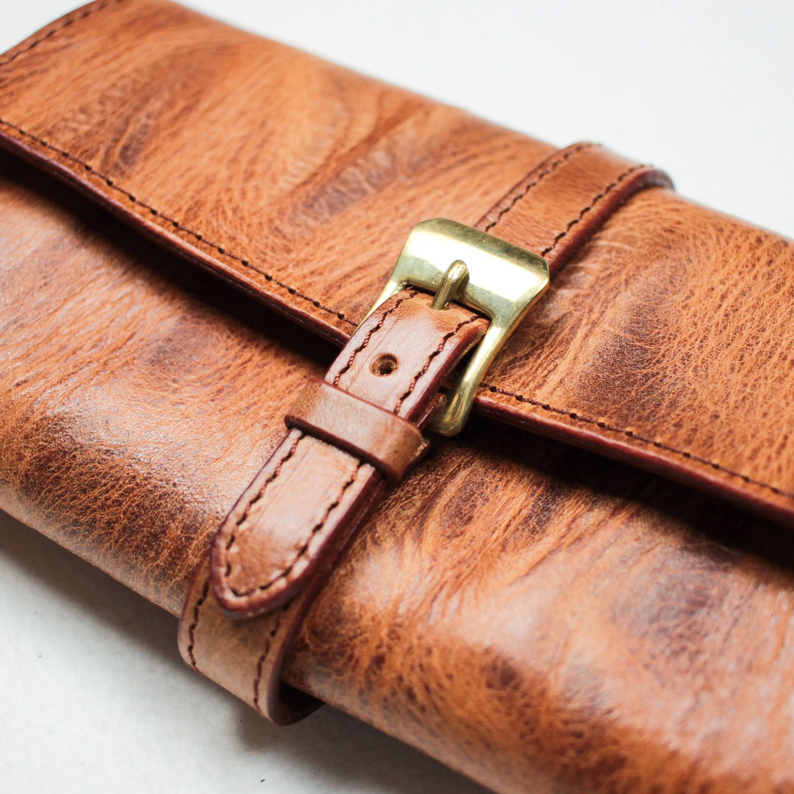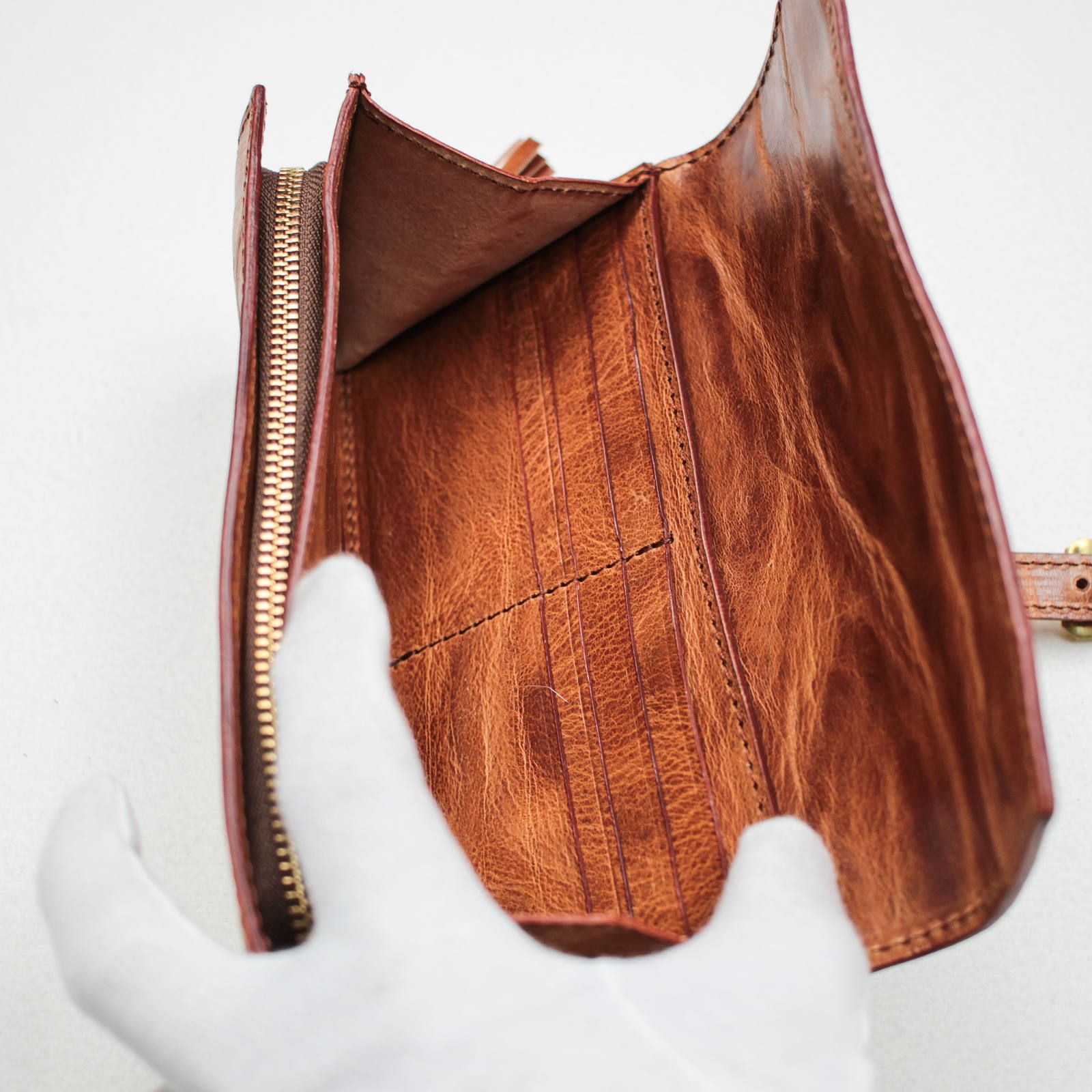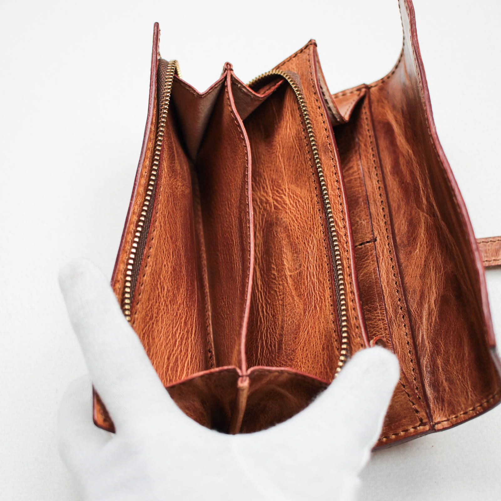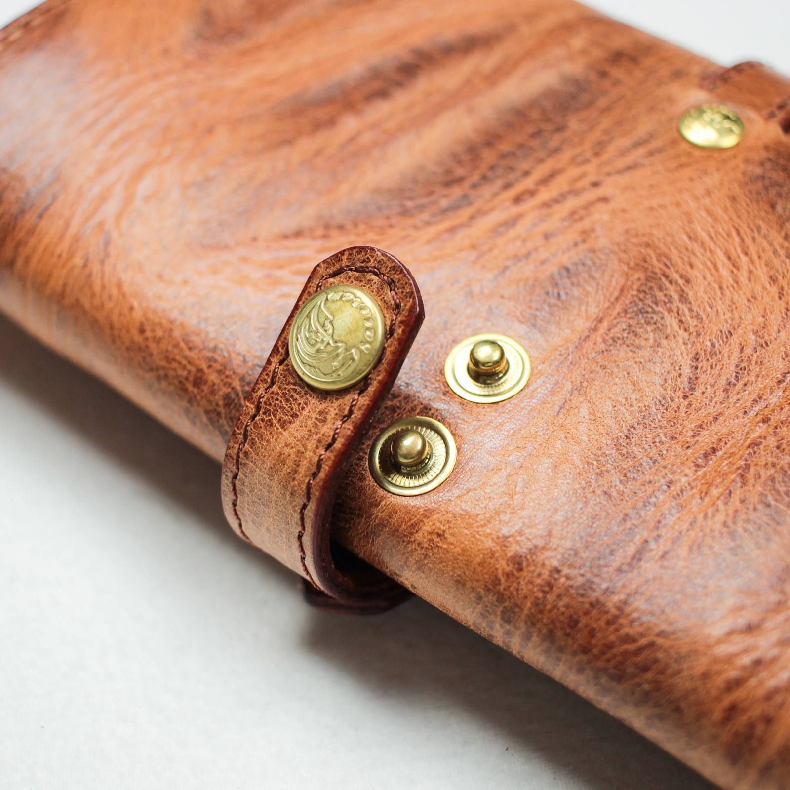 人気の秘密は、デザインはもちろんその使い勝手の良さと耐久性にあります。どこを見ても表革が出るように通常の倍の量の革を使い、革を貼り合わせて作られています。そのため少し重いですが抜群の耐久力で、型崩れや破れ等の出にくくなっています。実際に僕ももう5年以上使ってますが、まだ形も綺麗なままです。