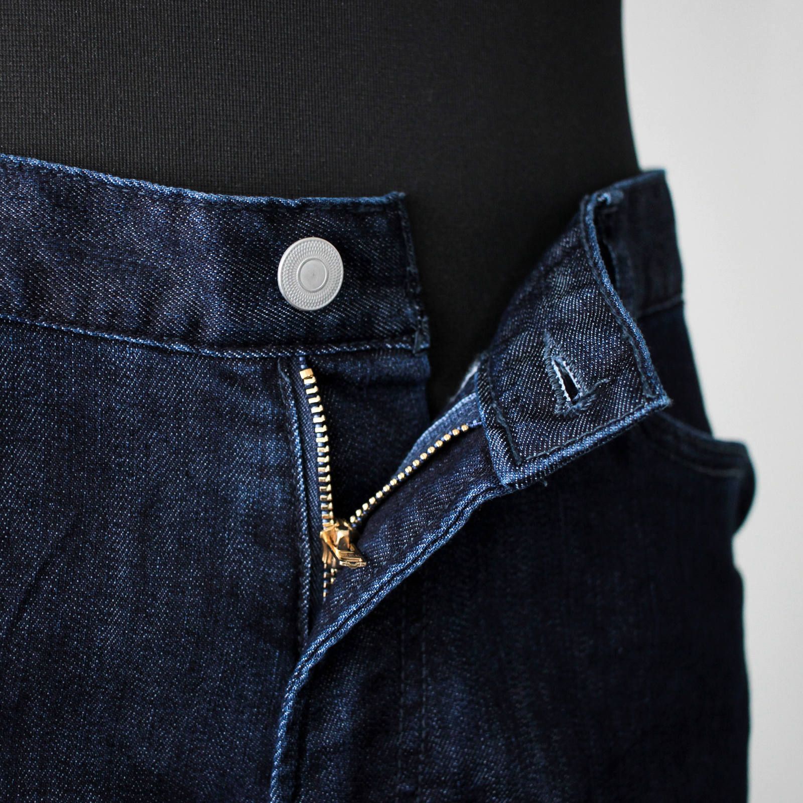 フロントホックはビンテージ調のタックボタン、ファスナーはユニバーサルジップを使用。