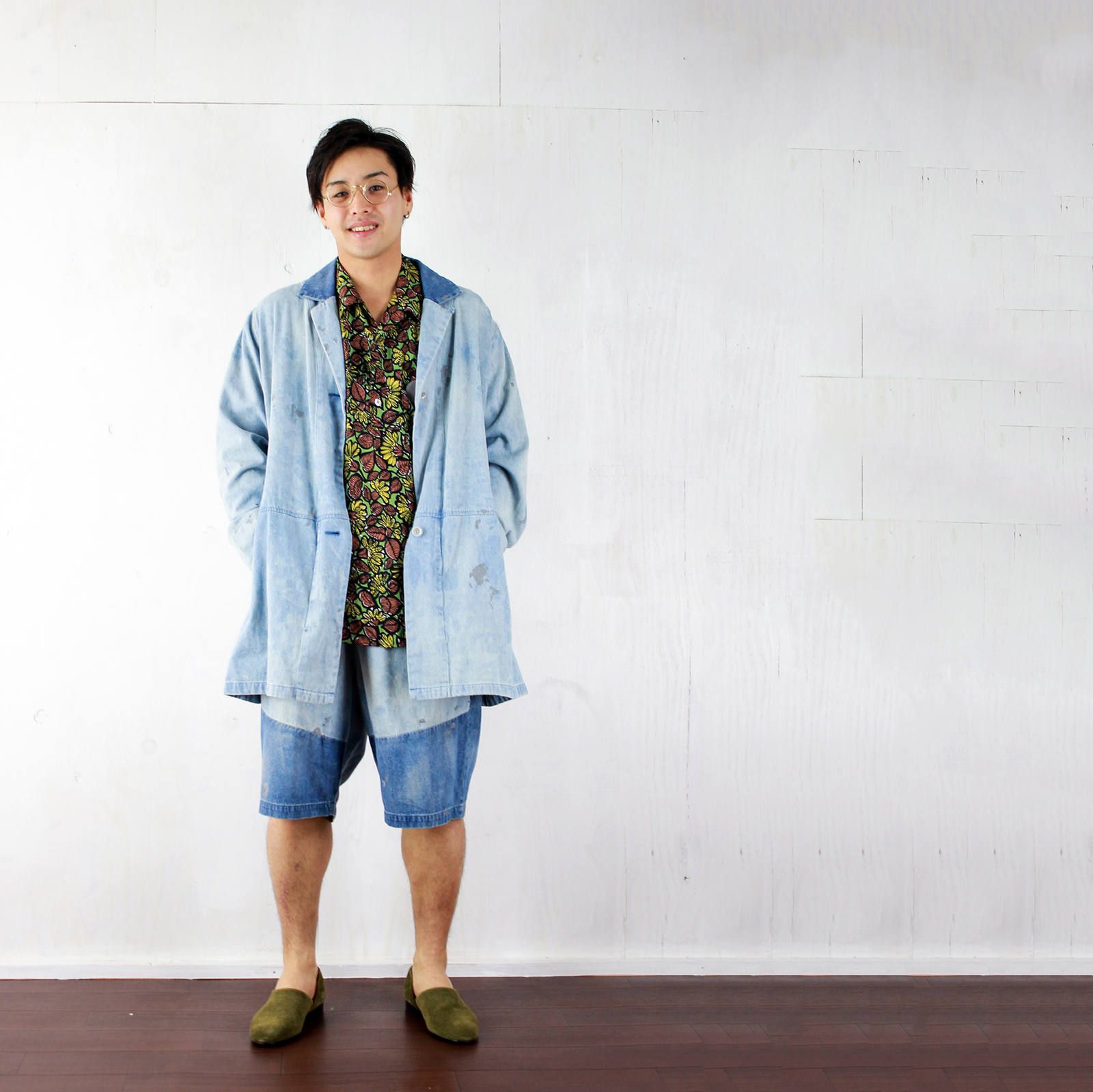 サイズはフリーですが、着丈の長さが選べる仕様となってます!上のアロハ柄に合わせたのが着丈が長いF-3サイズ。下のバギーパンツに合わせたのが着丈の短いF-2サイズ。ロングコートとハーフコートといったイメージですね。