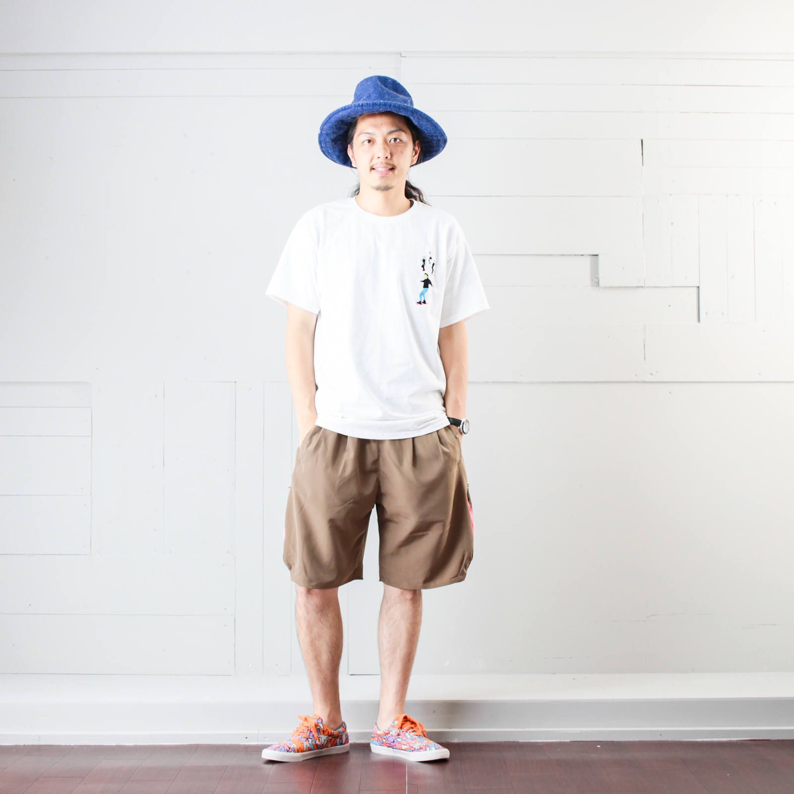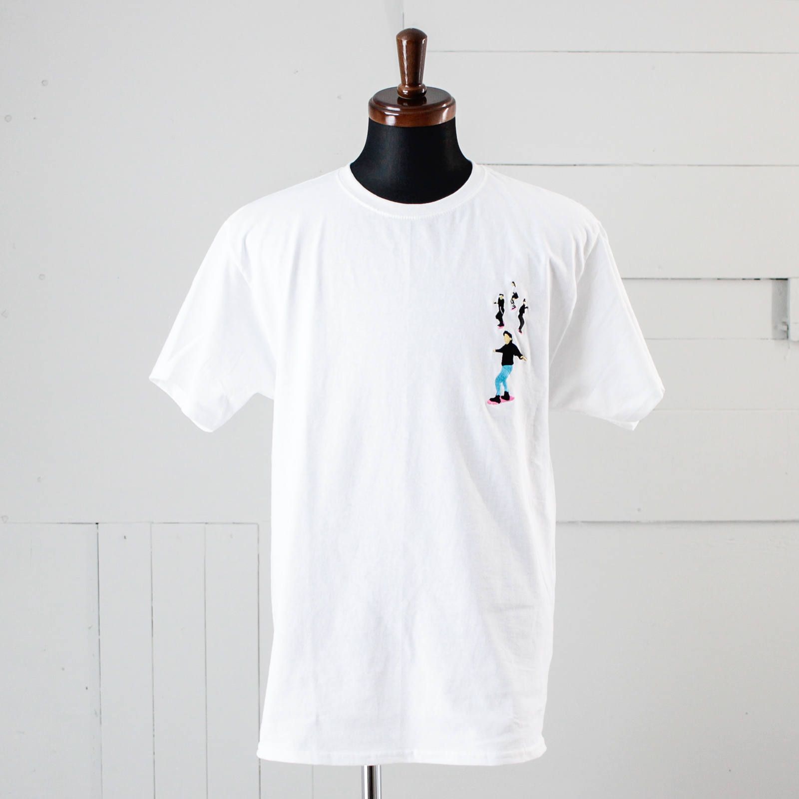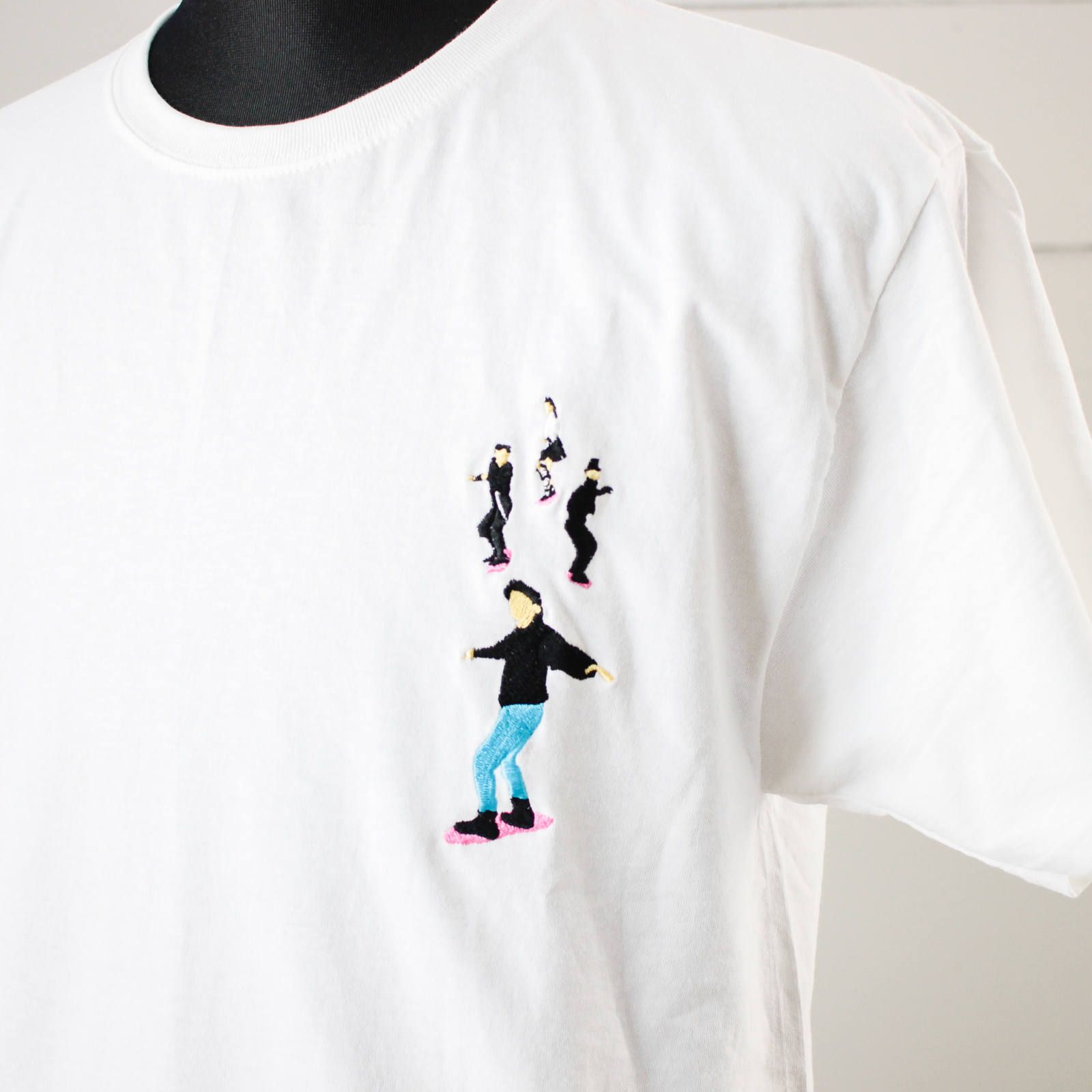 まずはコチラ。某映画のワンシーンをコミカルな刺繍で表現したTシャツ。Tシャツボディーは安心と信頼のチャンピオンボディを使用しているので、ガンガン着てガンガン洗濯してもヘタリにくいです!夏の陽気にまかせてコミカルデザインを楽しみましょう♪