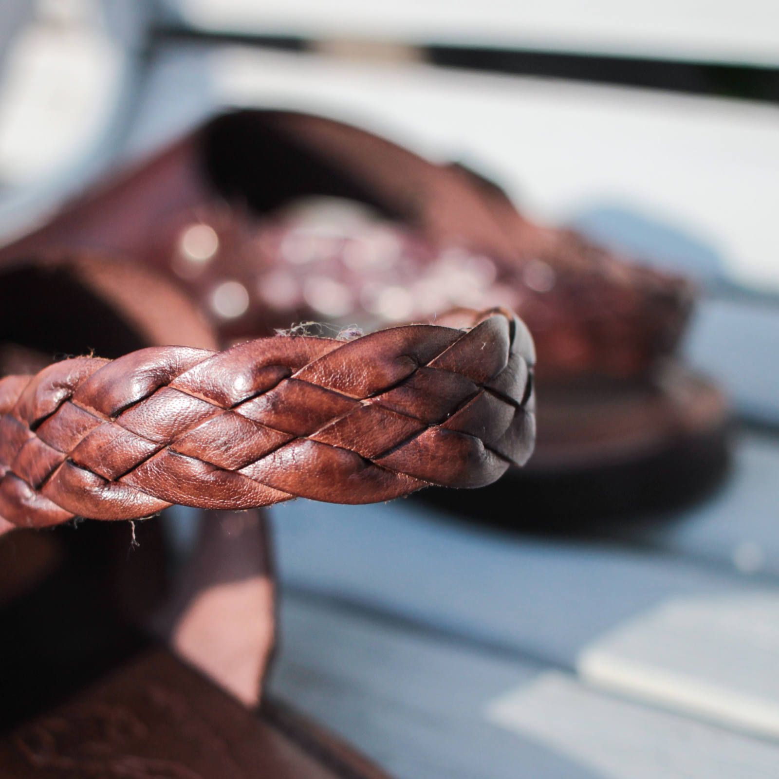 カカトをロックするベルトは編み込みデザインで、バックルで長さ調整が可能。