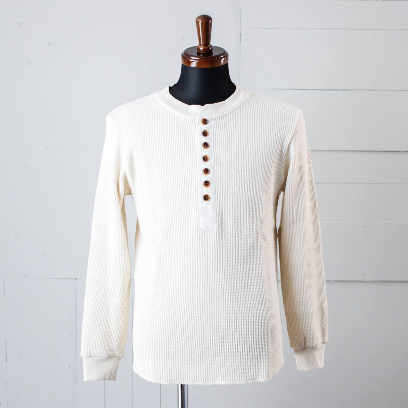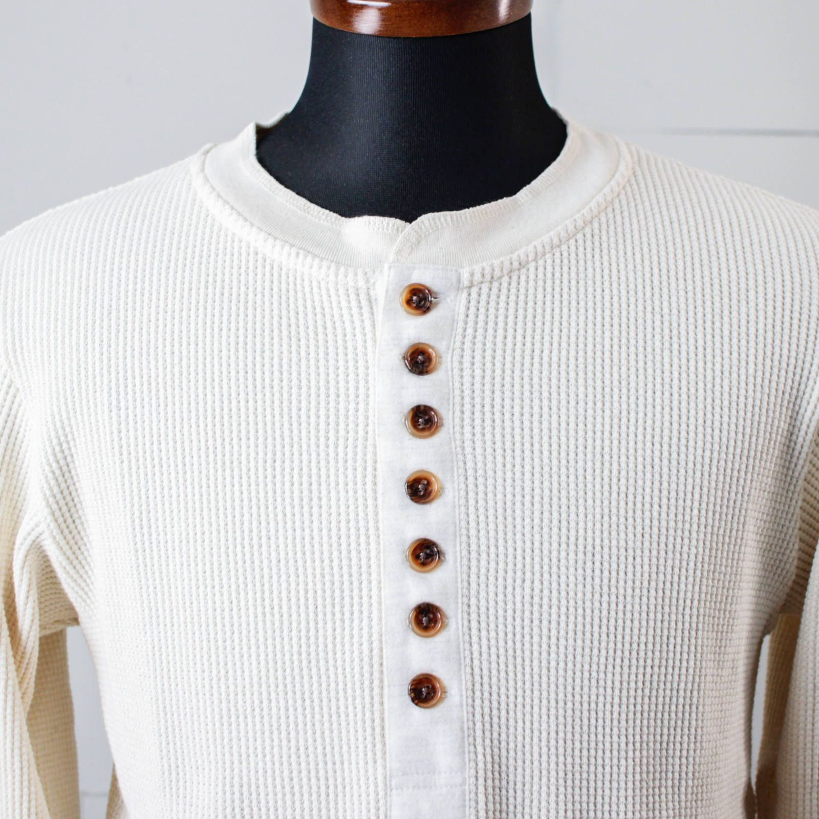 目を惹くボタンの多いヘンリーネック。この多ボタンデザインが他になくこのアイテムの魅力でもあります。