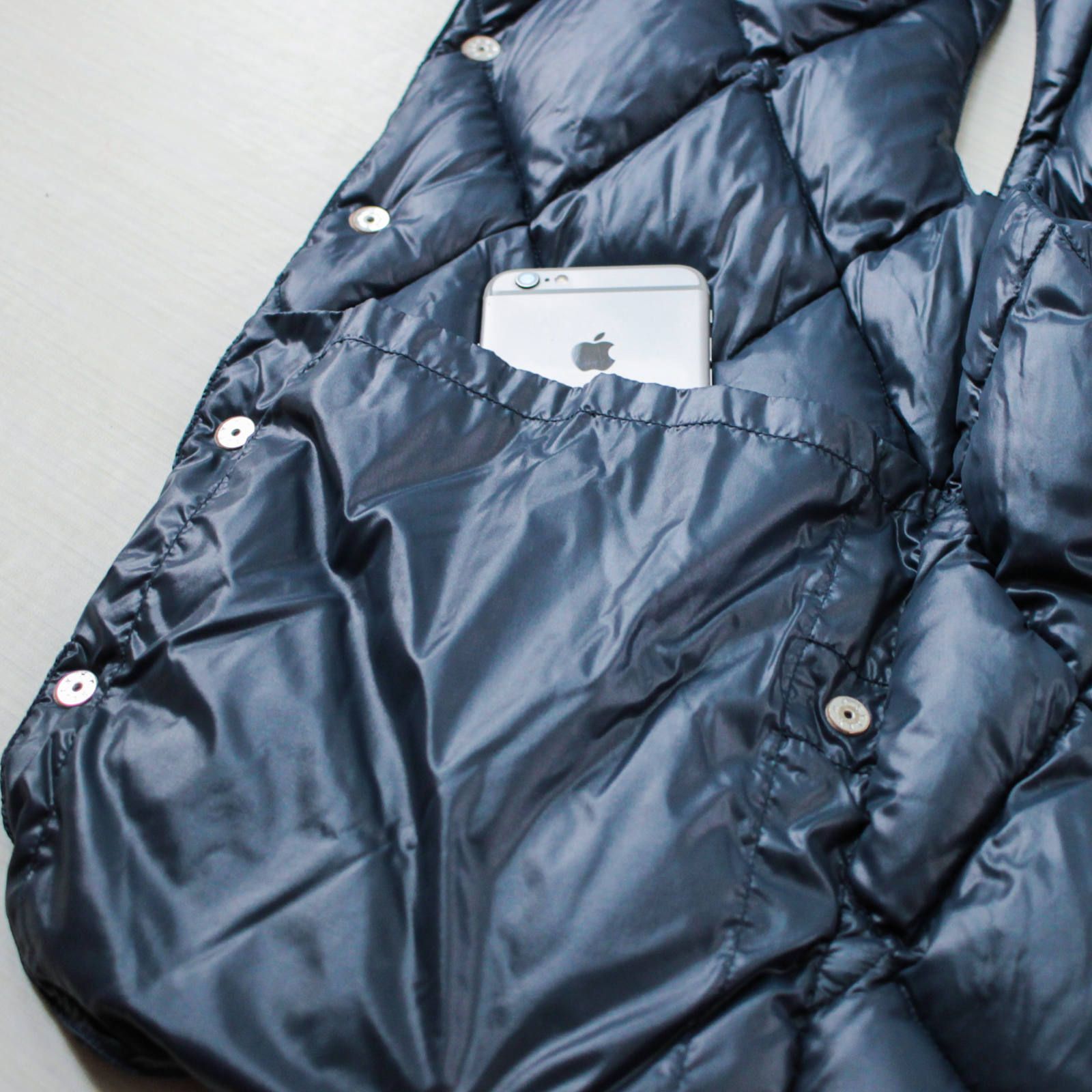 ハンドポケットはホック付き。ポケット内の生地は優しい肌触りと保温性の高いトリコットスエードを採用してます!