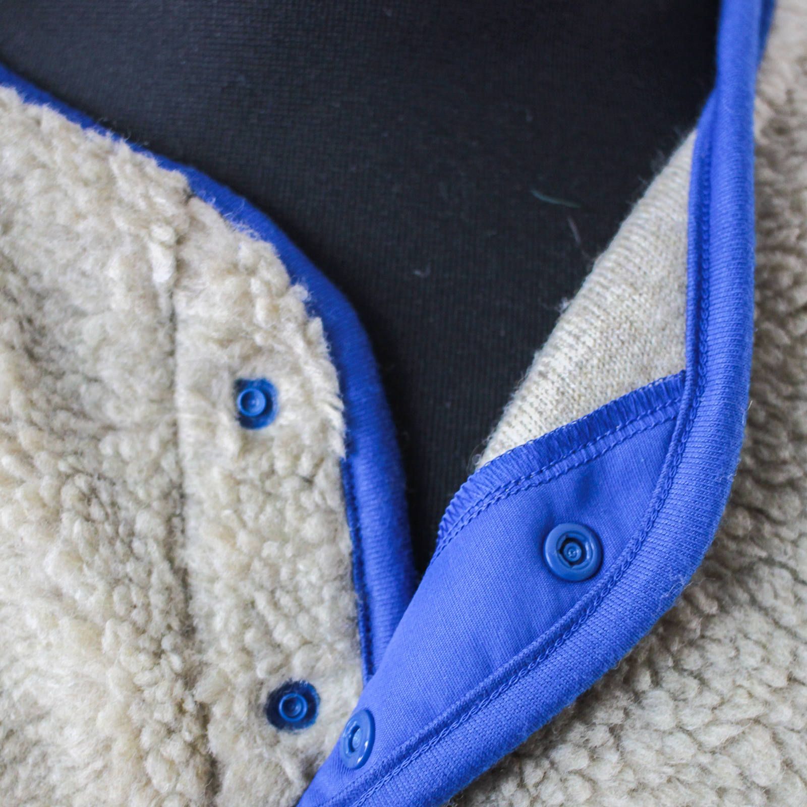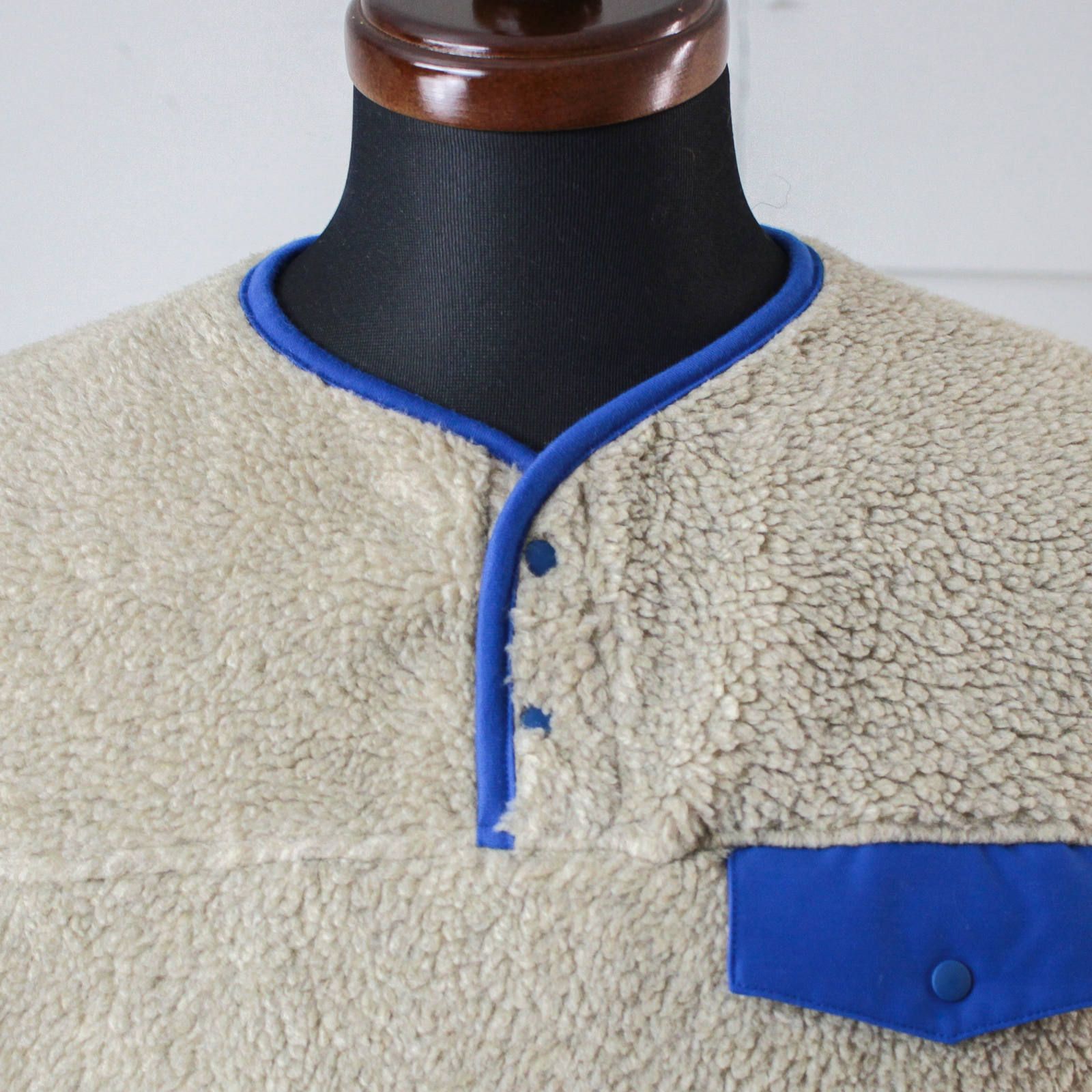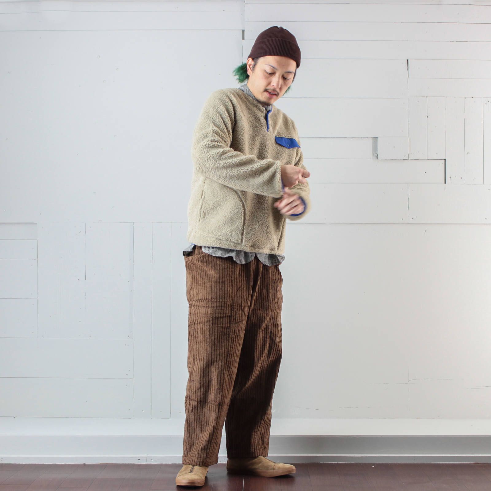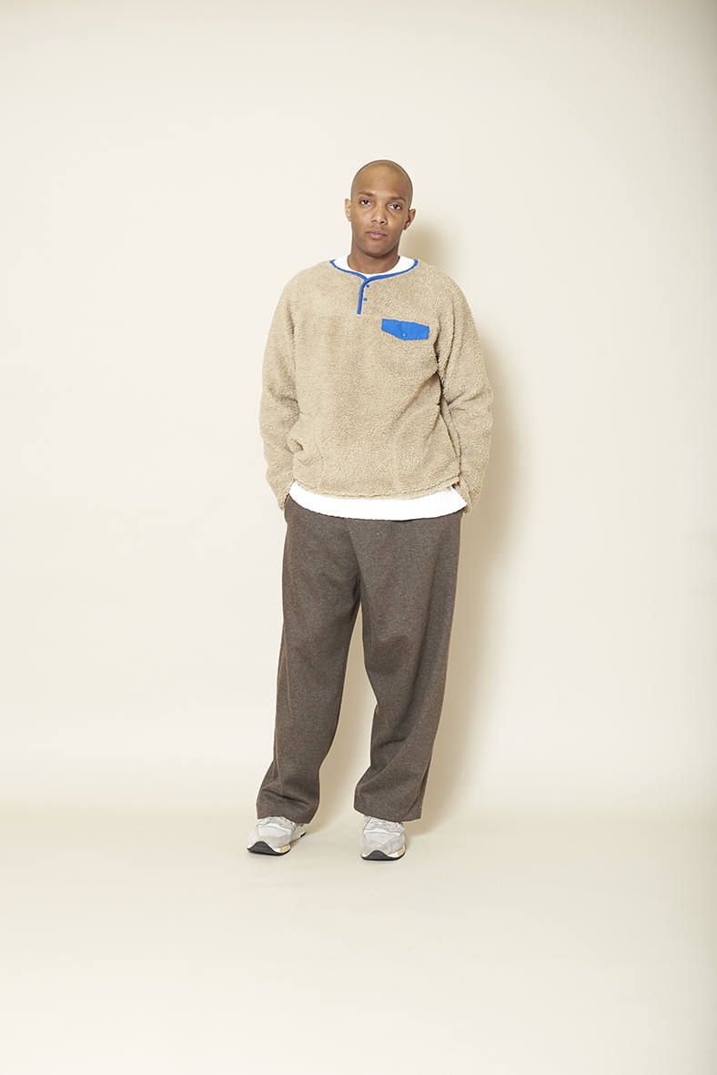 まず首回りはヘンリーネックタイプ。スナップボタンでパチパチっと簡単に開け閉めが可能。プルオーバータイプなのでこの仕様は嬉しいですよね。インナーにシャツやハイネックを着た時も活躍します!
