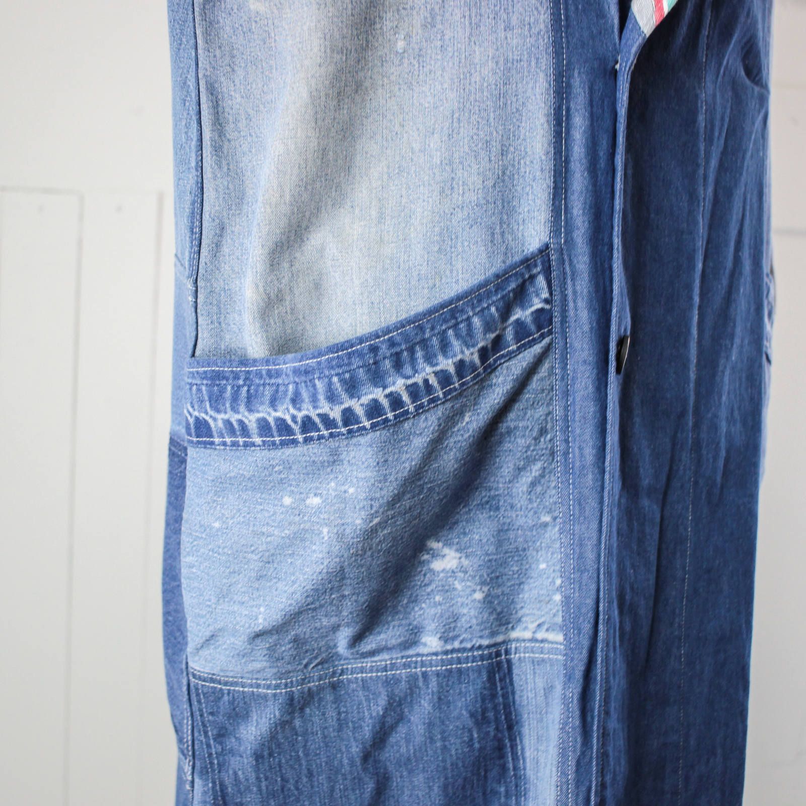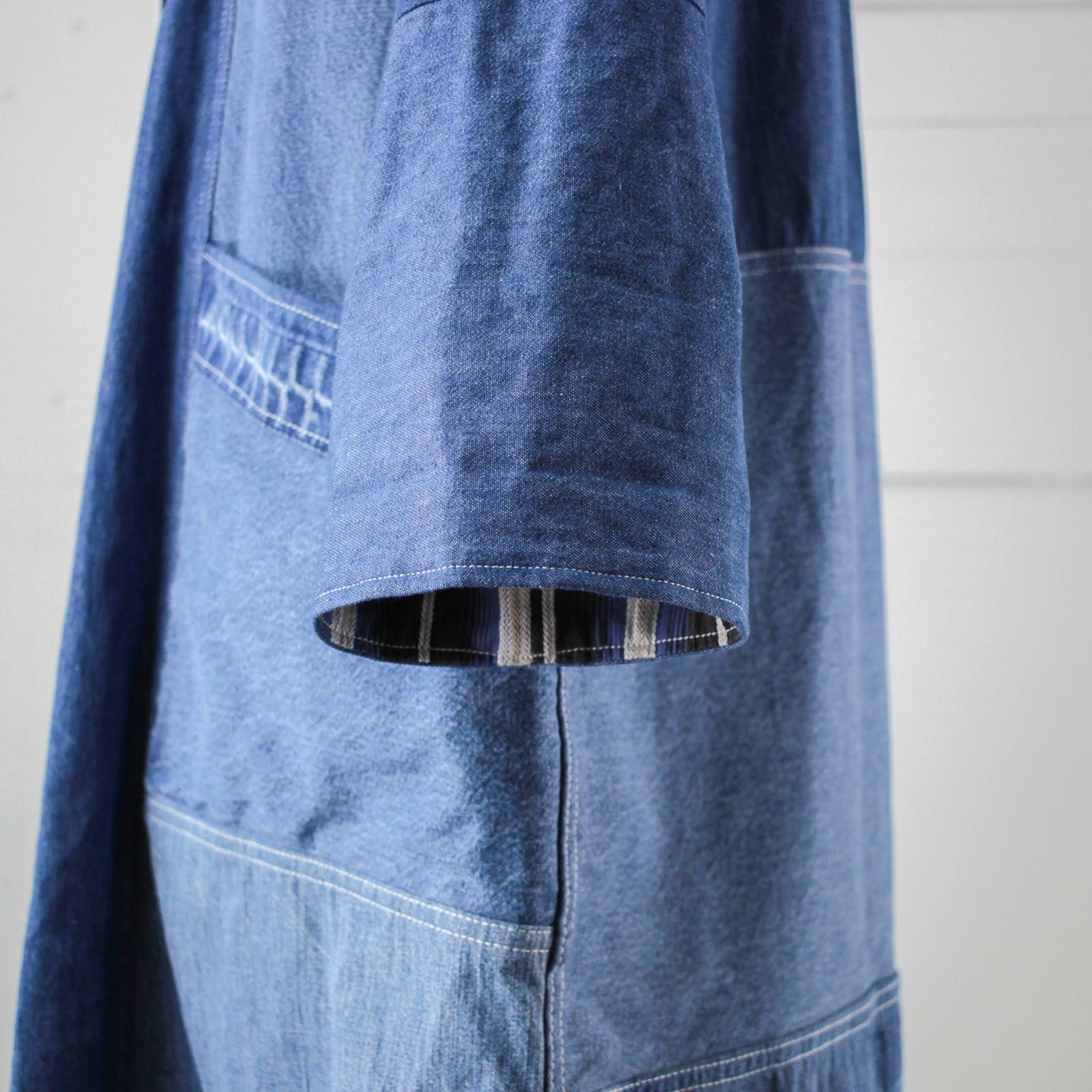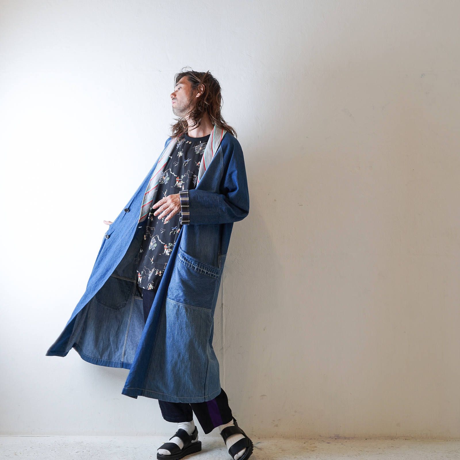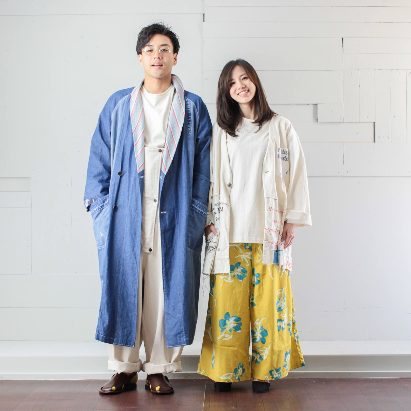 さて、こちらのコートはアメリカ古着のオーバーオールを解体し、再構築された唯一無二のアイテム。襟と袖内側はヨーロッパのビンテージパジャマを解体した生地を使用しています。