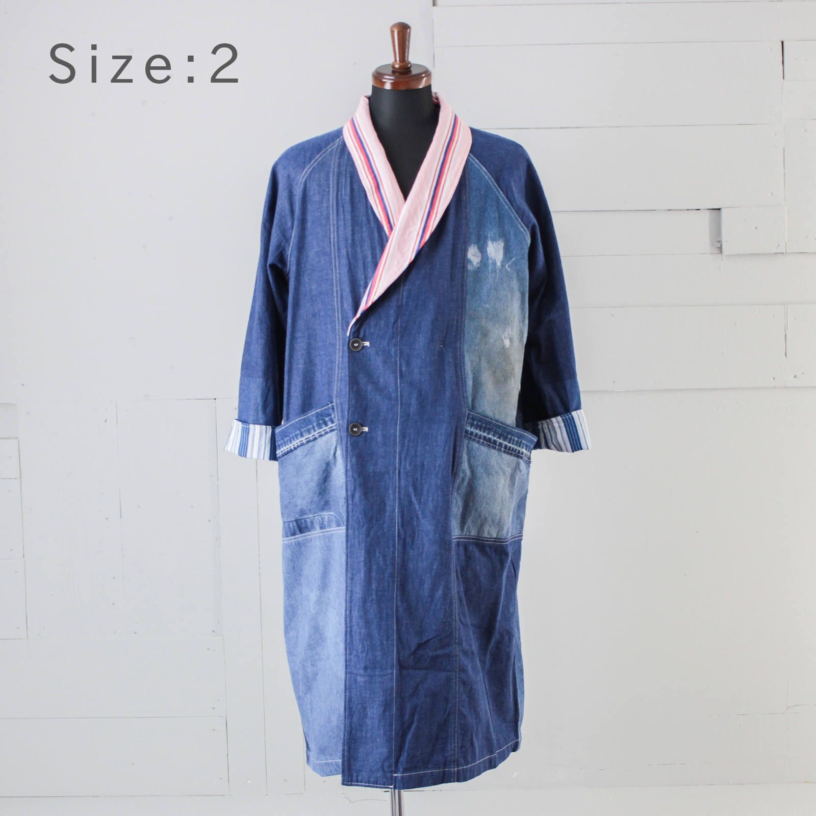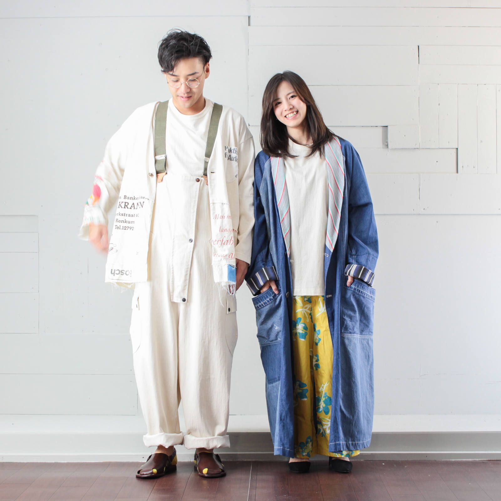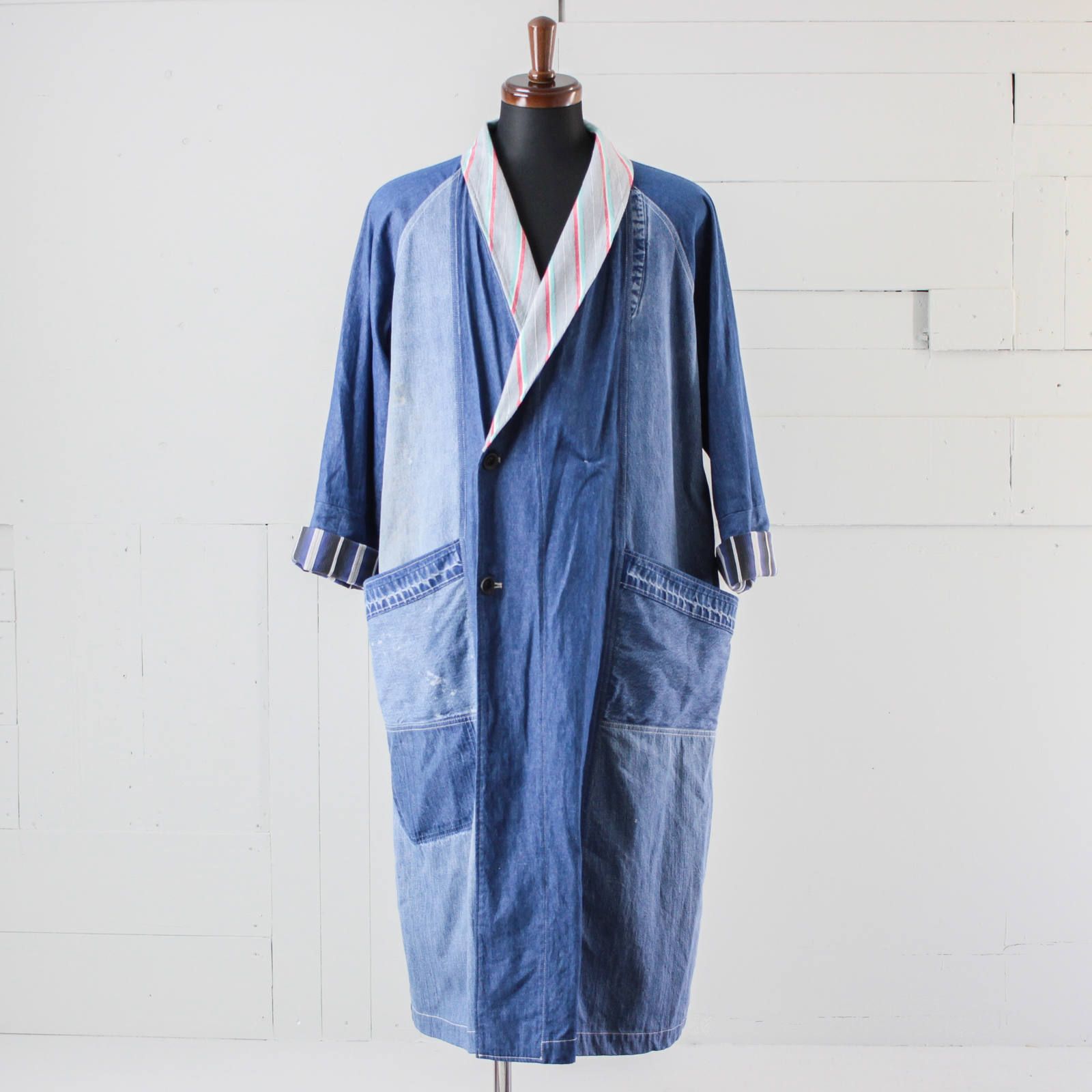 さて、こちらのコートはアメリカ古着のオーバーオールを解体し、再構築された唯一無二のアイテム。襟と袖内側はヨーロッパのビンテージパジャマを解体した生地を使用しています。