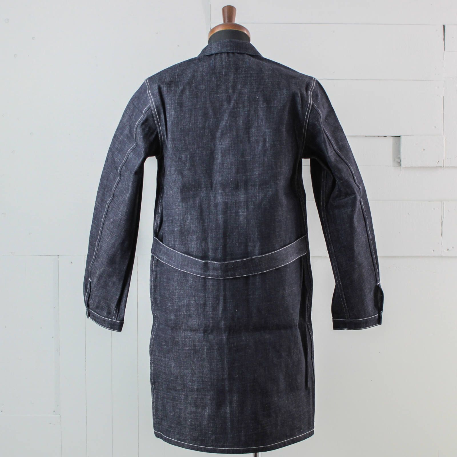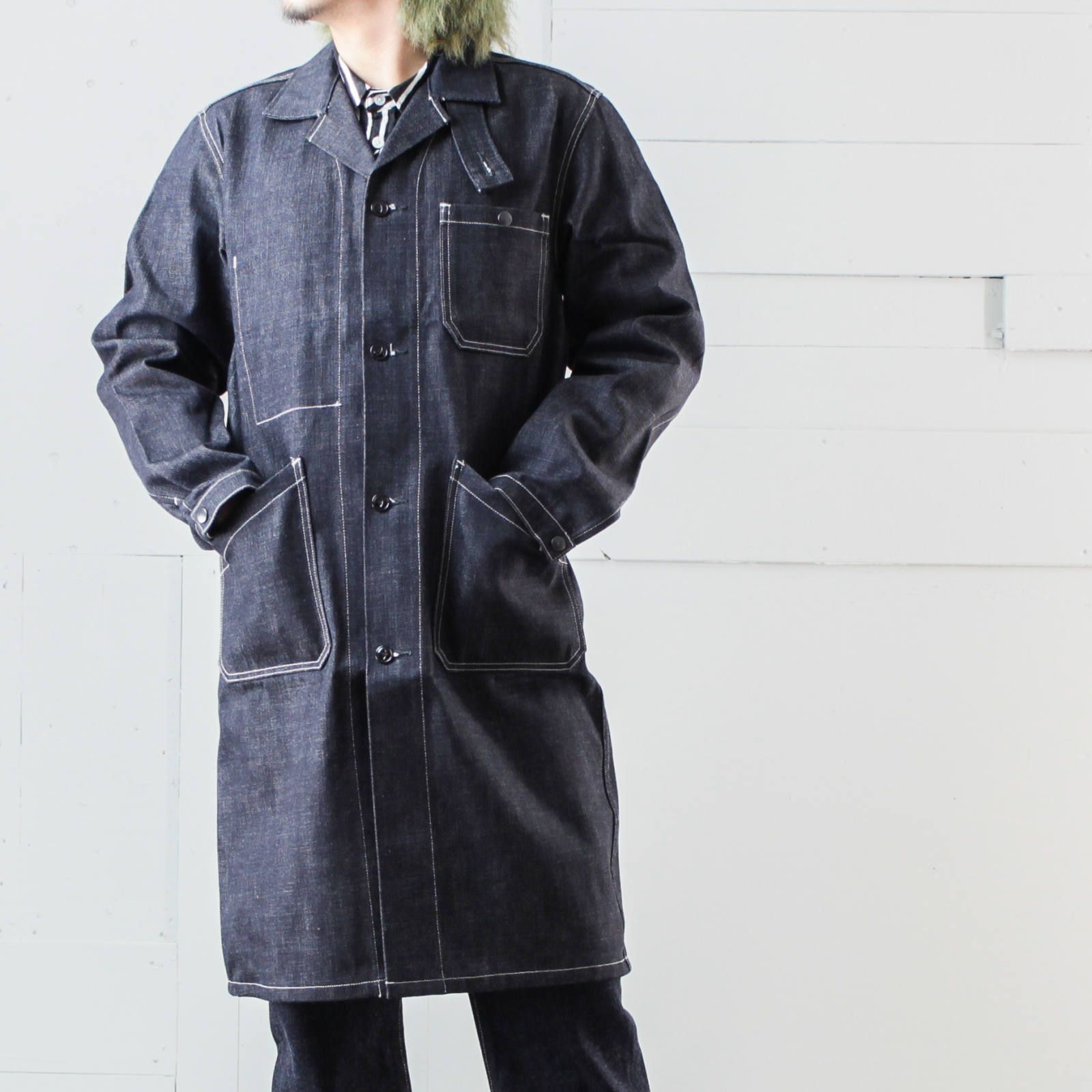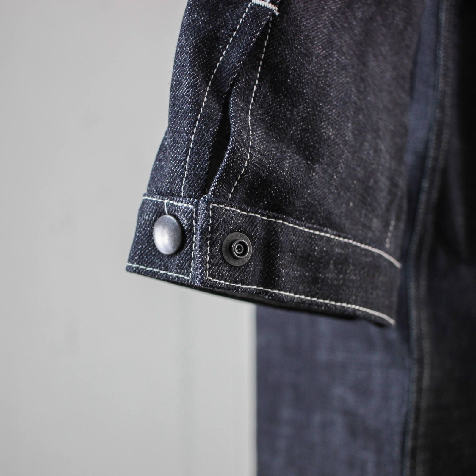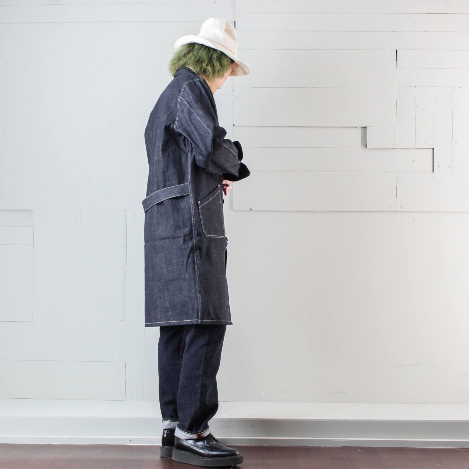 生デニム(ノンウォッシュデニム)を使用してますので、パッリパリの硬いコート。この硬いデニムを柔らかくなるまで着て、徐々に自分色に染め上げていくのが楽しみなアイテムです。