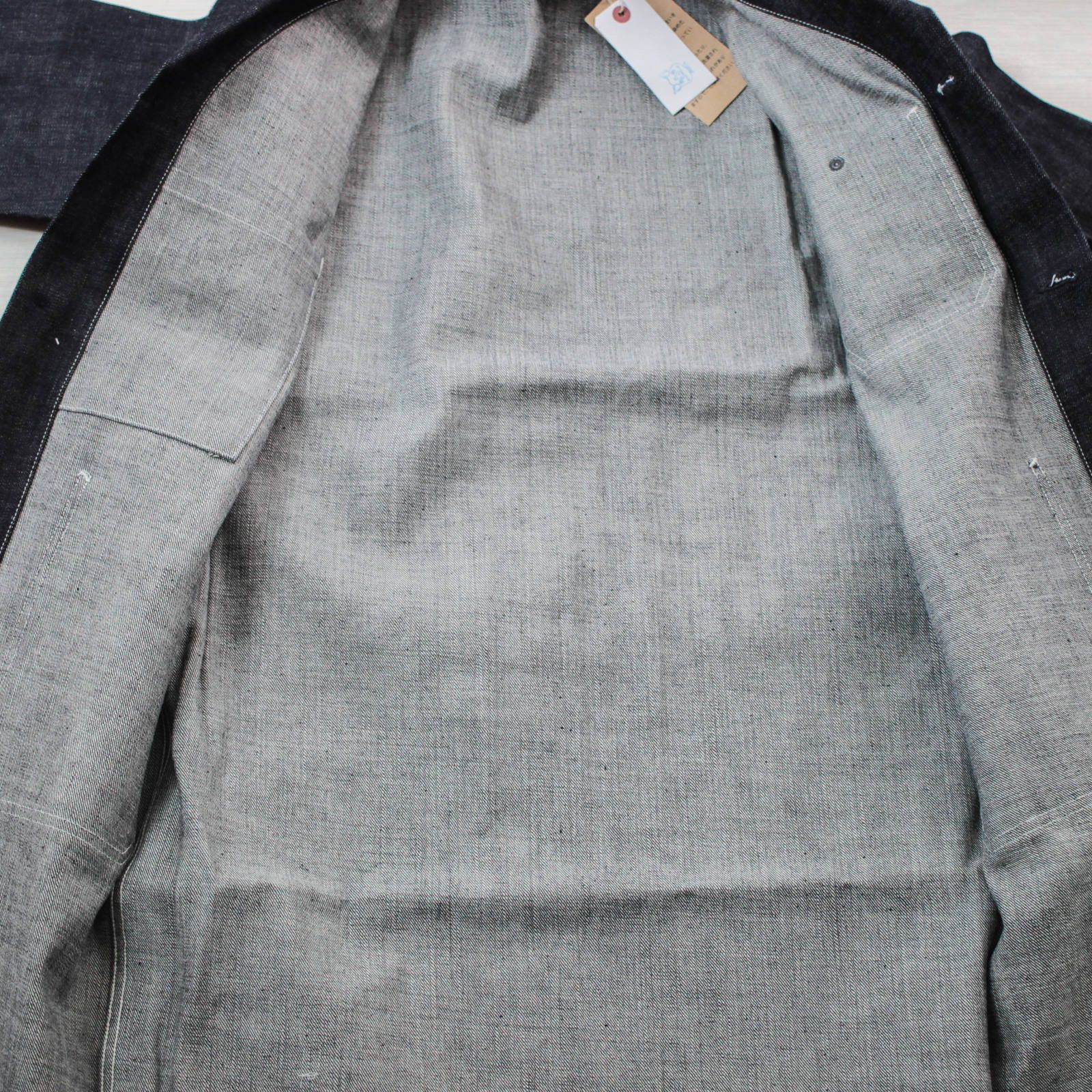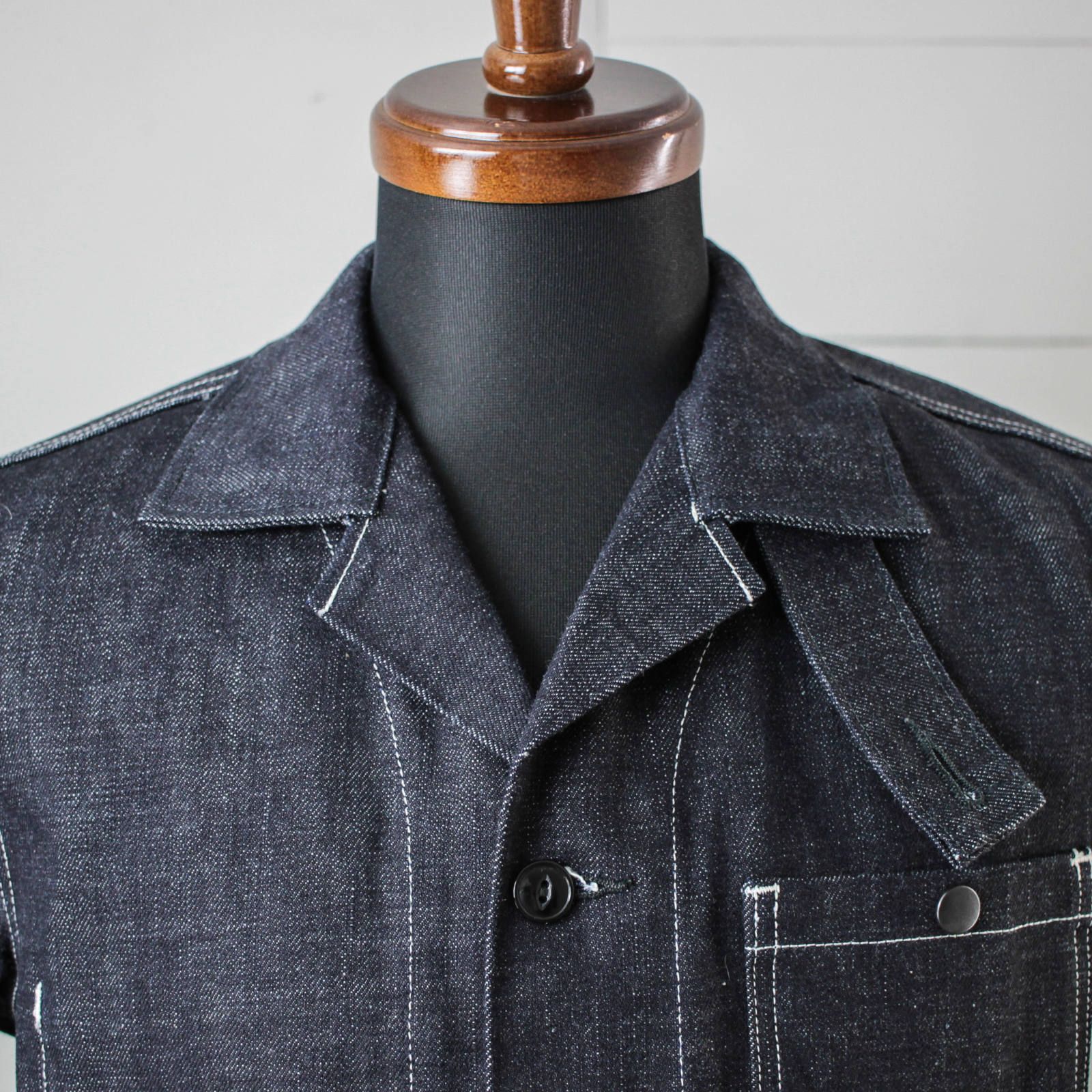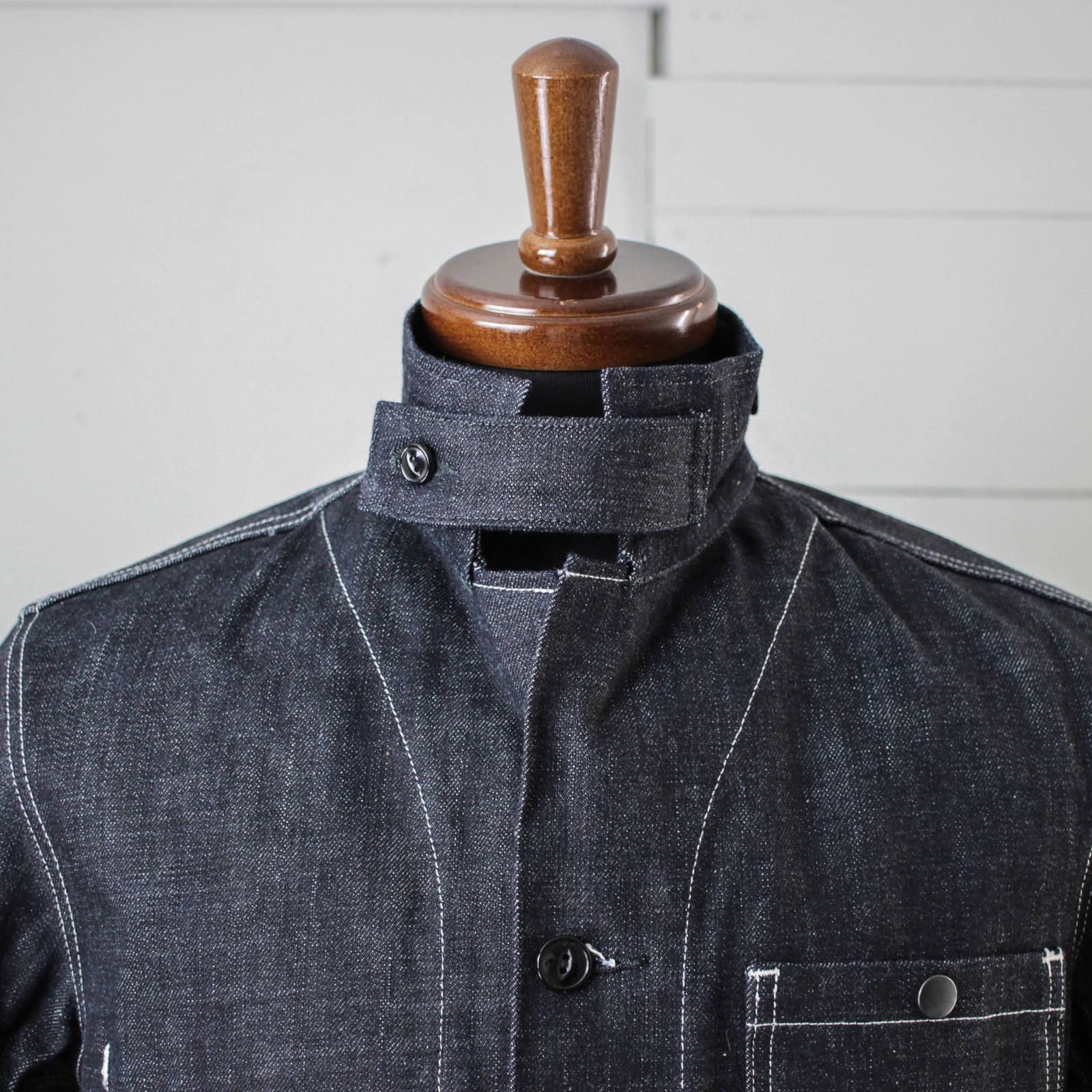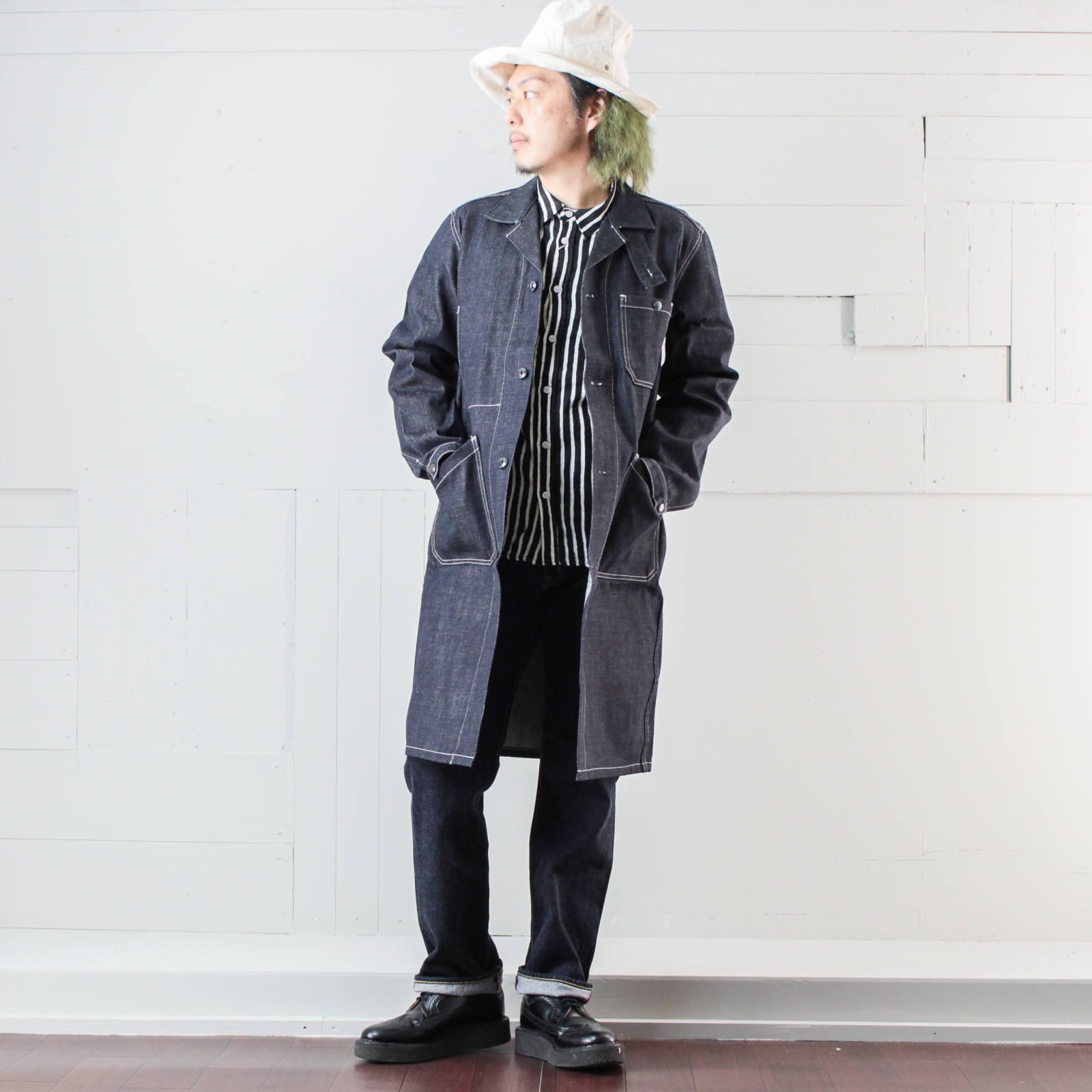 生デニム(ノンウォッシュデニム)を使用してますので、パッリパリの硬いコート。この硬いデニムを柔らかくなるまで着て、徐々に自分色に染め上げていくのが楽しみなアイテムです。