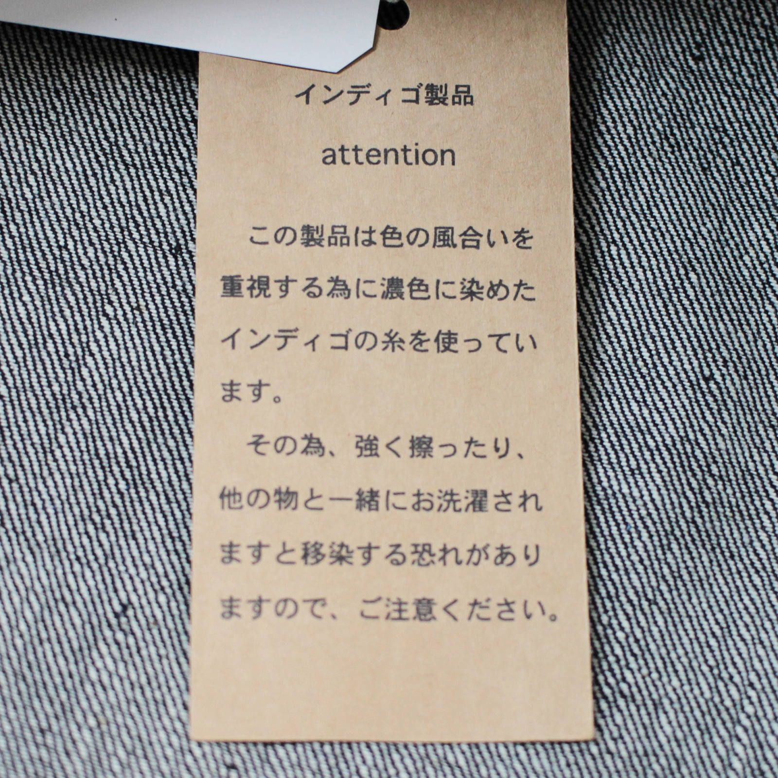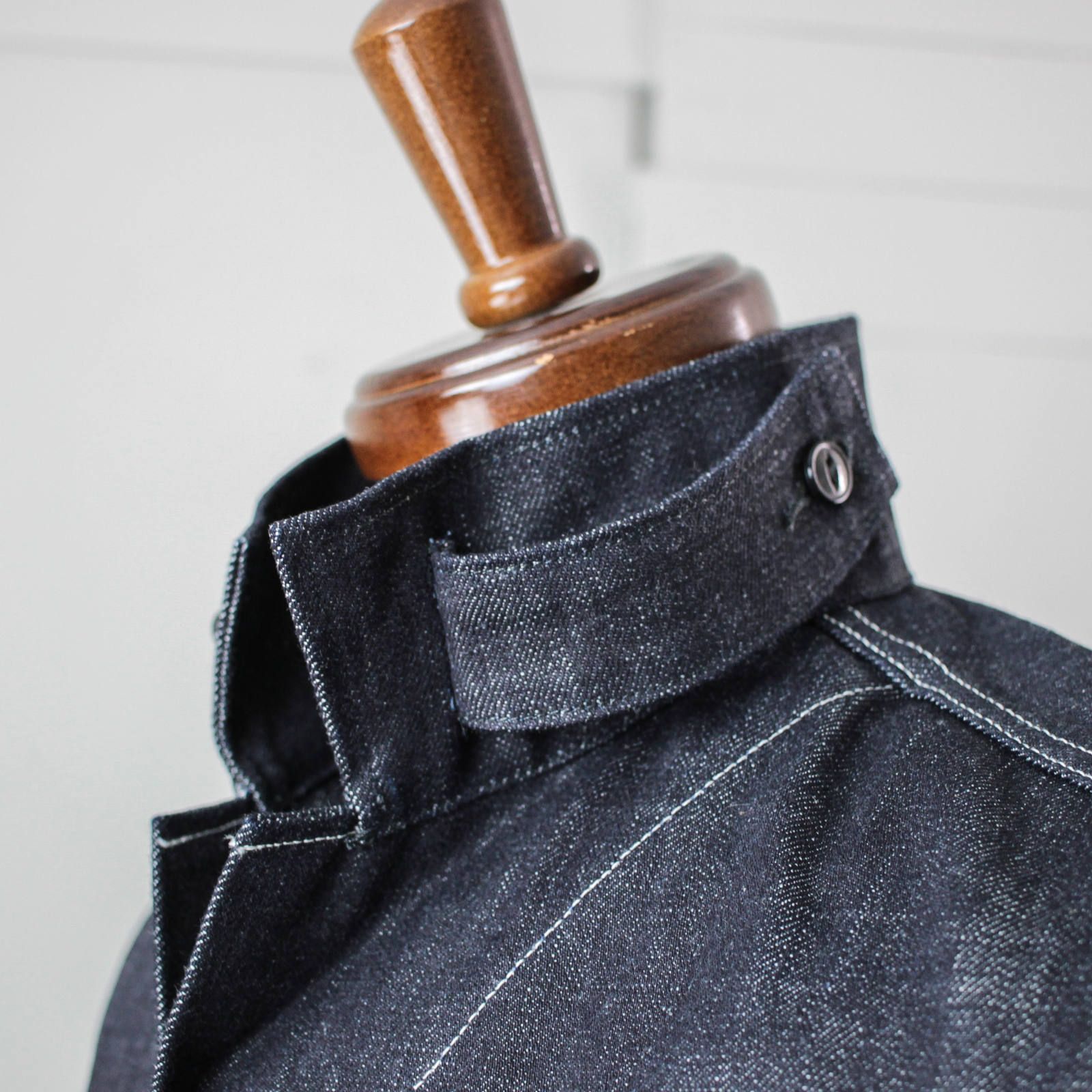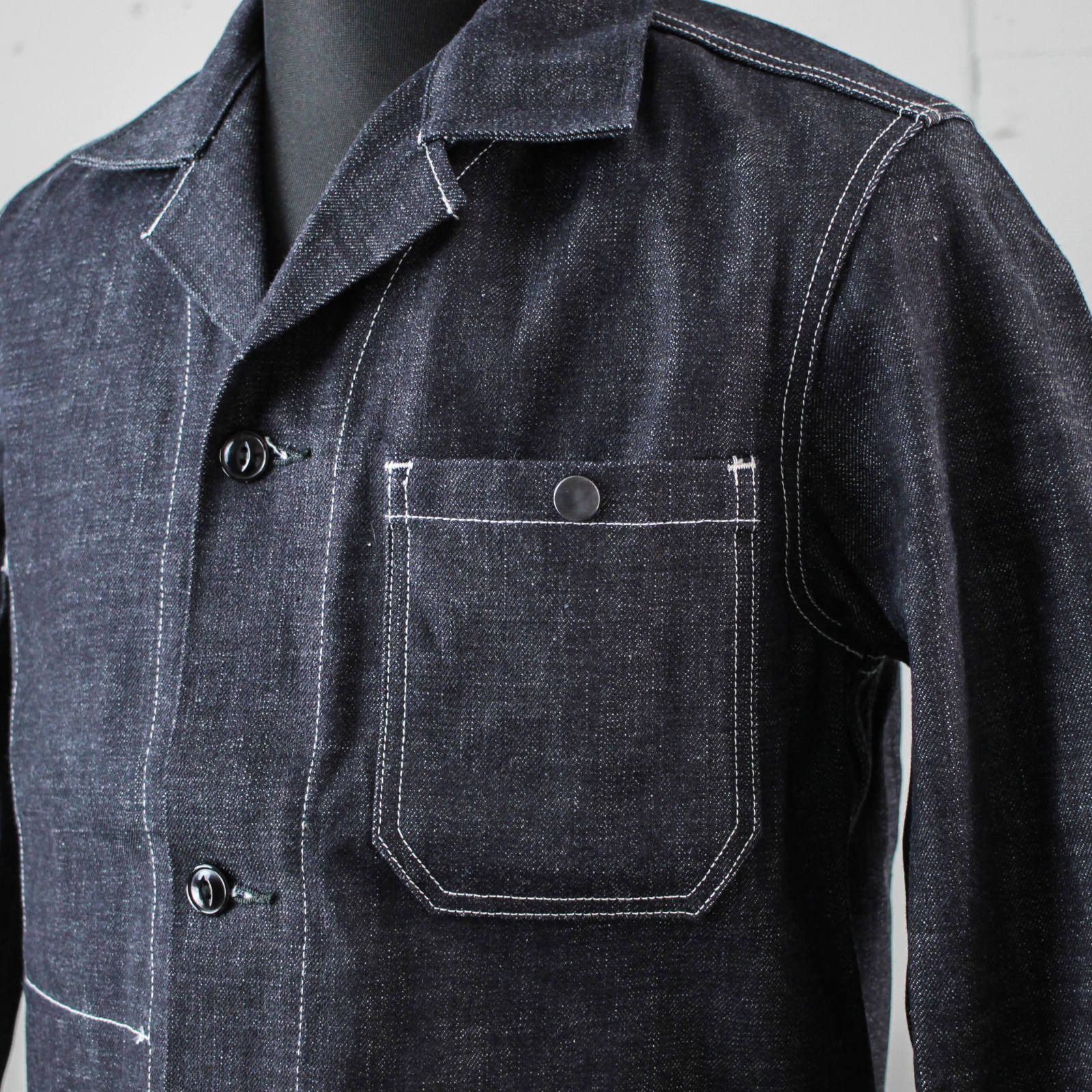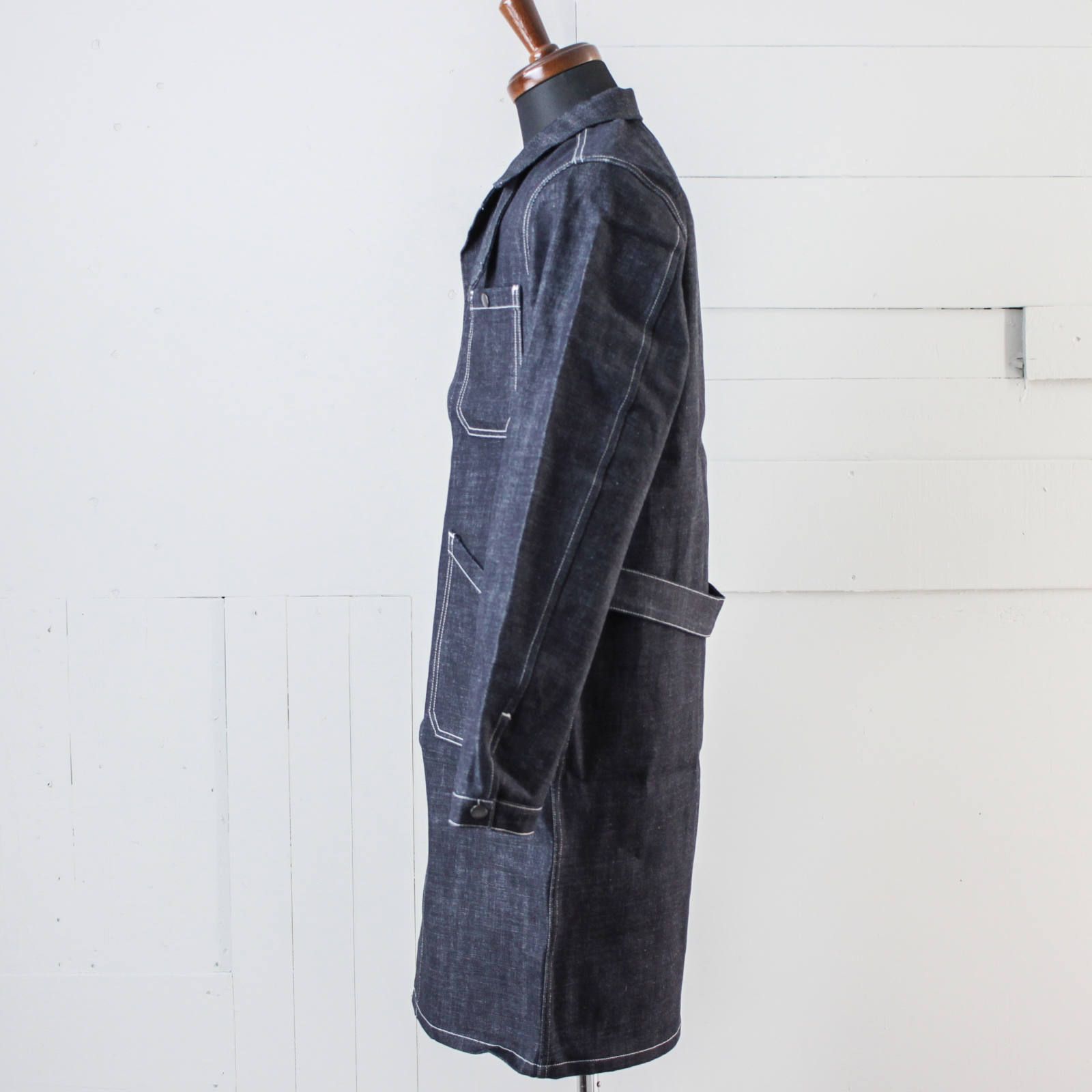 生デニム(ノンウォッシュデニム)を使用してますので、パッリパリの硬いコート。この硬いデニムを柔らかくなるまで着て、徐々に自分色に染め上げていくのが楽しみなアイテムです。