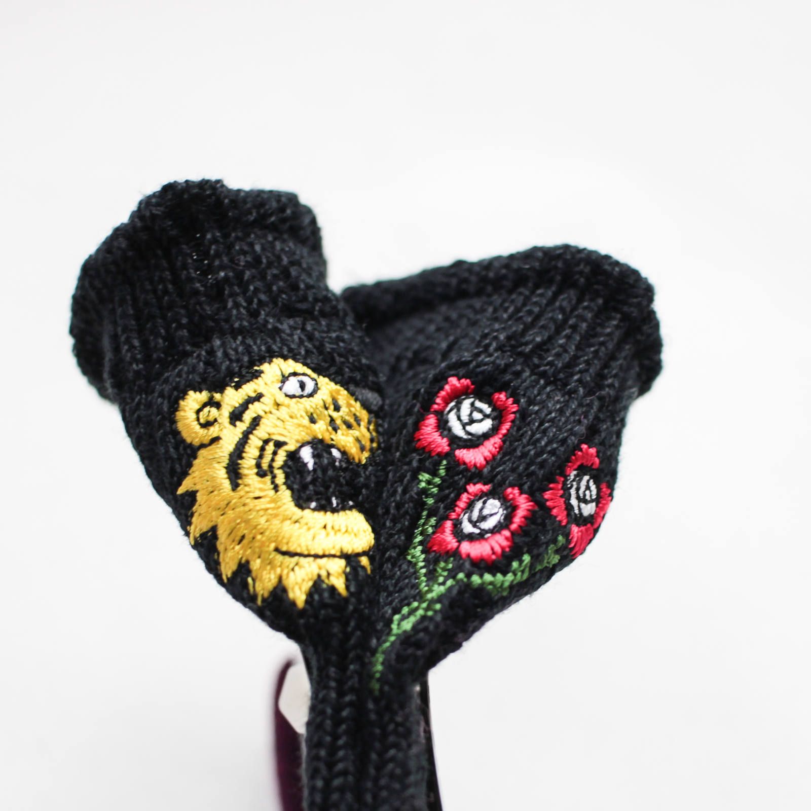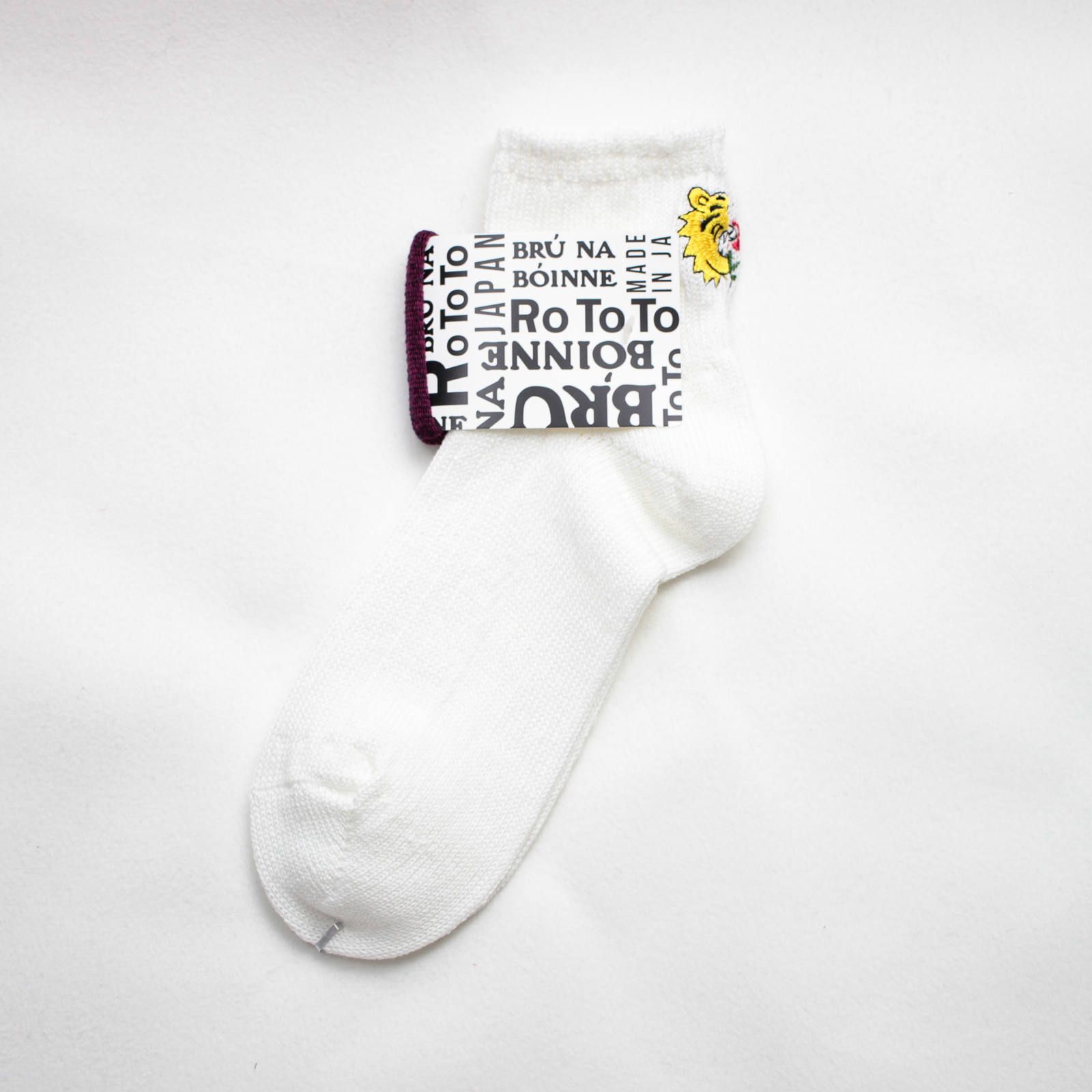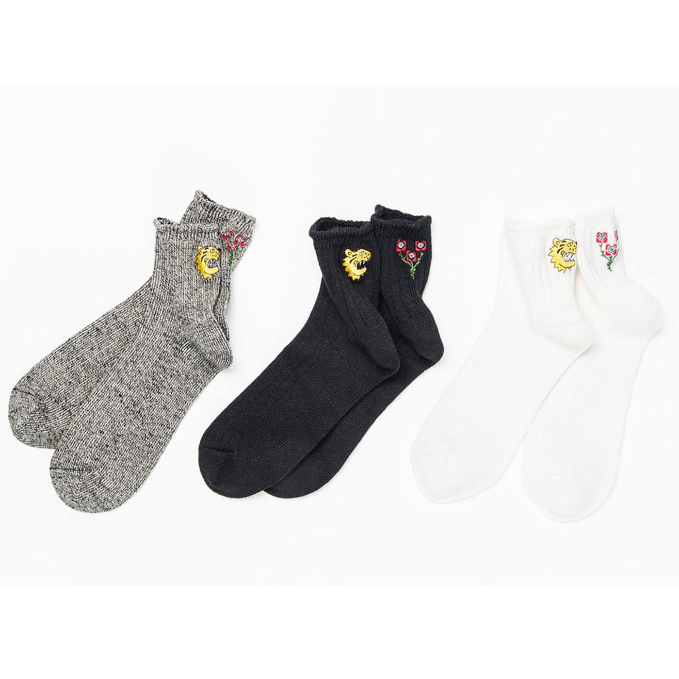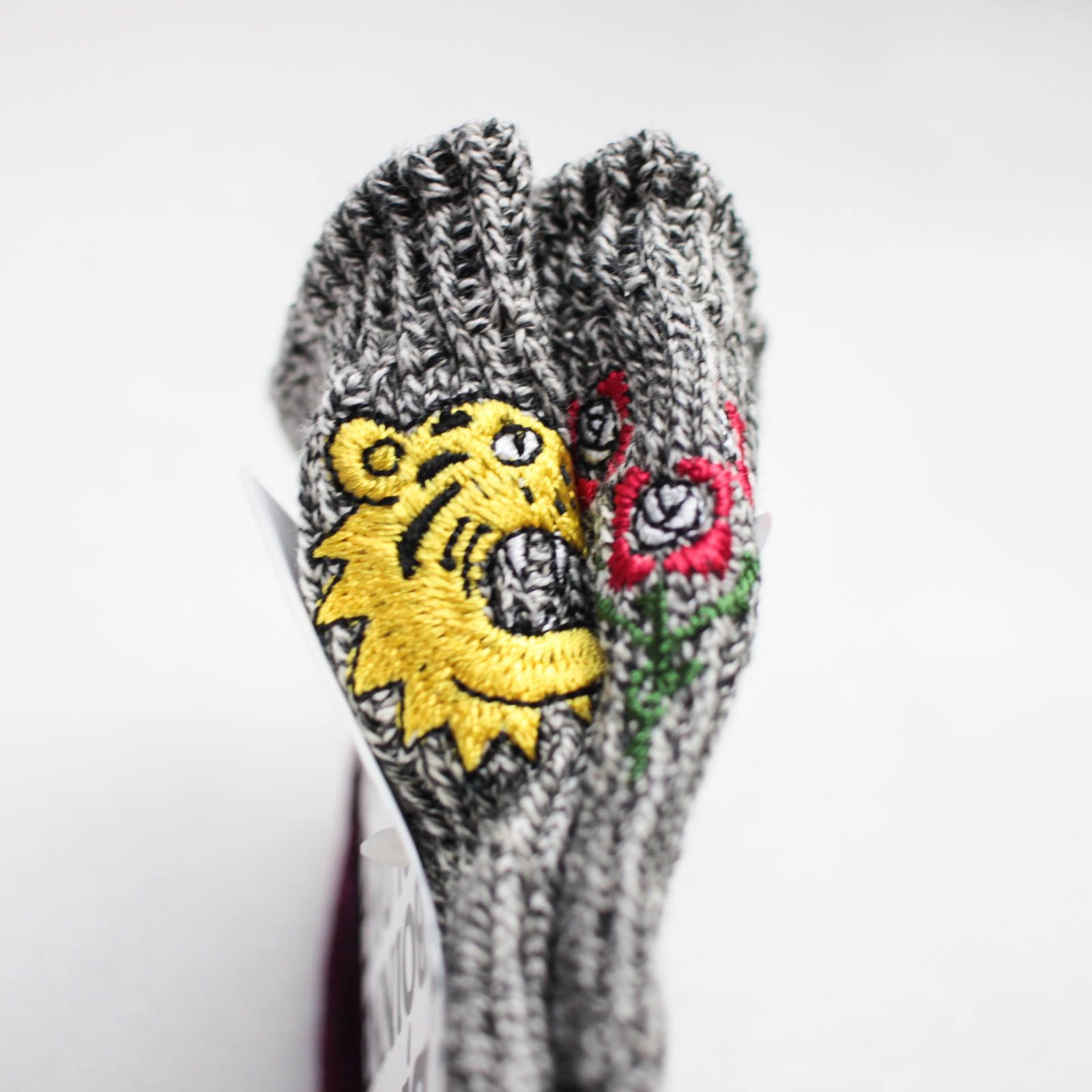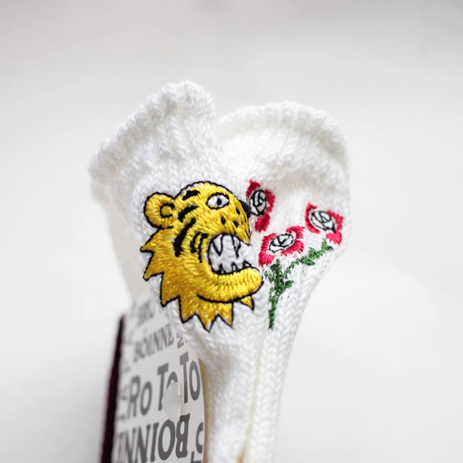 何とも言えない絶妙な表情の虎と薔薇の刺繍デザインに心奪われるコットンリネンソックス。