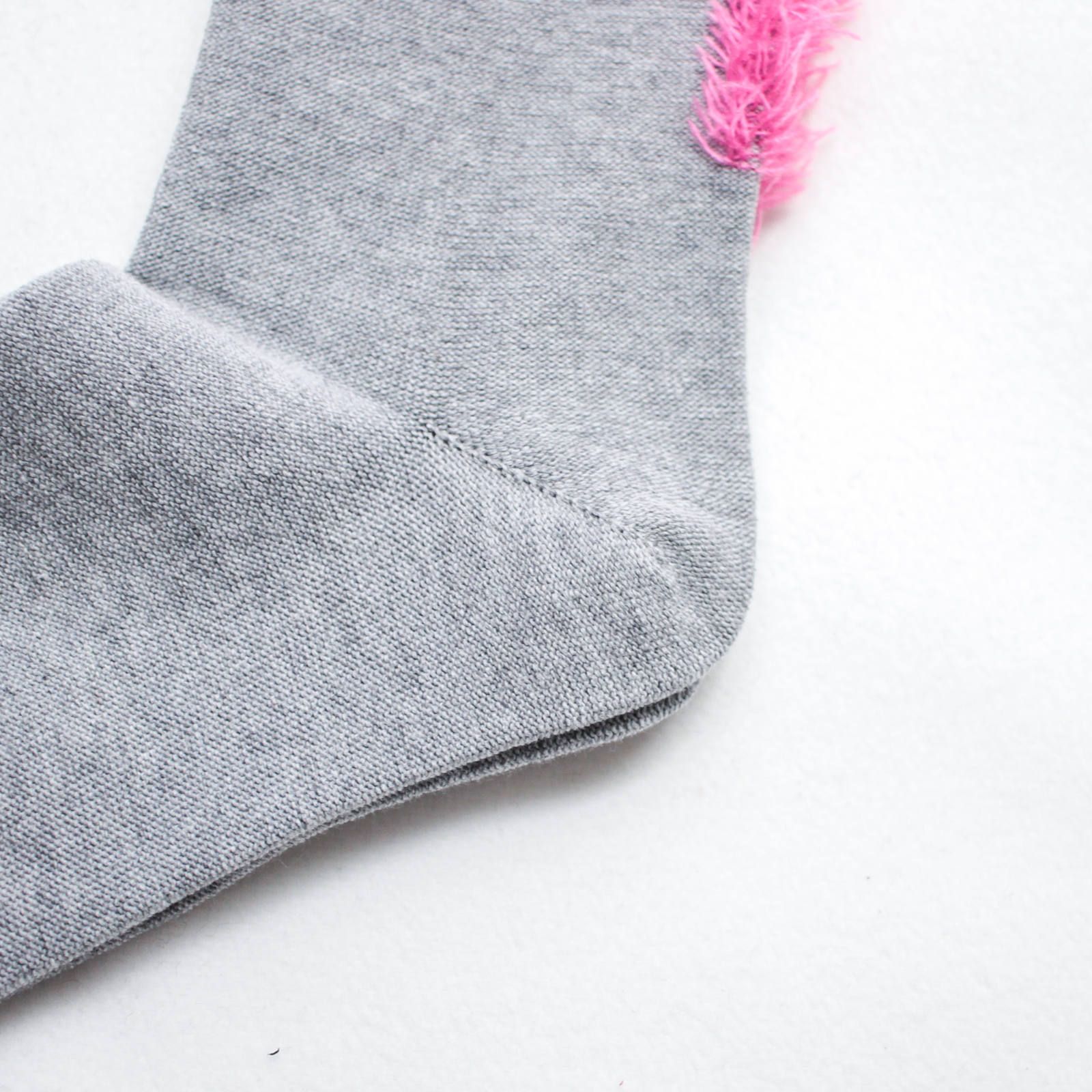 フクラハギからカカト上までワシャワシャっと毛足の長い糸でモヒカンをイメージしてデザインされた靴下。これまでに無かった新型です!