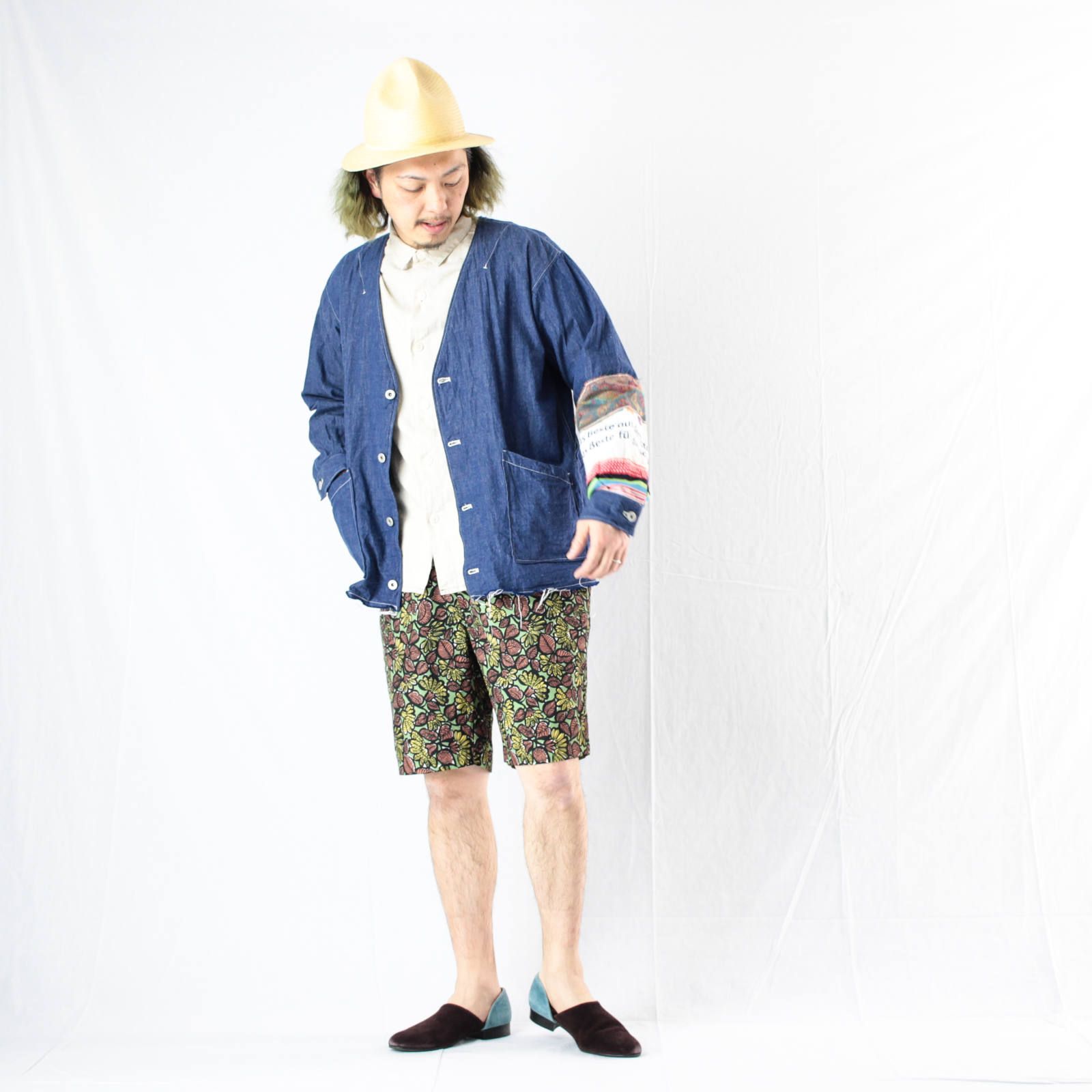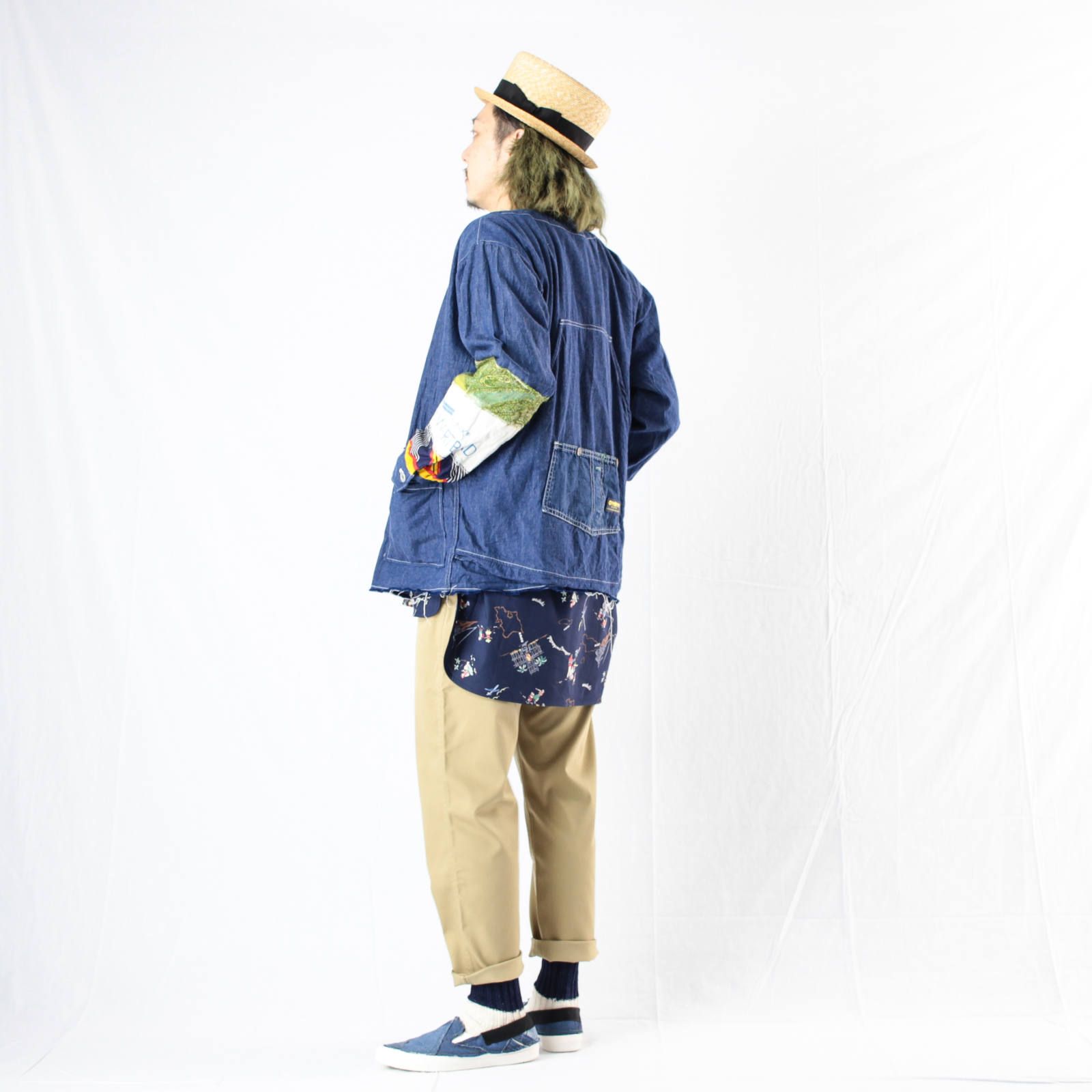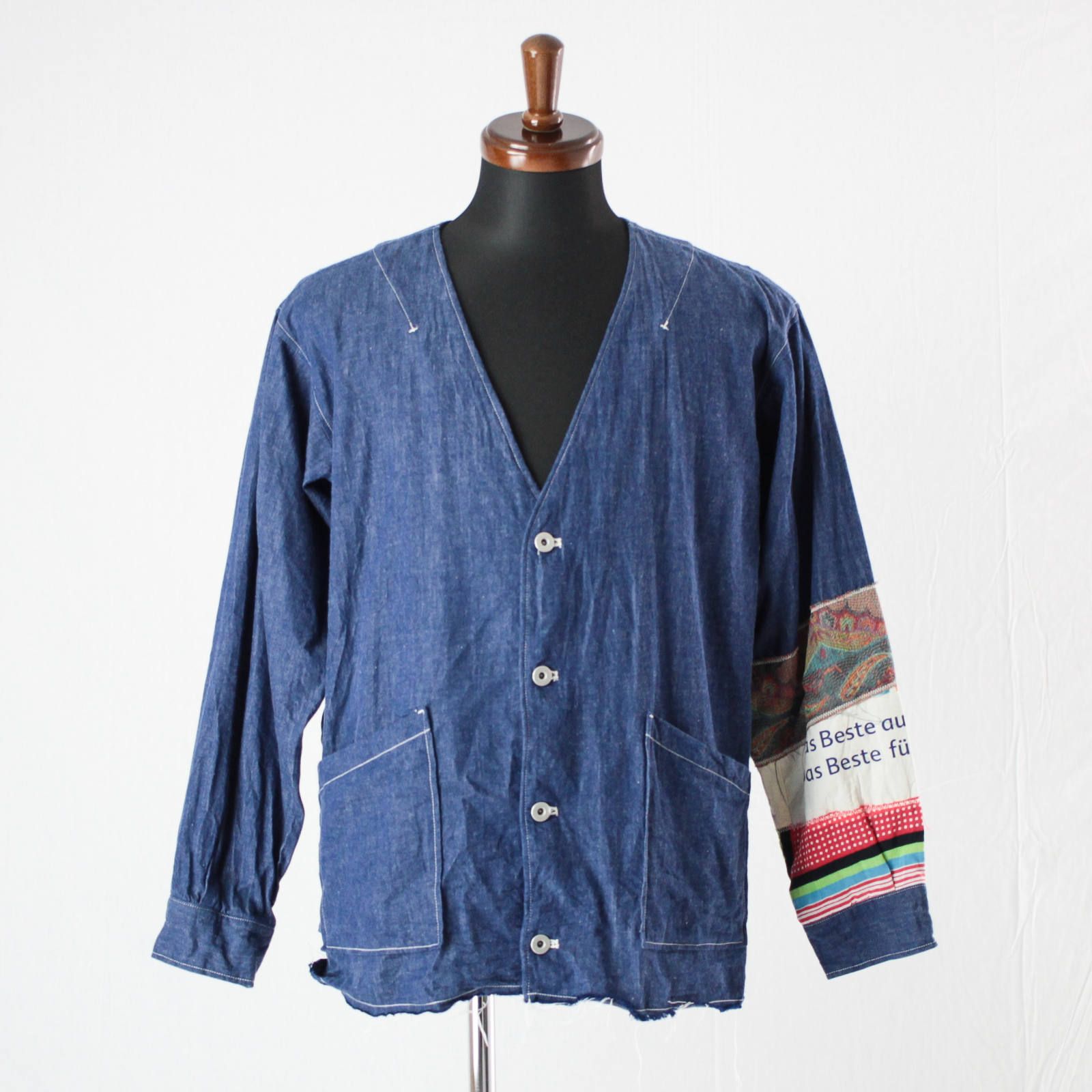 masterkeyとのコラボアイテムは、デニムカーディガン。薄手のデニムカーディガンをベースに、左袖のみ古着のパッチワーク仕様に。全て違う1点物です!