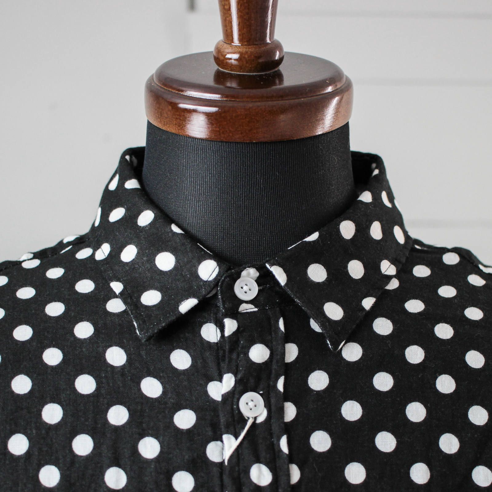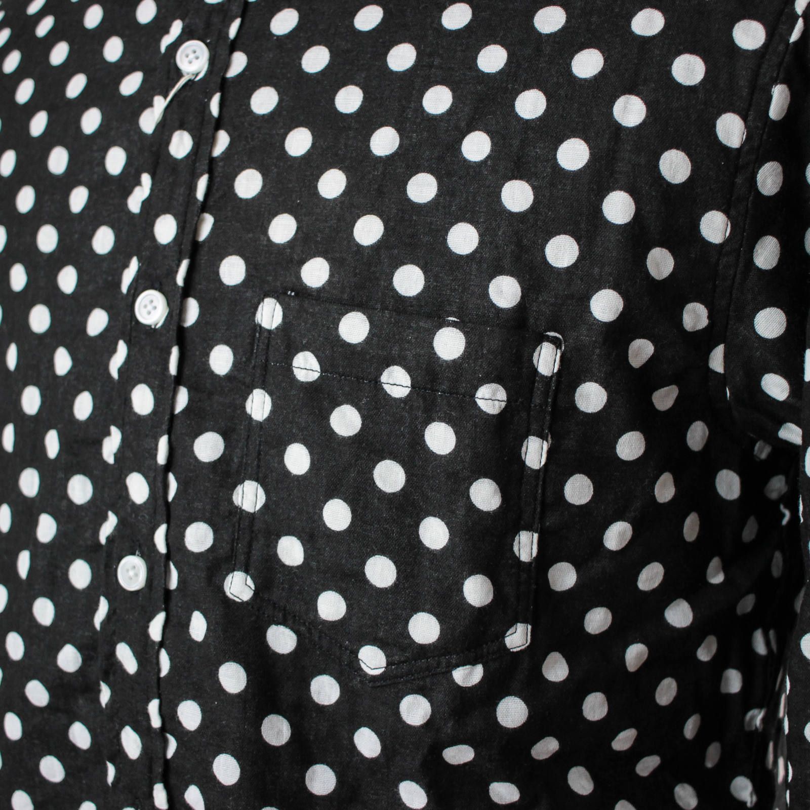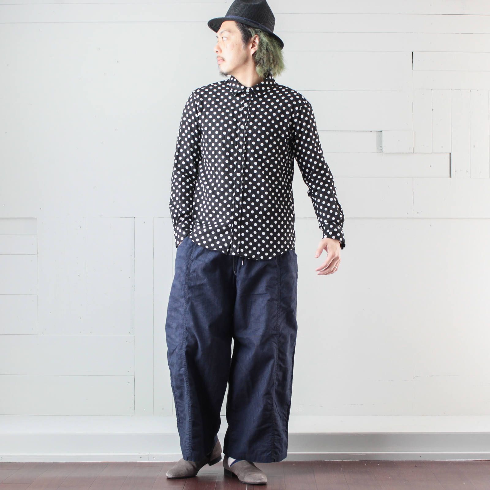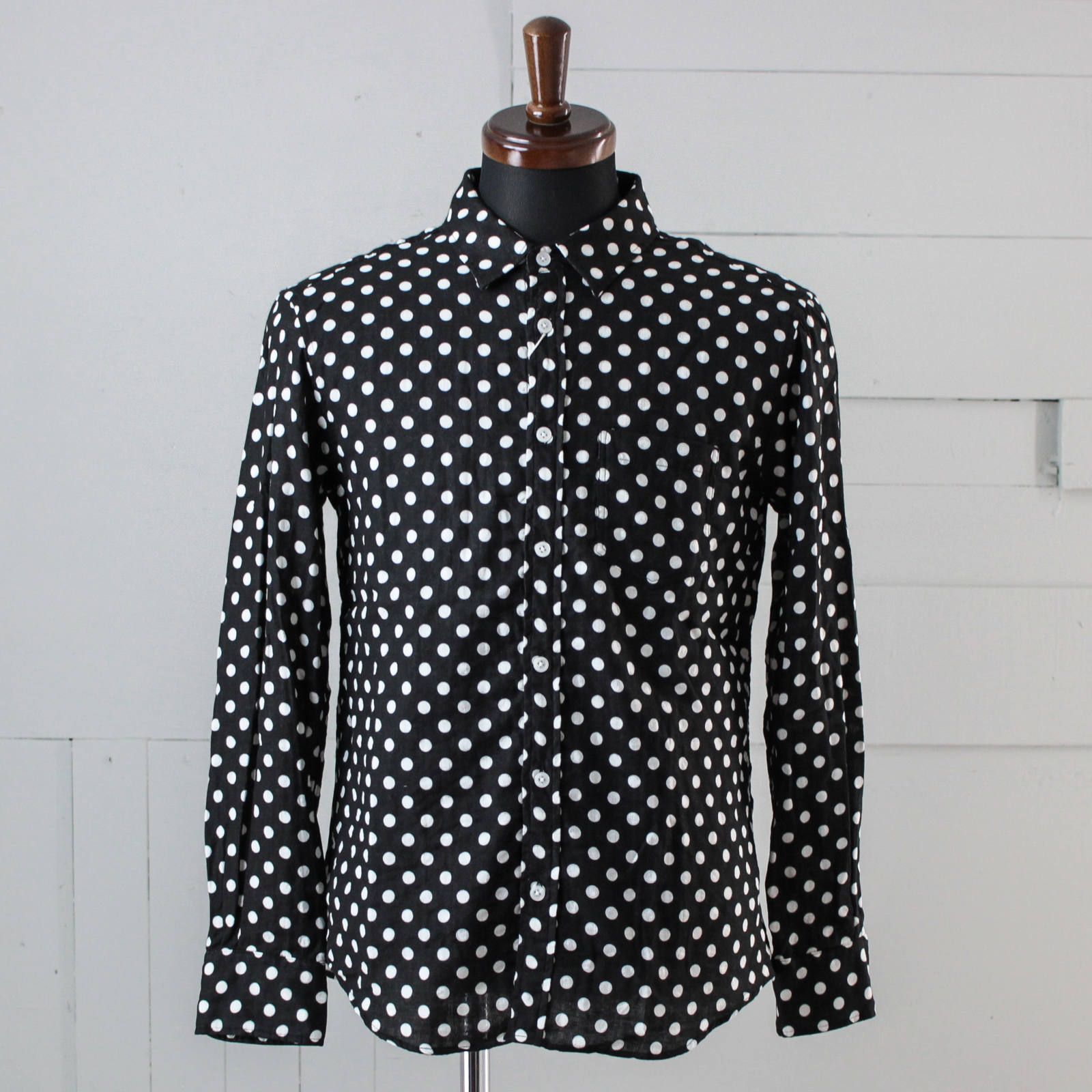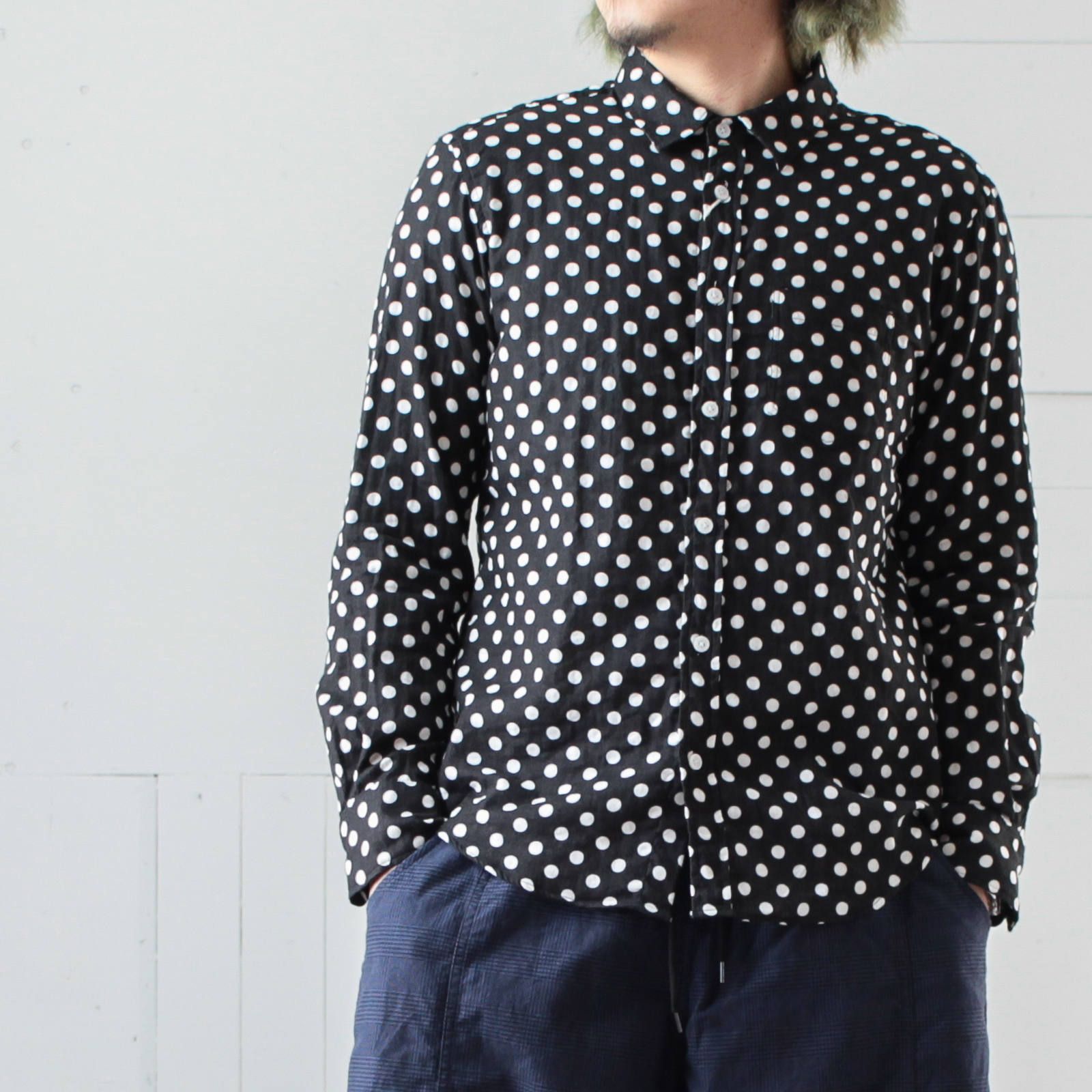 襟はレギュラーカラー、ポケットは胸ポケットのみと至ってシンプルな作りですが、総ドット柄とガーゼ生地の風合いで雰囲気のある仕上がりとなっています。