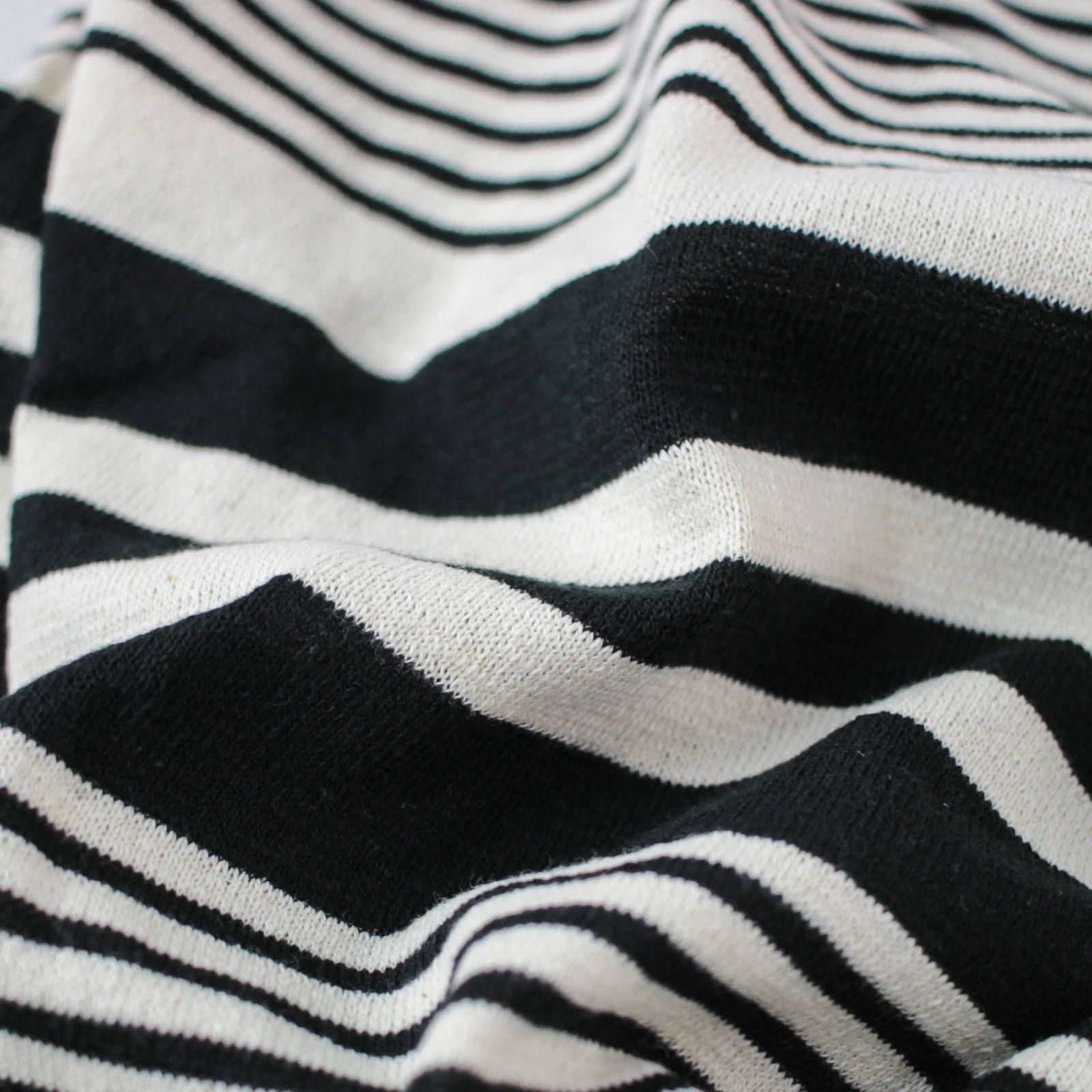 縞の幅がランダムなボーダーと、パイル編みの様なウォーム感のある生地が特徴です。
