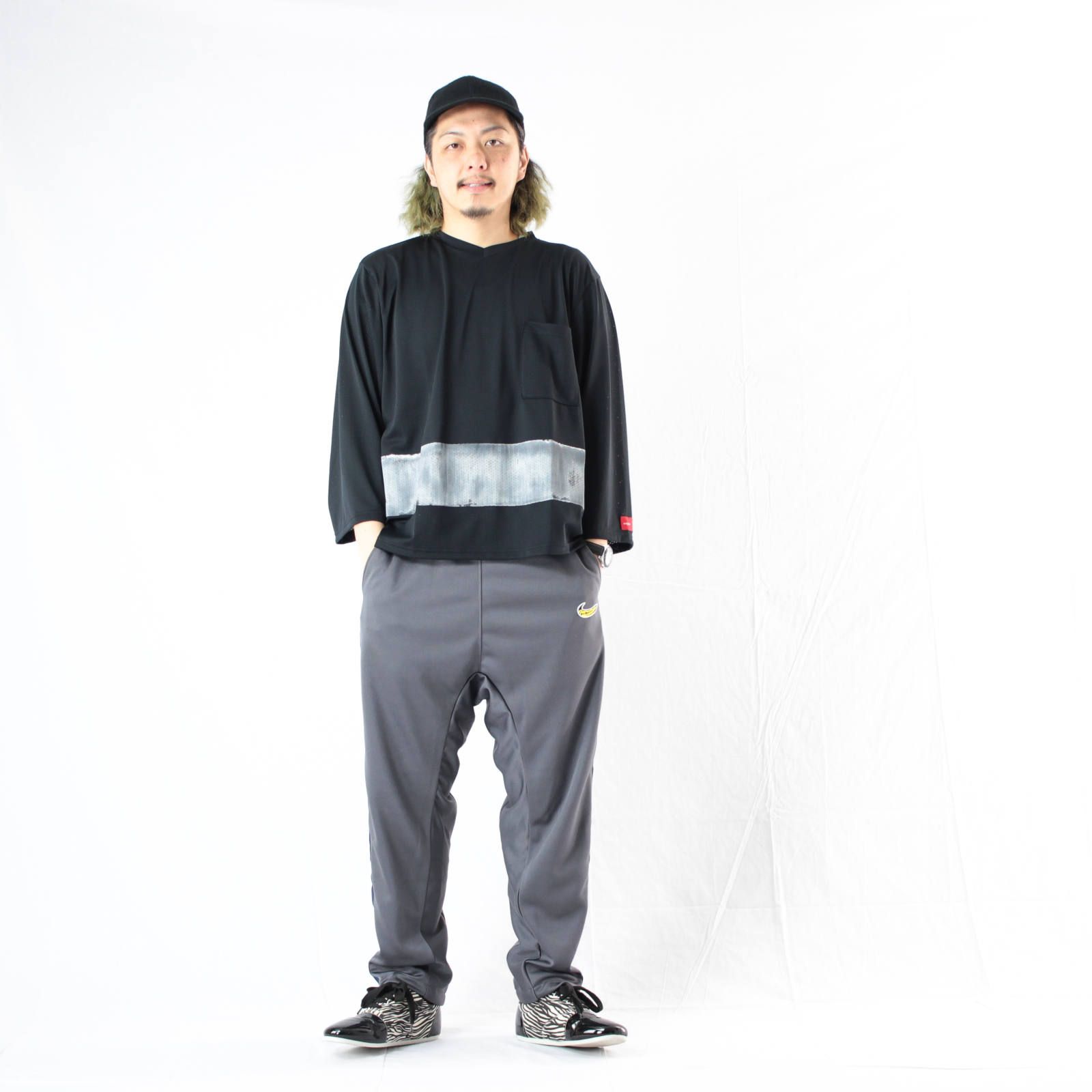 首回りはクルーネックに近い、極浅のVネック。この浅いVネックは珍しいですね。お腹部分に入ったラインは、1点1点手作業でペイントされ、ムラ感の有る仕上がりに。