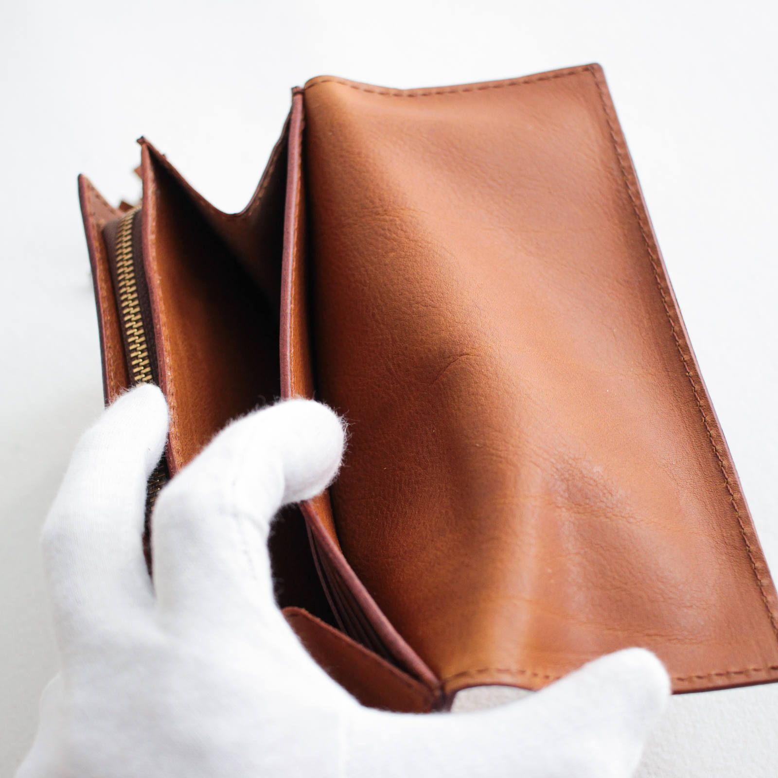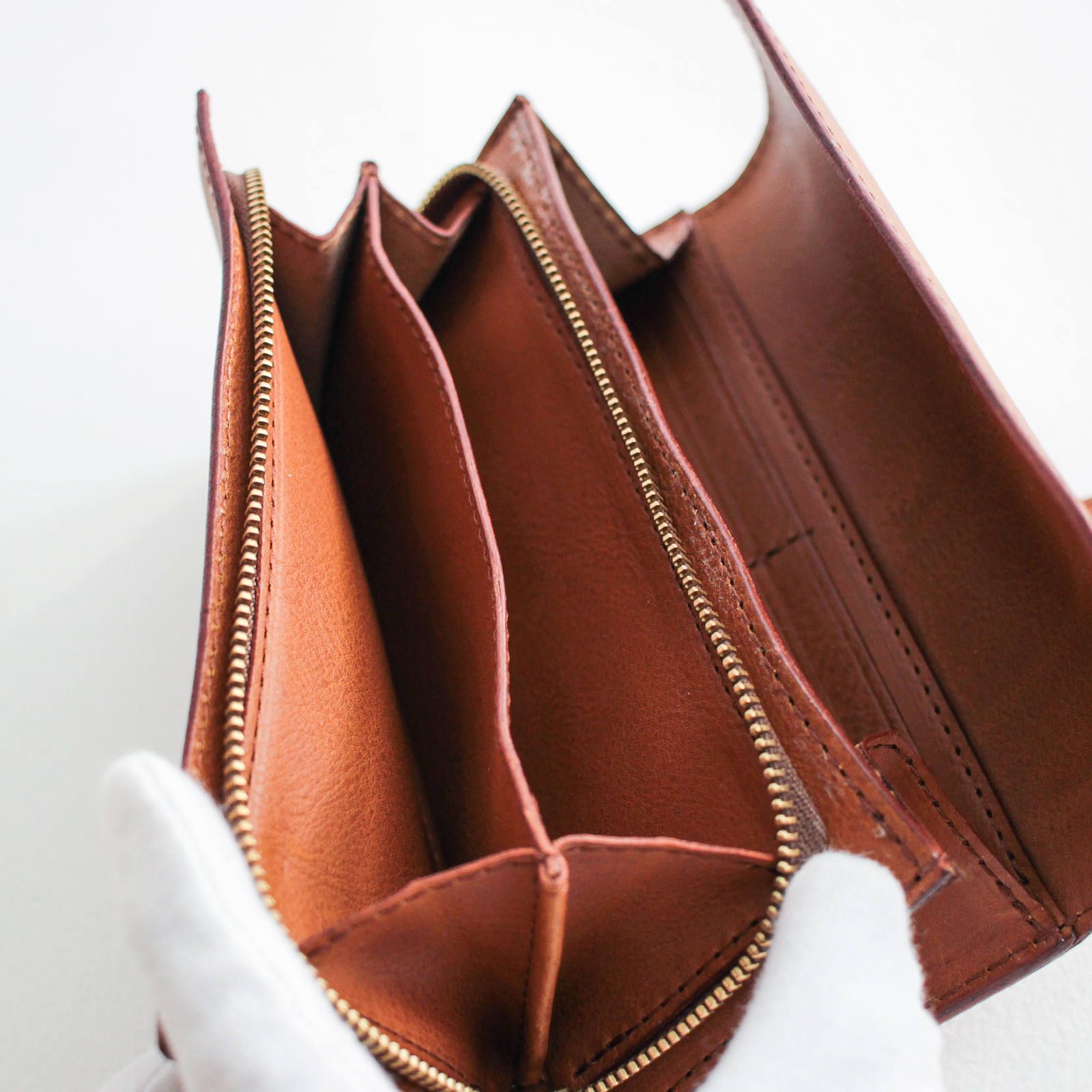 この財布の人気の秘密は、デザインはもちろんその使い勝手の良さと耐久性にあります。どこを見ても表革が出るように通常の倍の量の革を使い、革を貼り合わせて作られています。そのため少し重いですが抜群の耐久力で、柔らかい革でも型崩れや破れ等が出にくくなっています。