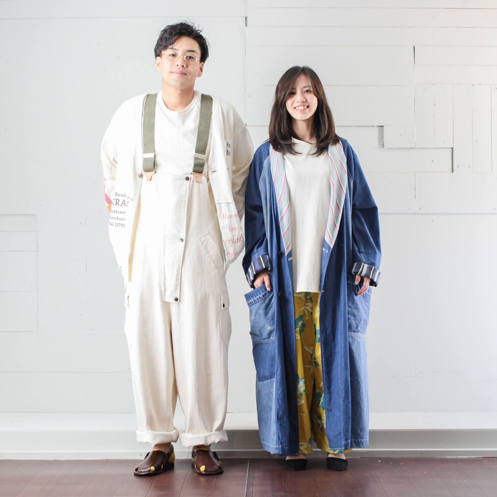 右袖、胸ポケット、お腹から下部分がエコバッグ生地に。ボタンは一つで、このボタンもヴィンテージのボタンを使用し、1点1点表情が異なります!