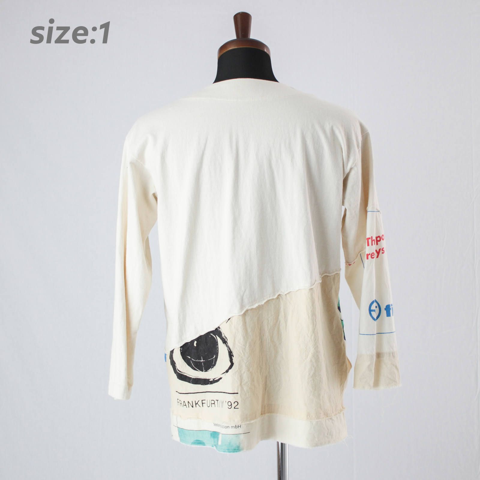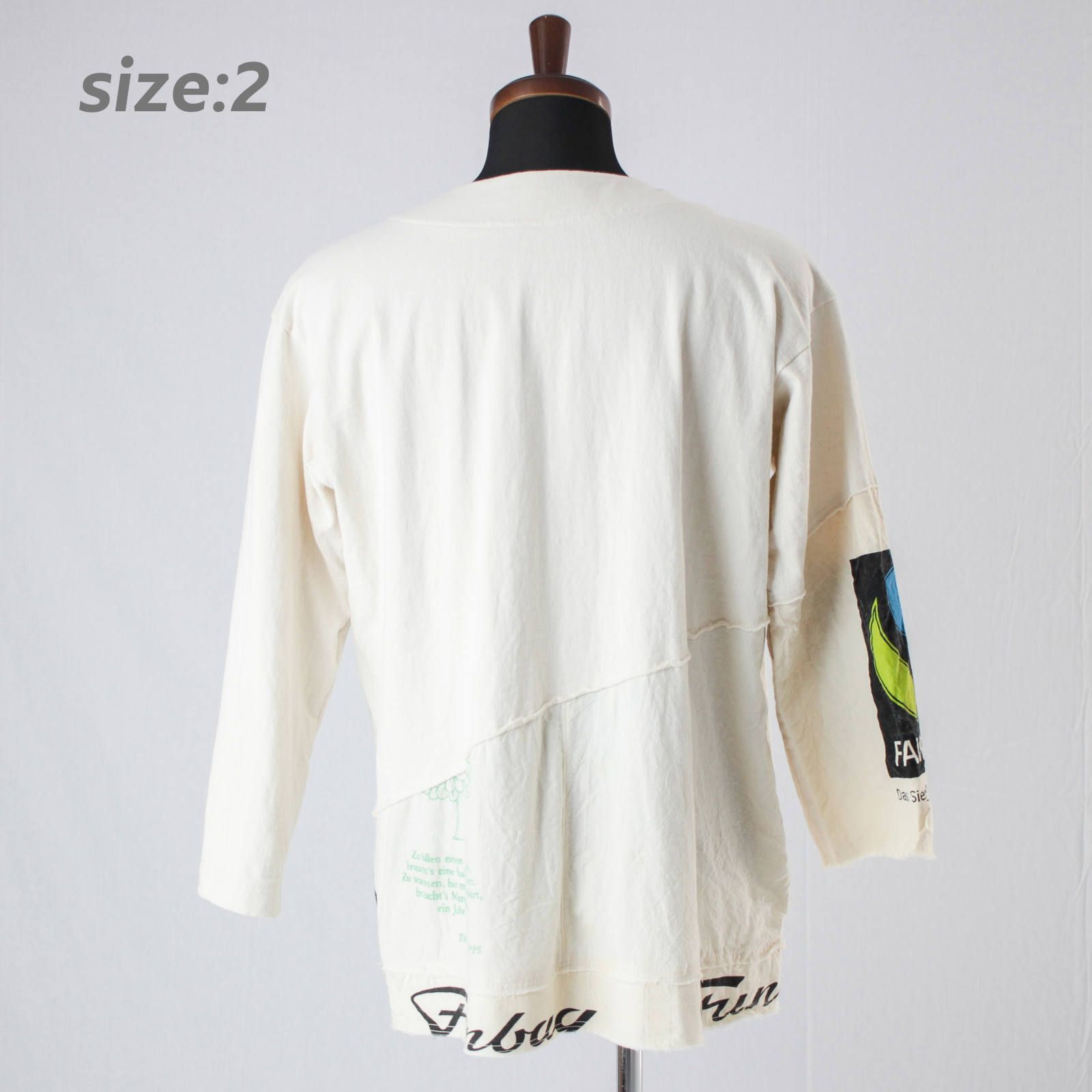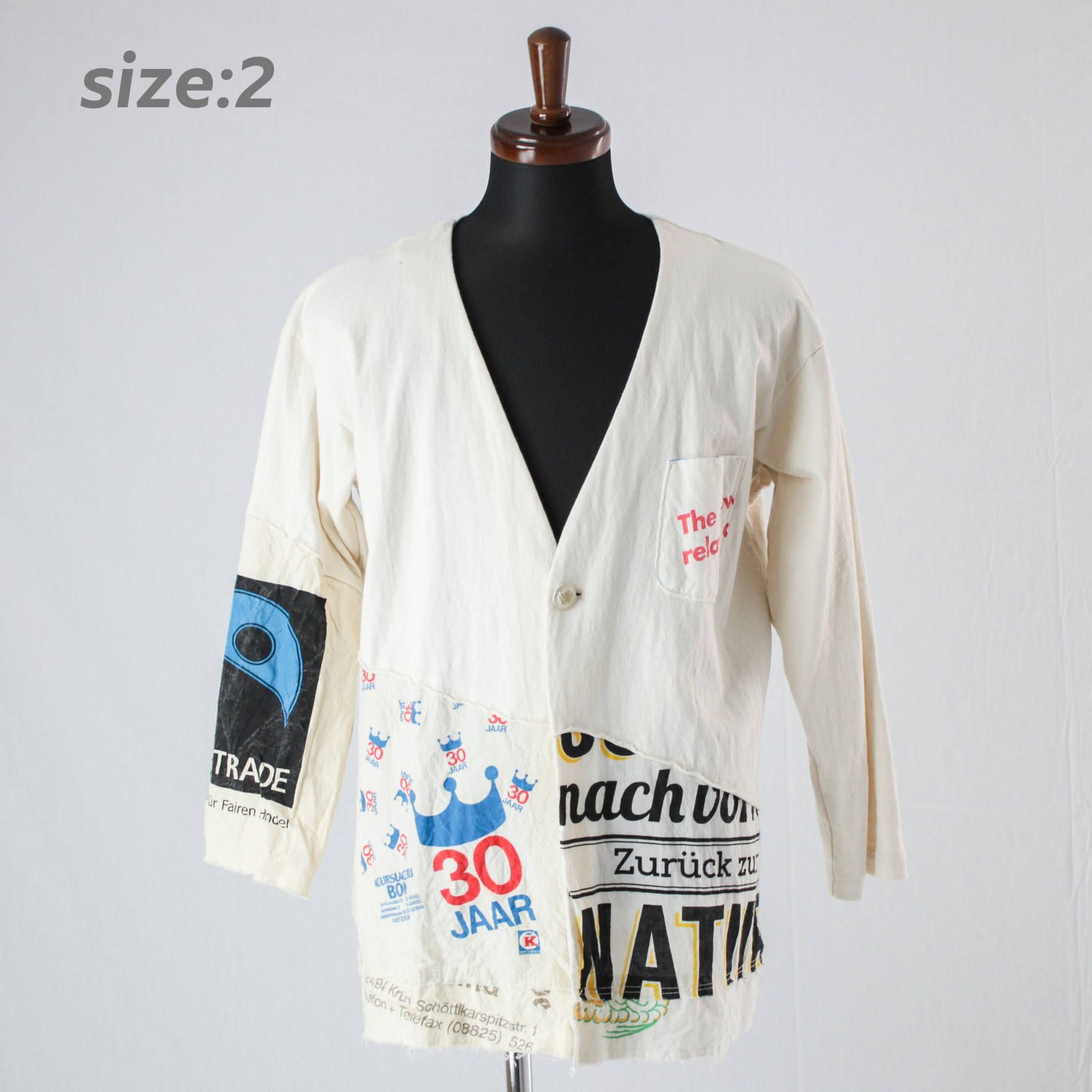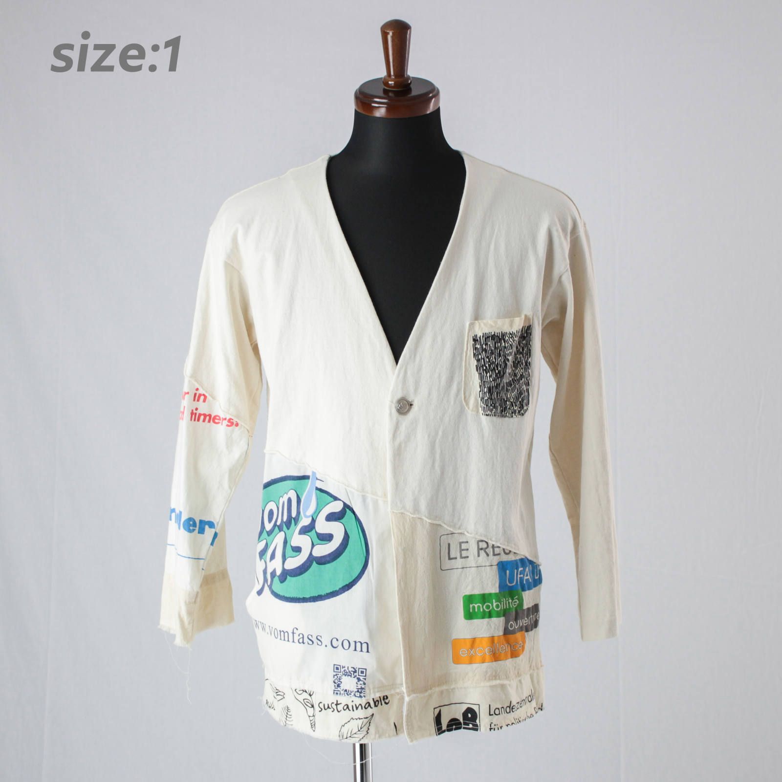 エコバッグを解体した生地と度詰め天竺生地を使用し、カーディガンとして再構築されたアイテム。お腹部分での斜めの切り替えが面白いアイテムです。