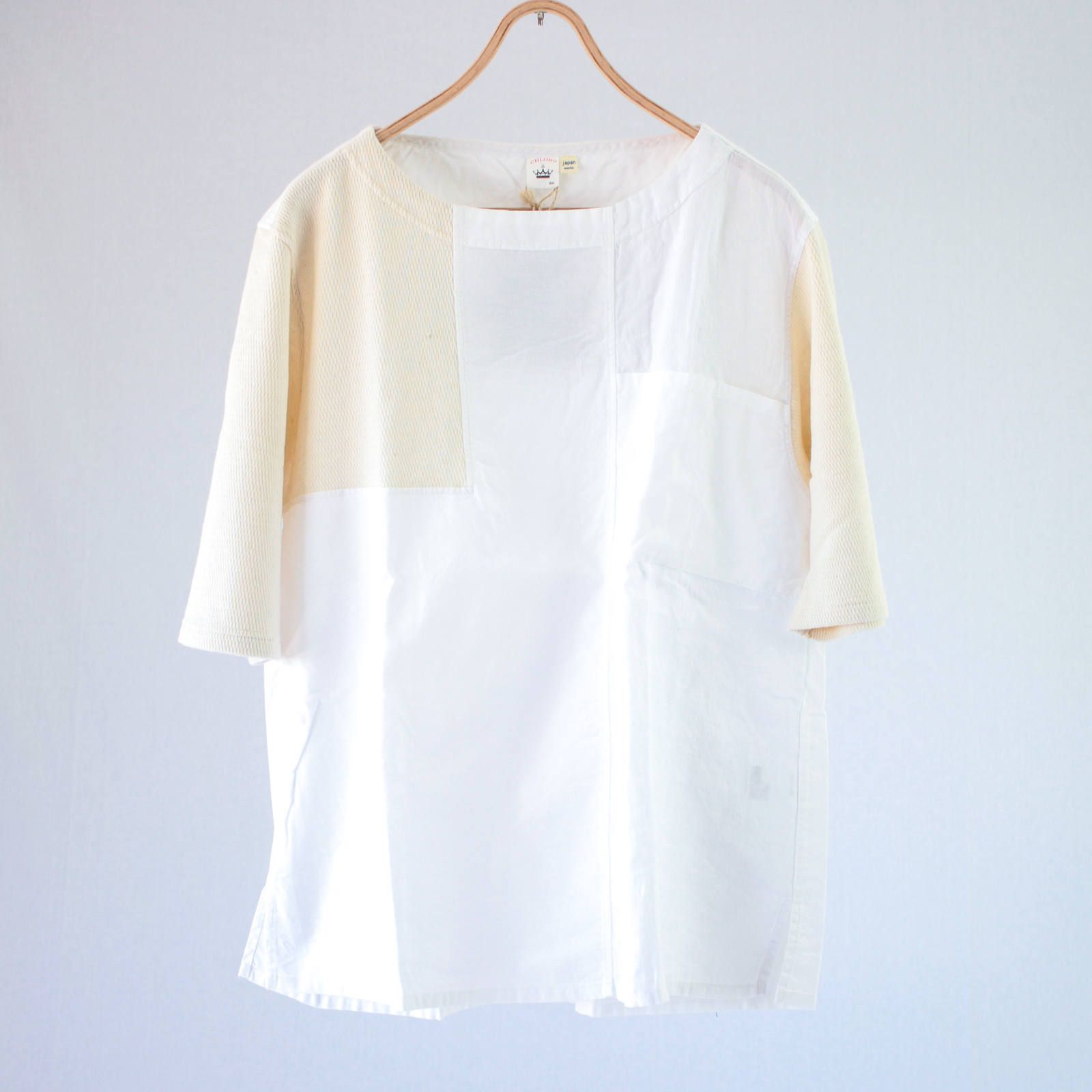 パッチワークデザインのボートネックTシャツ。1枚でサマになるデザインが◎