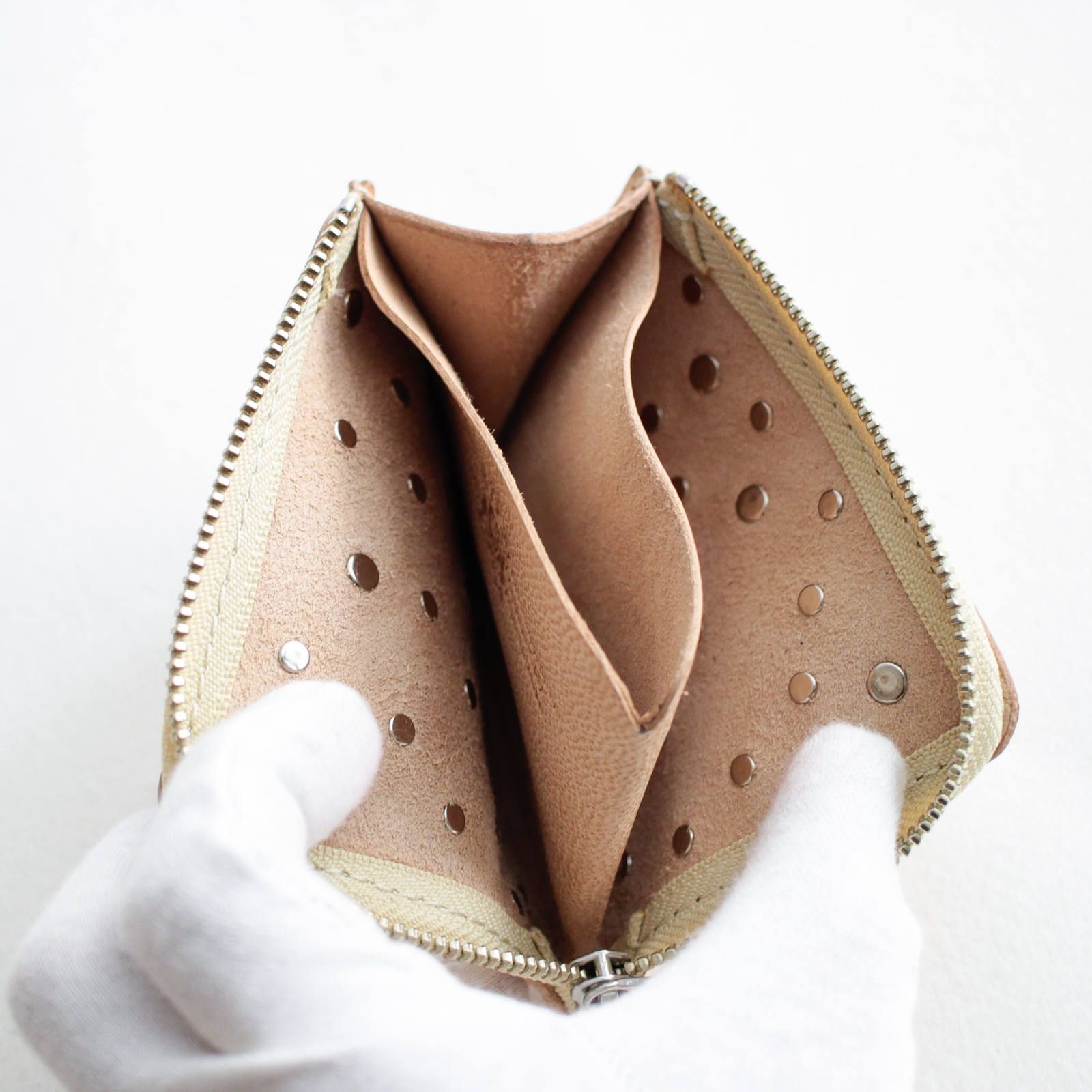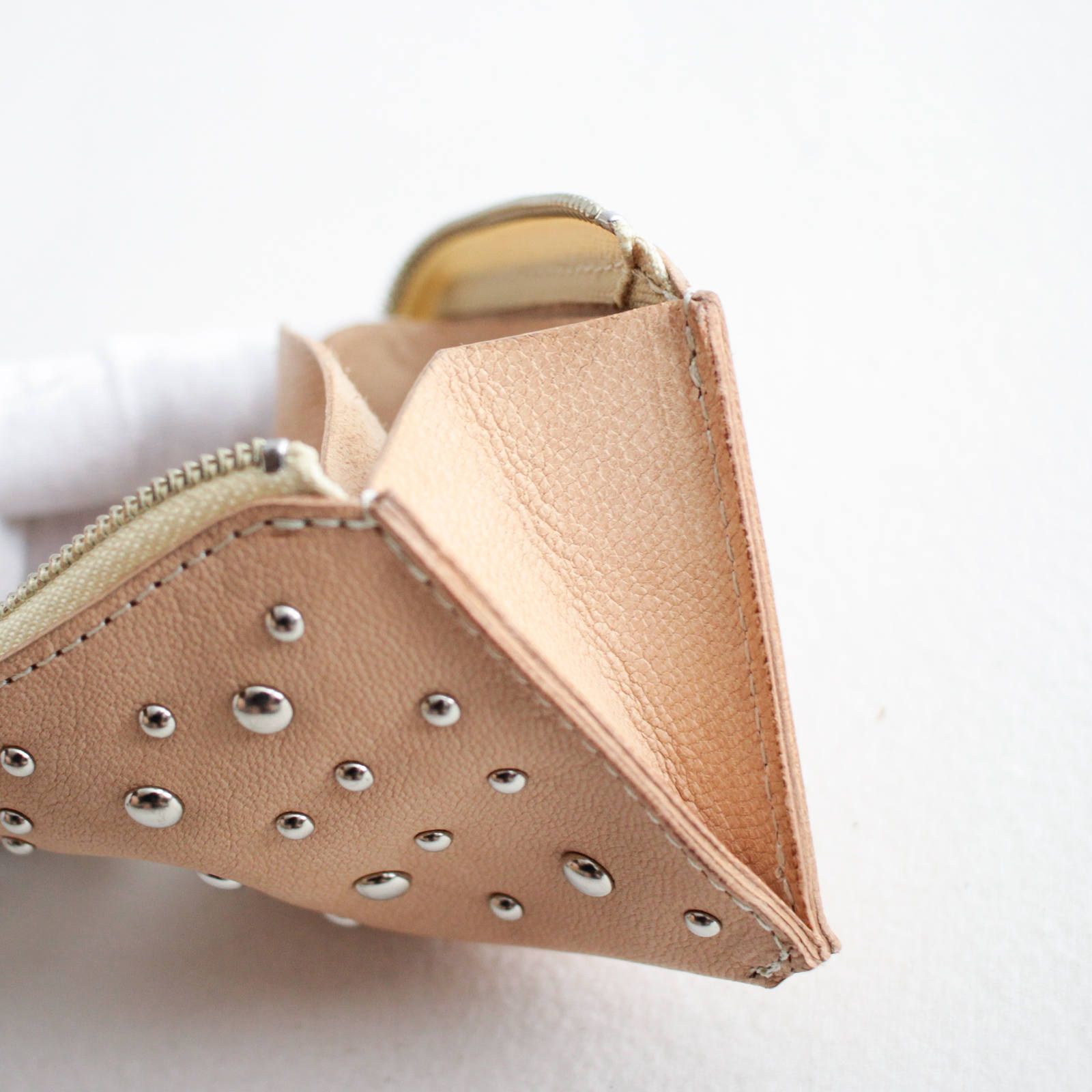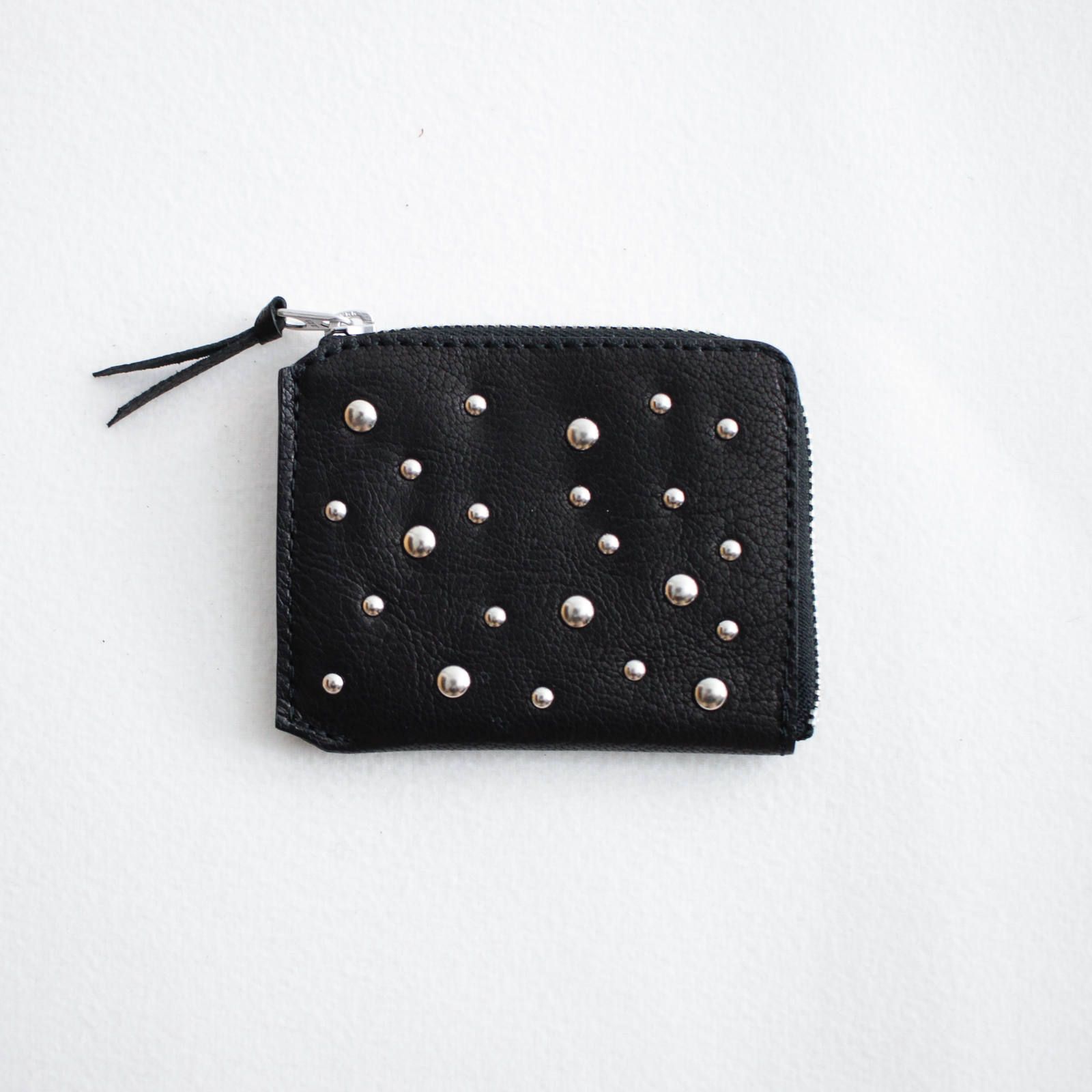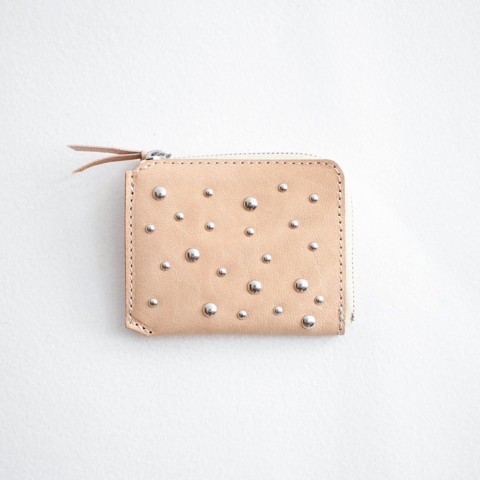 ポケットにスッと入る小さなサイフ。大小ランダムに打ち付けられたカシメ(丸い装飾)がGOODデザイン!