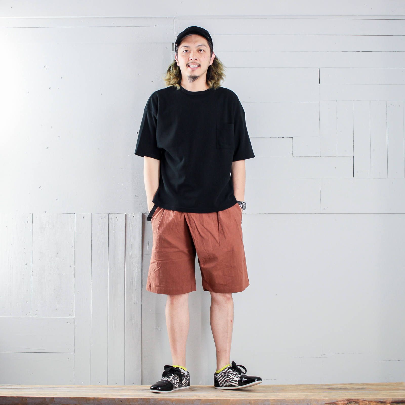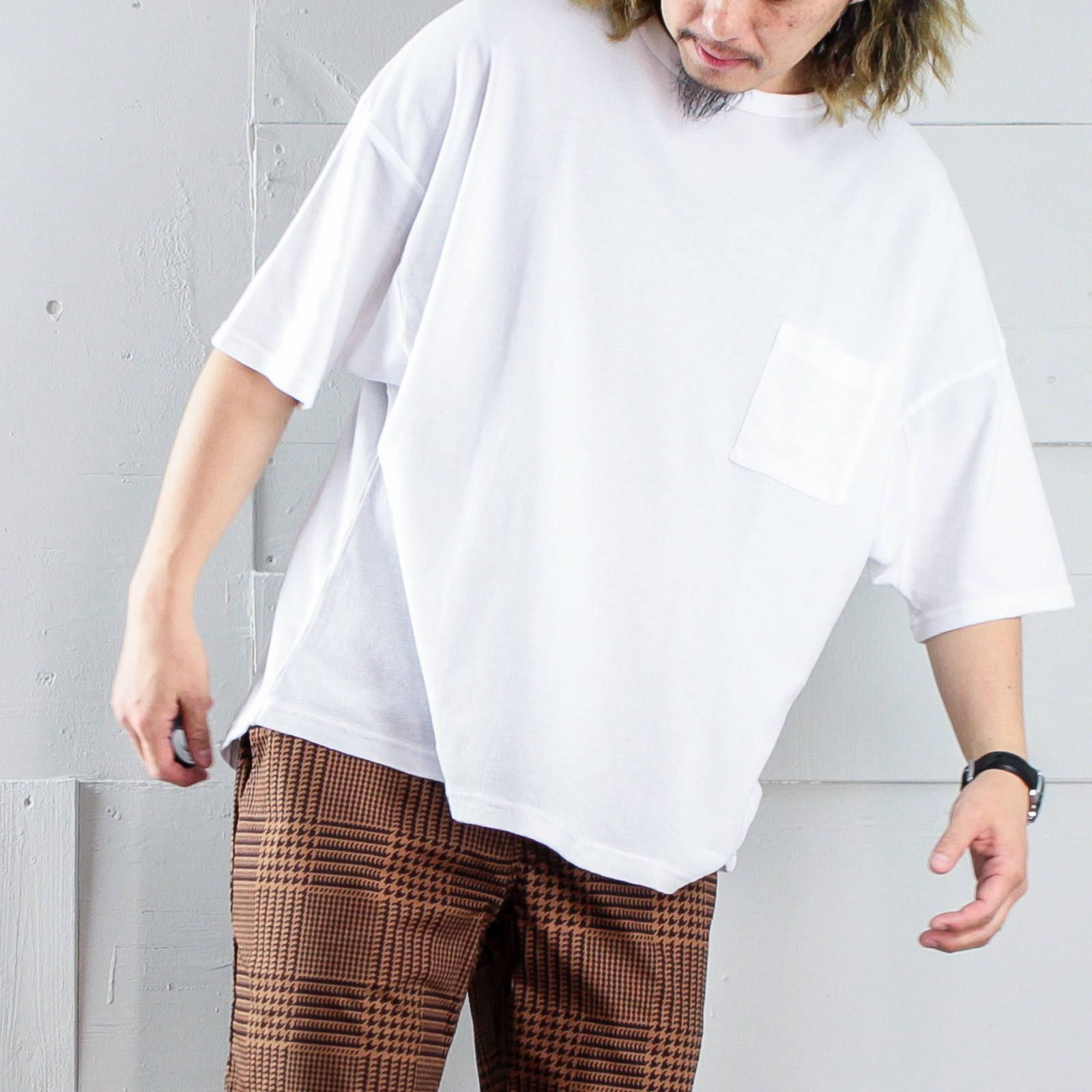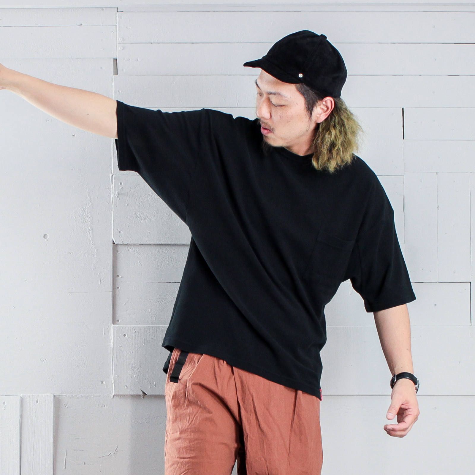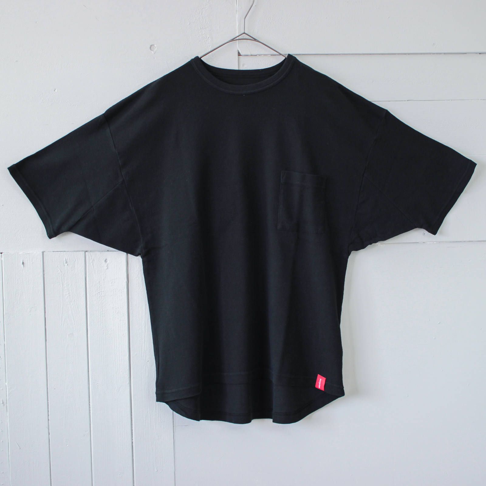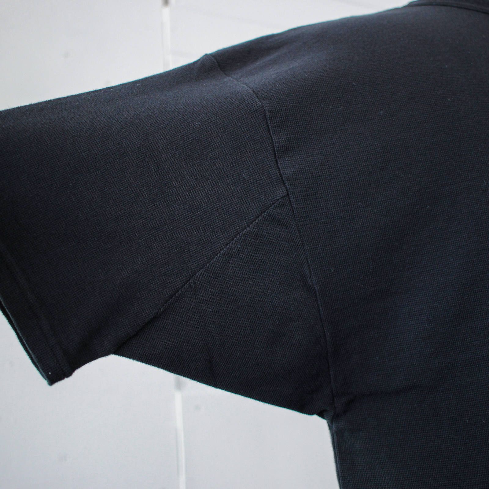 ボックスタイプのTシャツに脇マチを付けたイメージで、モモンガの様なフォルムが特徴です。腕を下ろすと通常のカットソーみたいになる面白い構造。ゆったりとしたサイズ感で風通しが良く、脇のパーツにより汗染みが付きにくいのが夏に嬉しいポイント。