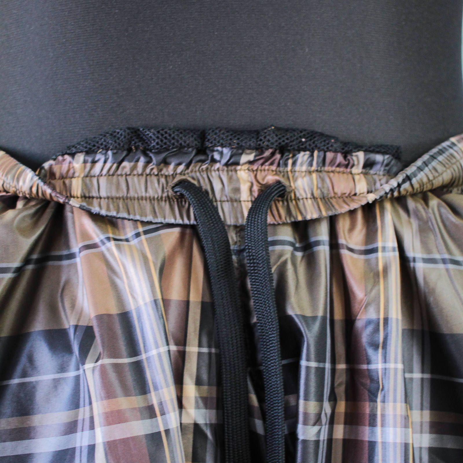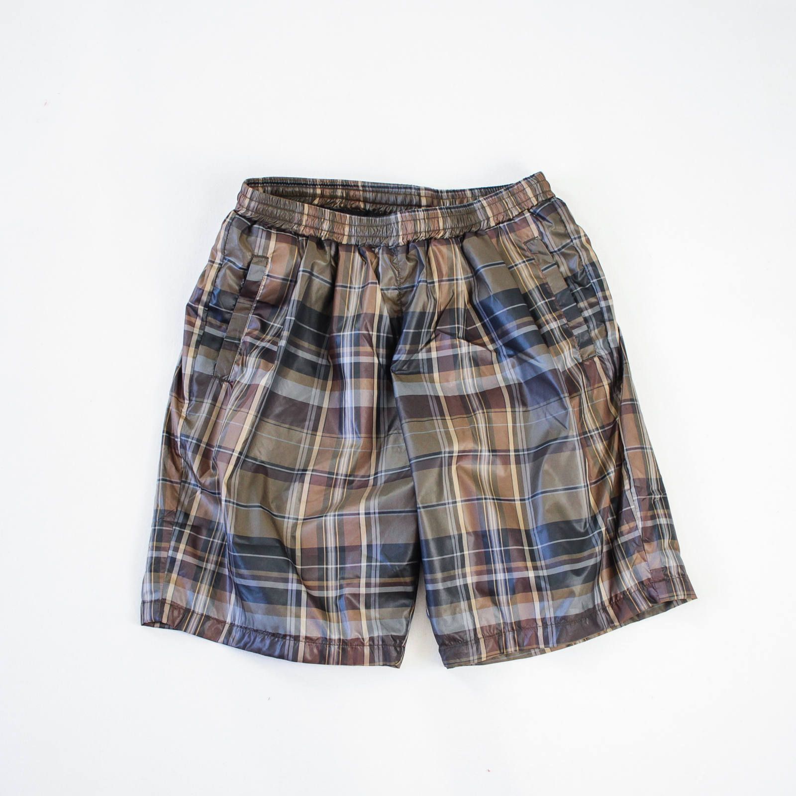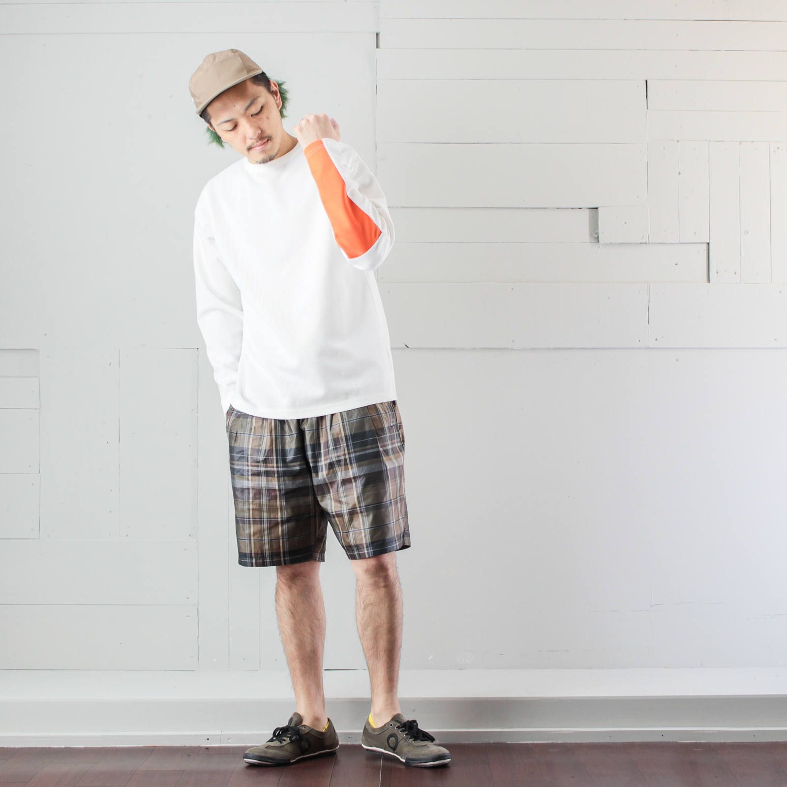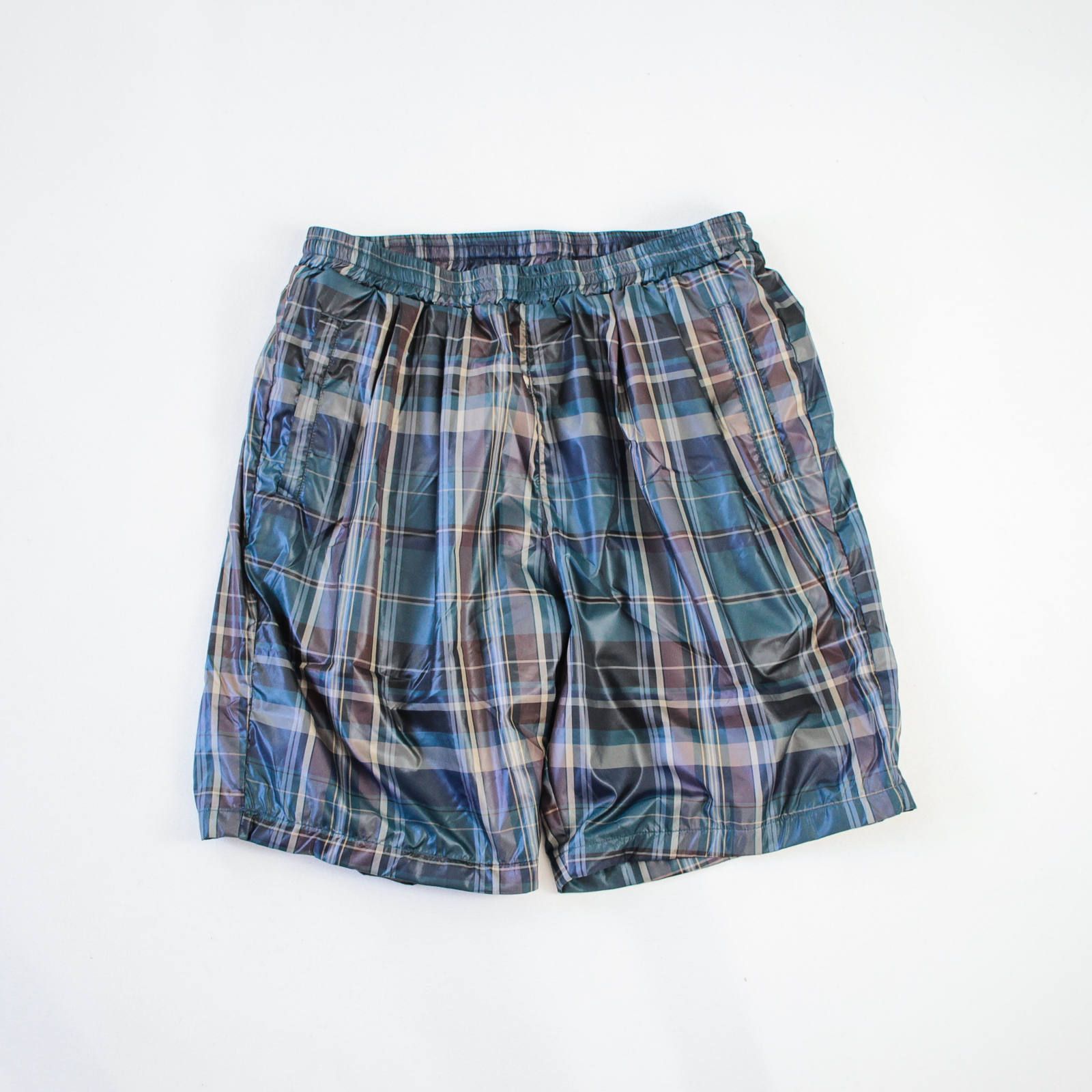 チェック柄と光沢が特徴のとても軽い生地を使用し、楽に履けるイージーショーツ。2タック入りでふんわりとしたシルエットもポイント。