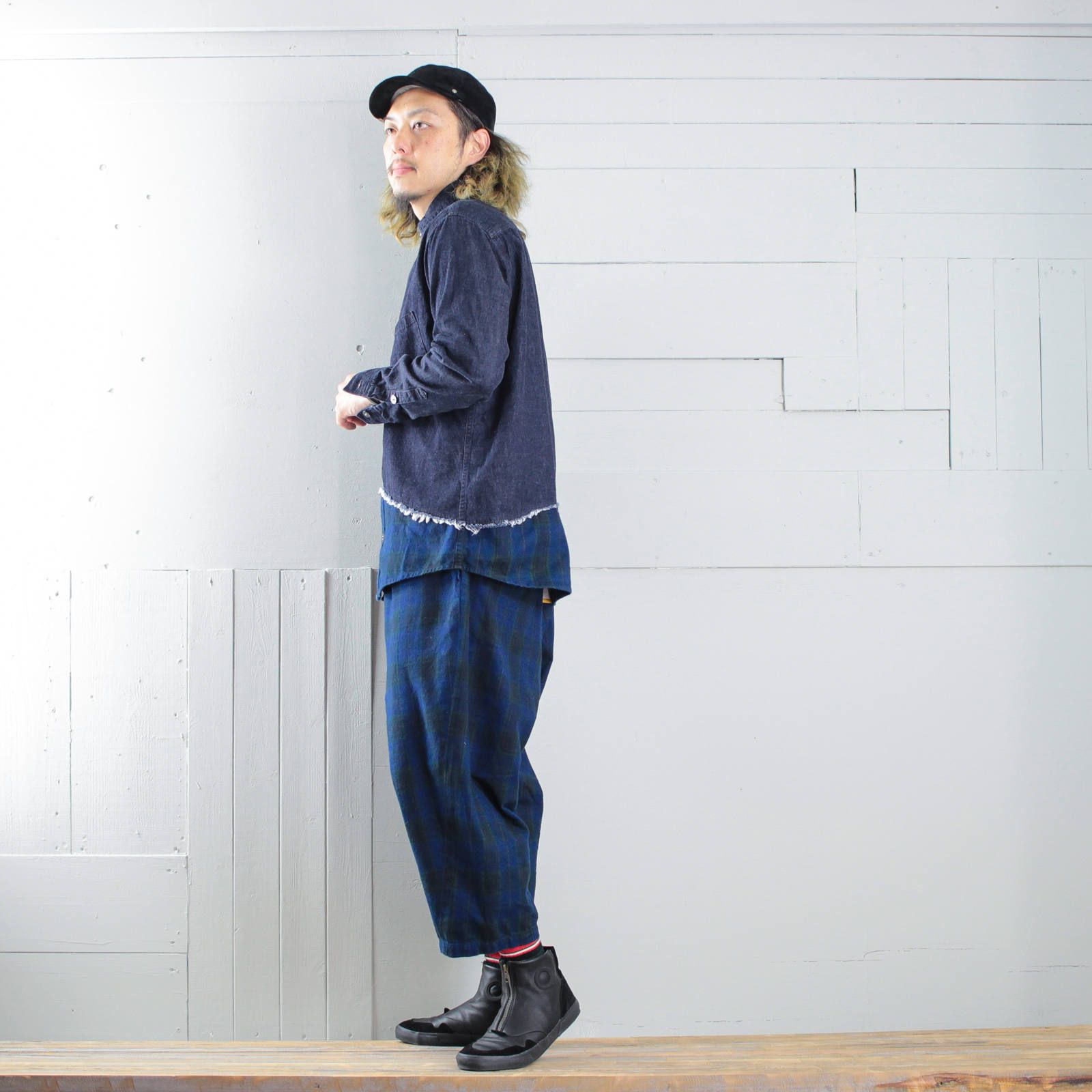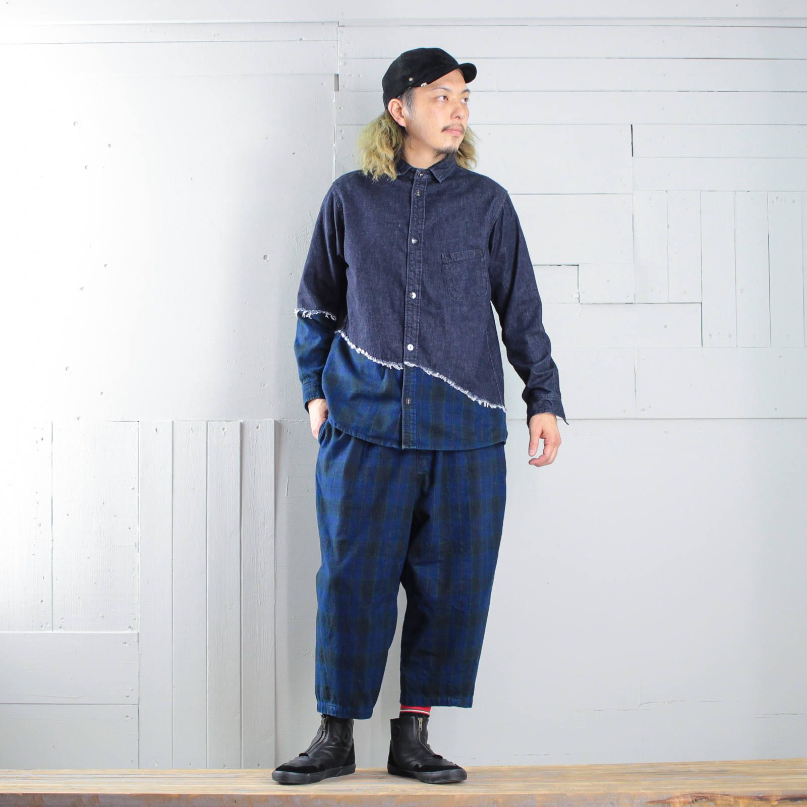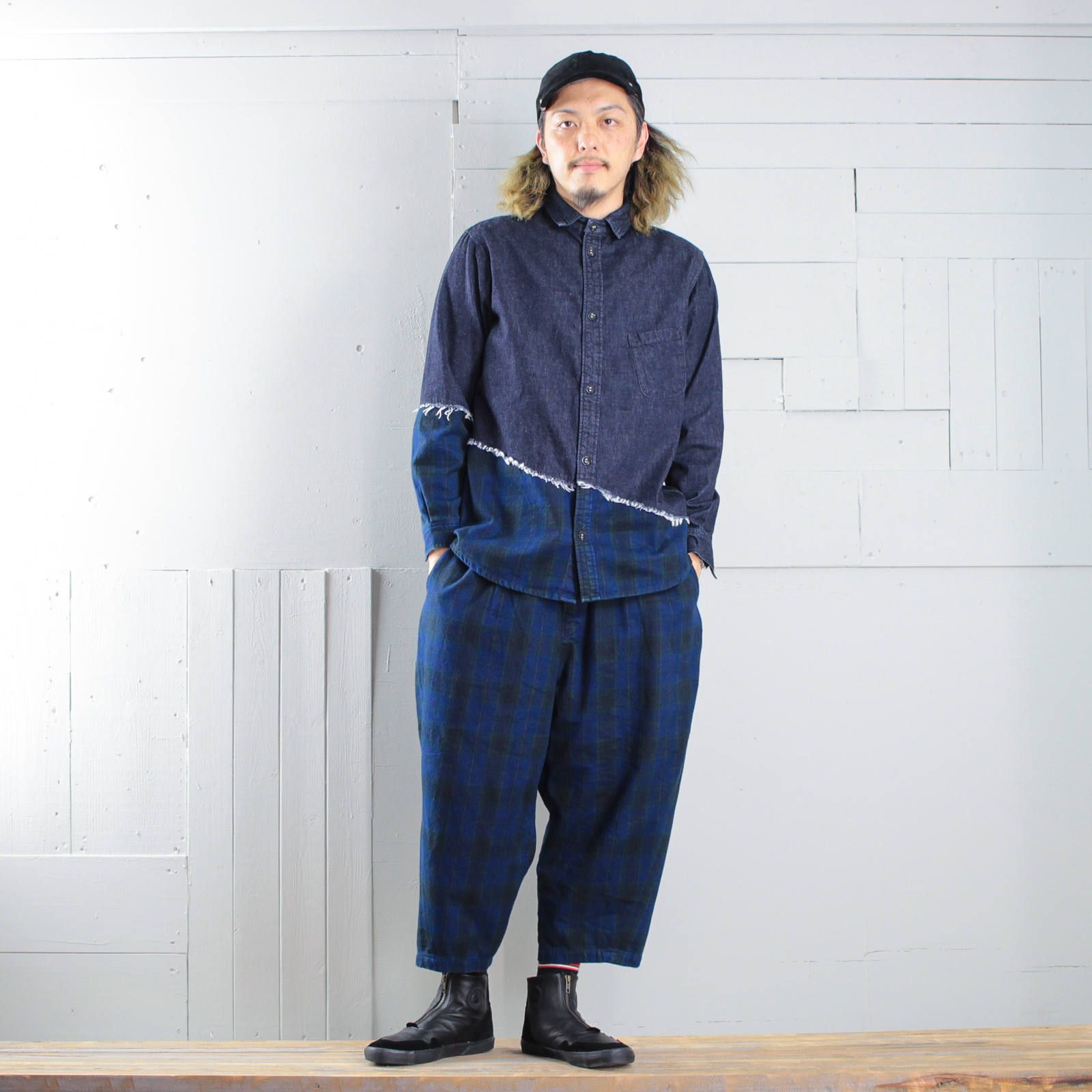 セットアップのお相手は斜めに切り替えたデニムシャツ。裾部分がパンツと同じインディゴチェック生地なので、パンツと合わせると面白いセットアップスタイルが完成。