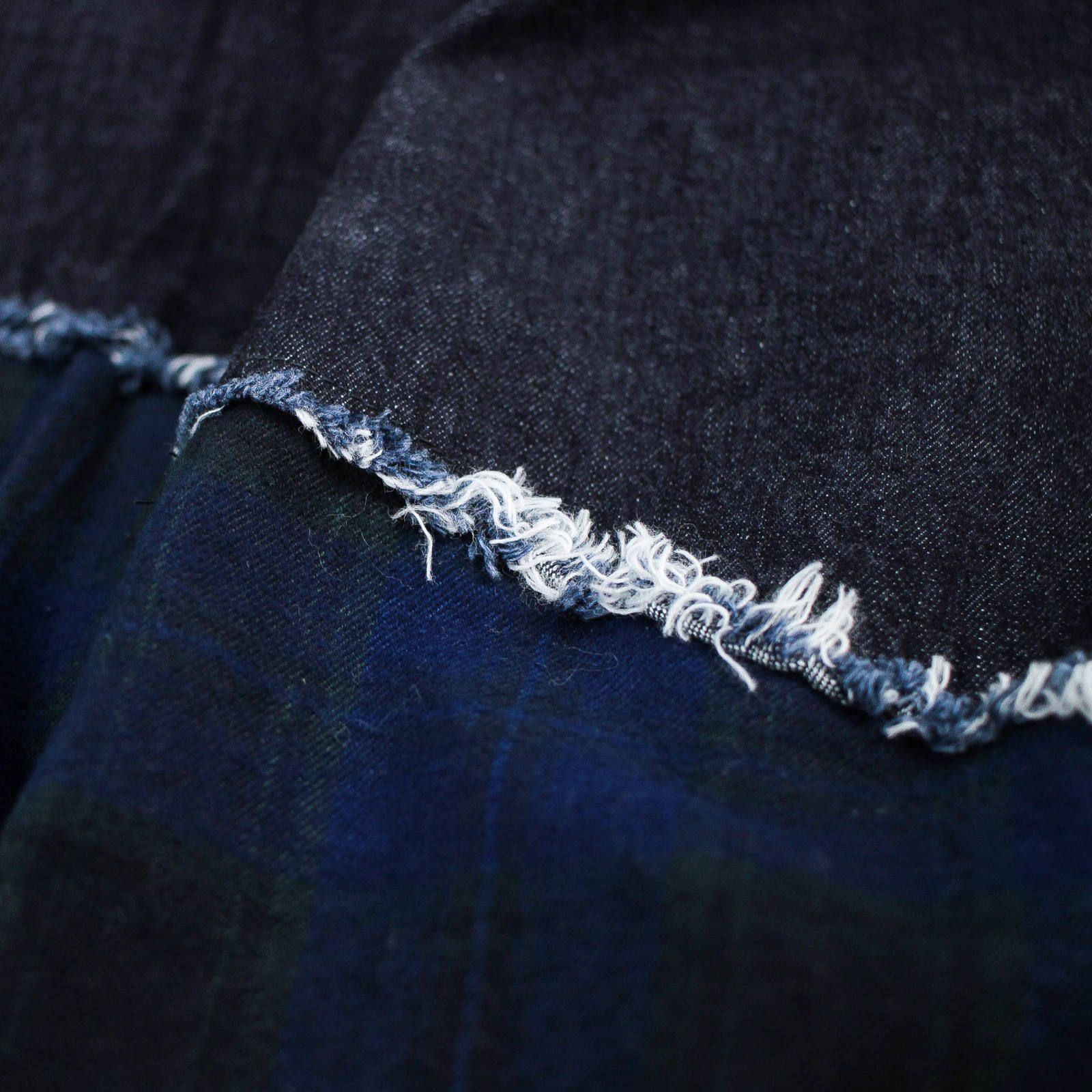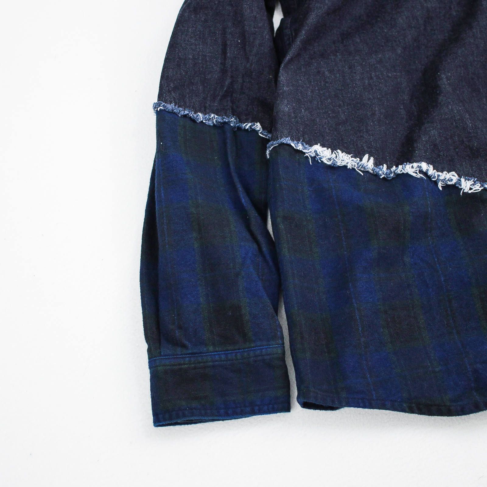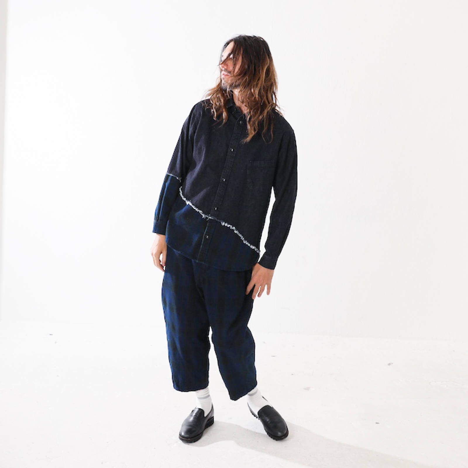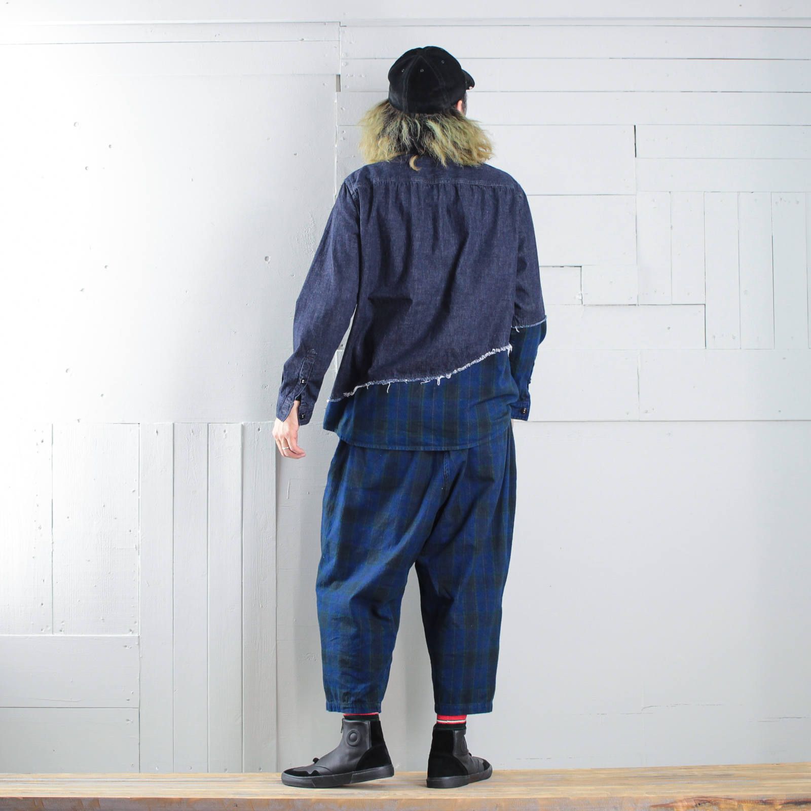 セットアップのお相手は斜めに切り替えたデニムシャツ。裾部分がパンツと同じインディゴチェック生地なので、パンツと合わせると面白いセットアップスタイルが完成。