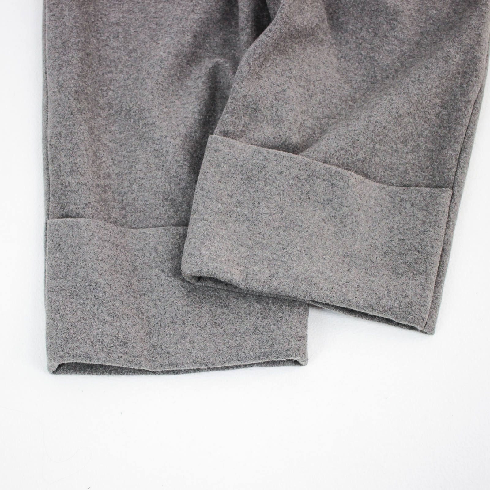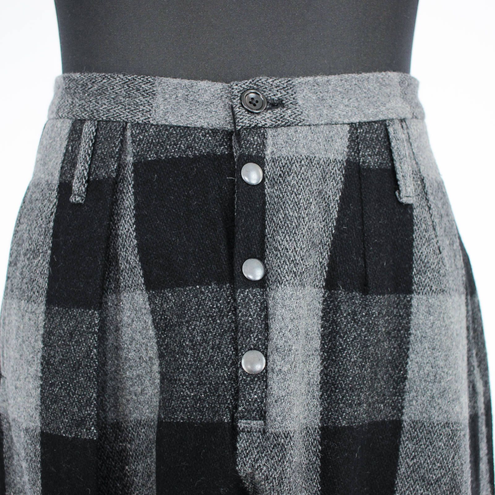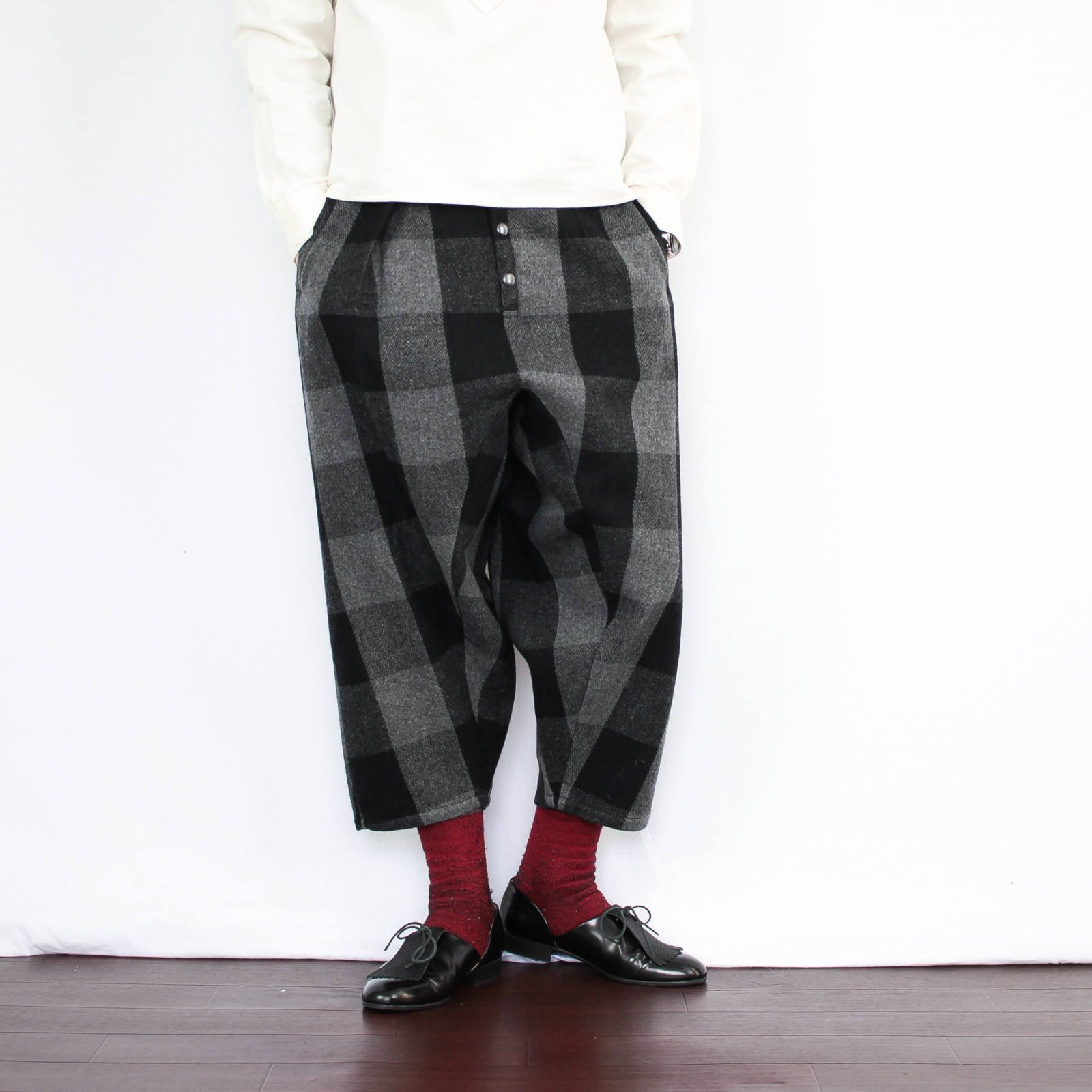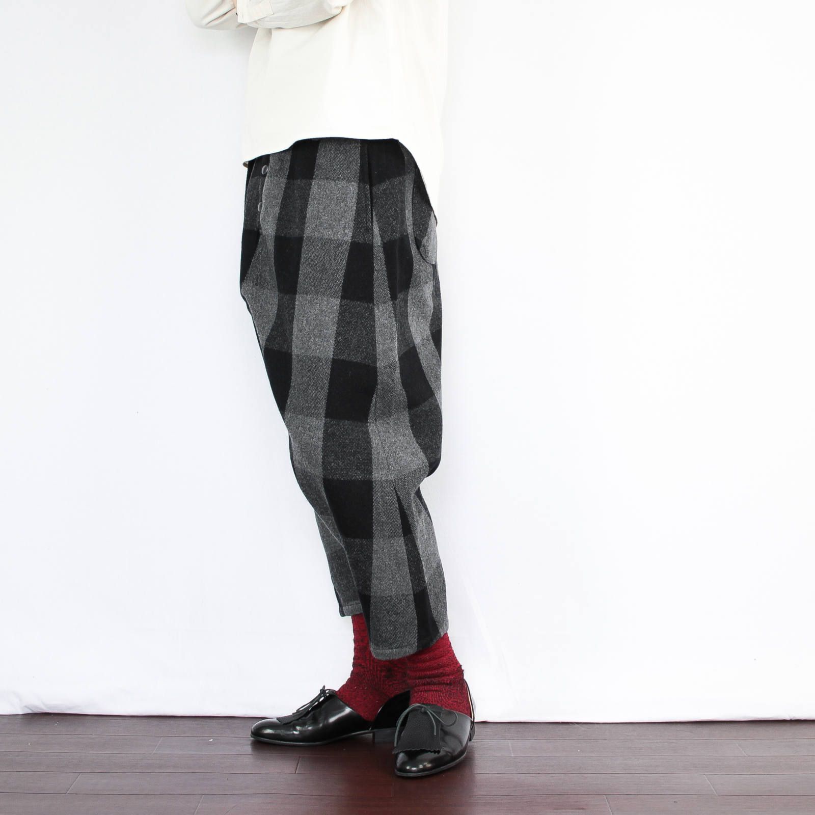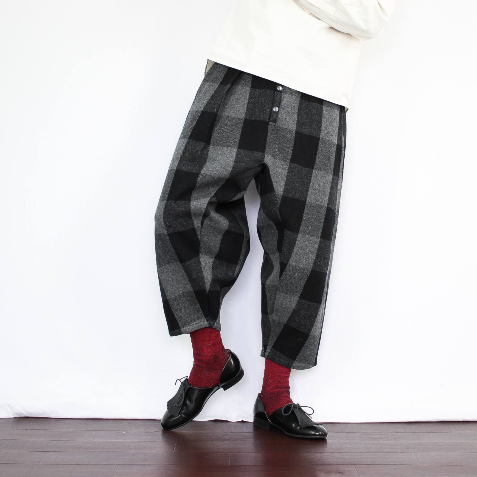 とっても柔らかな上質で上品なウールを使用した太めのパンツと、ブロックチェックのサルエルパンツ。