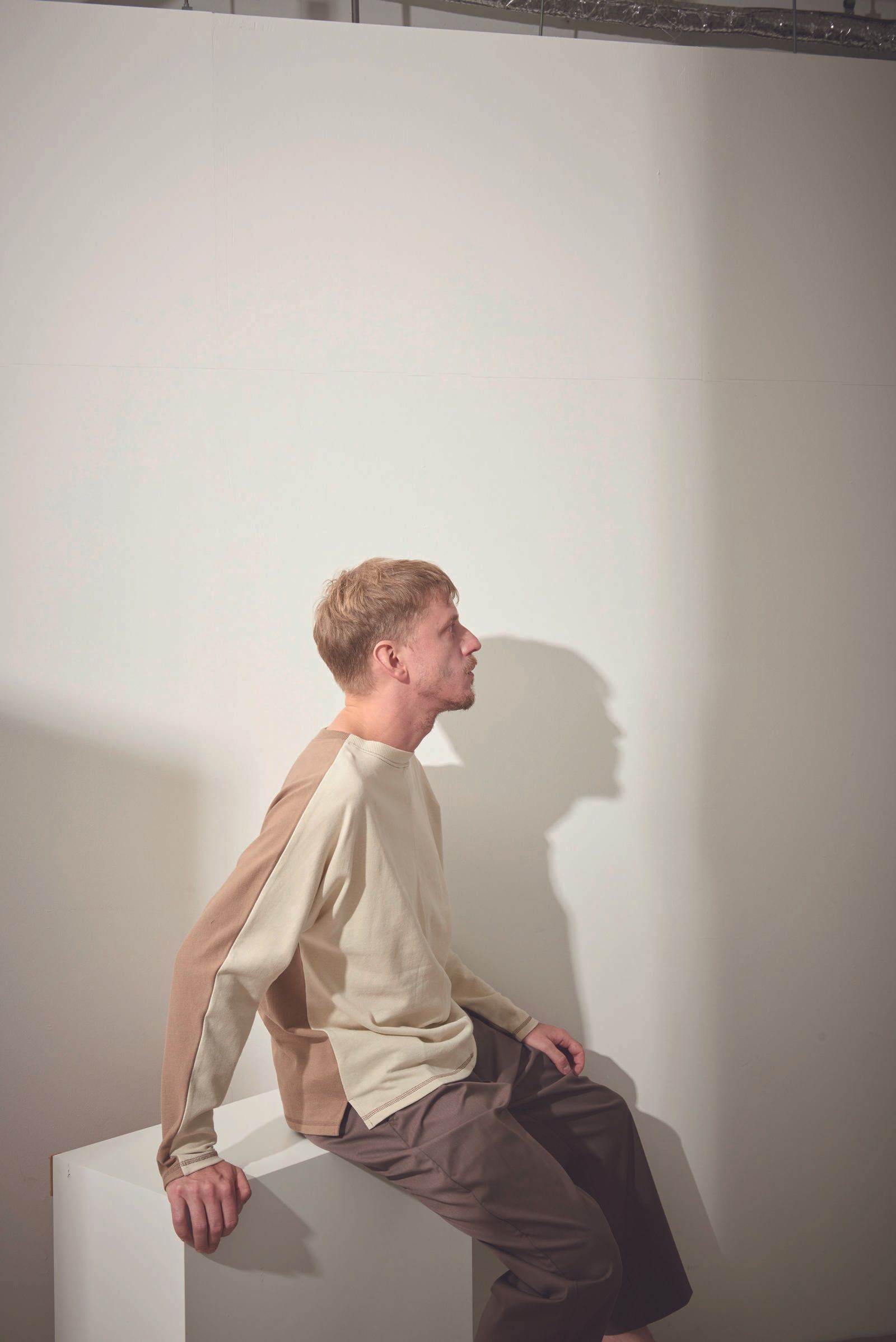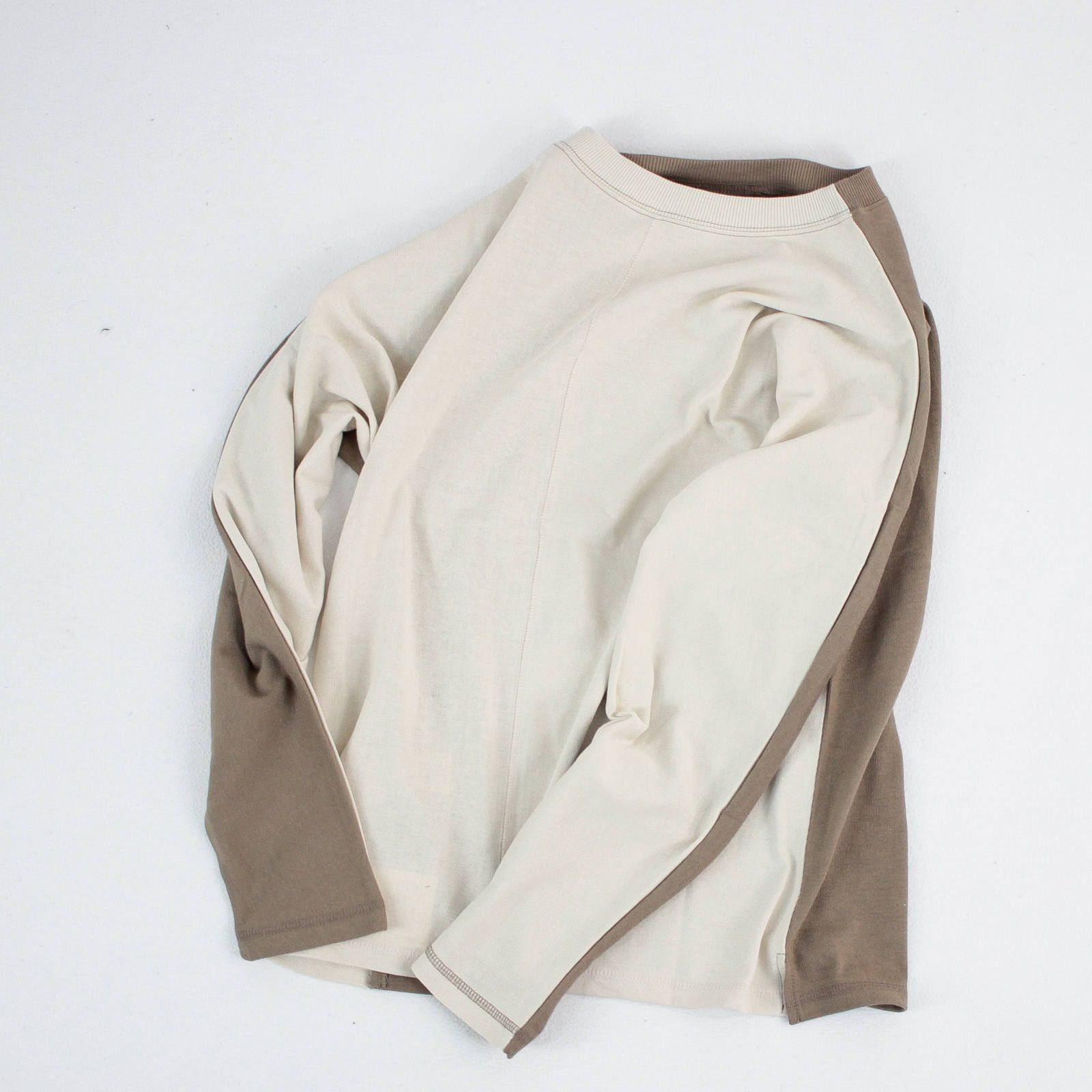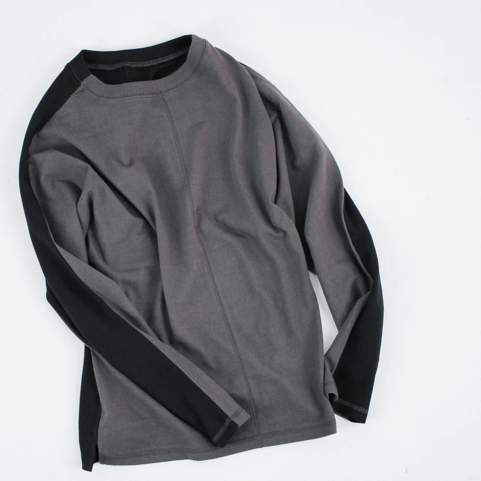 前後で配色になった長袖。この配色デザインはただの配色じゃ無くて、前後で同じ形をしているので、どちらを前にしても着用可能なんです。