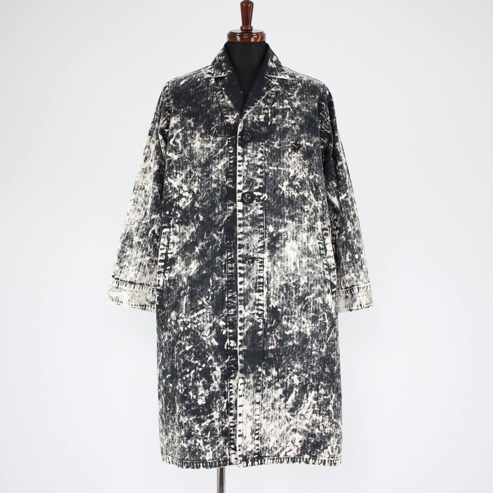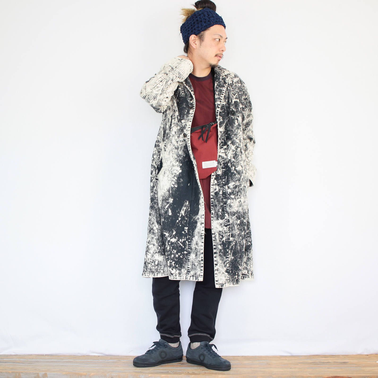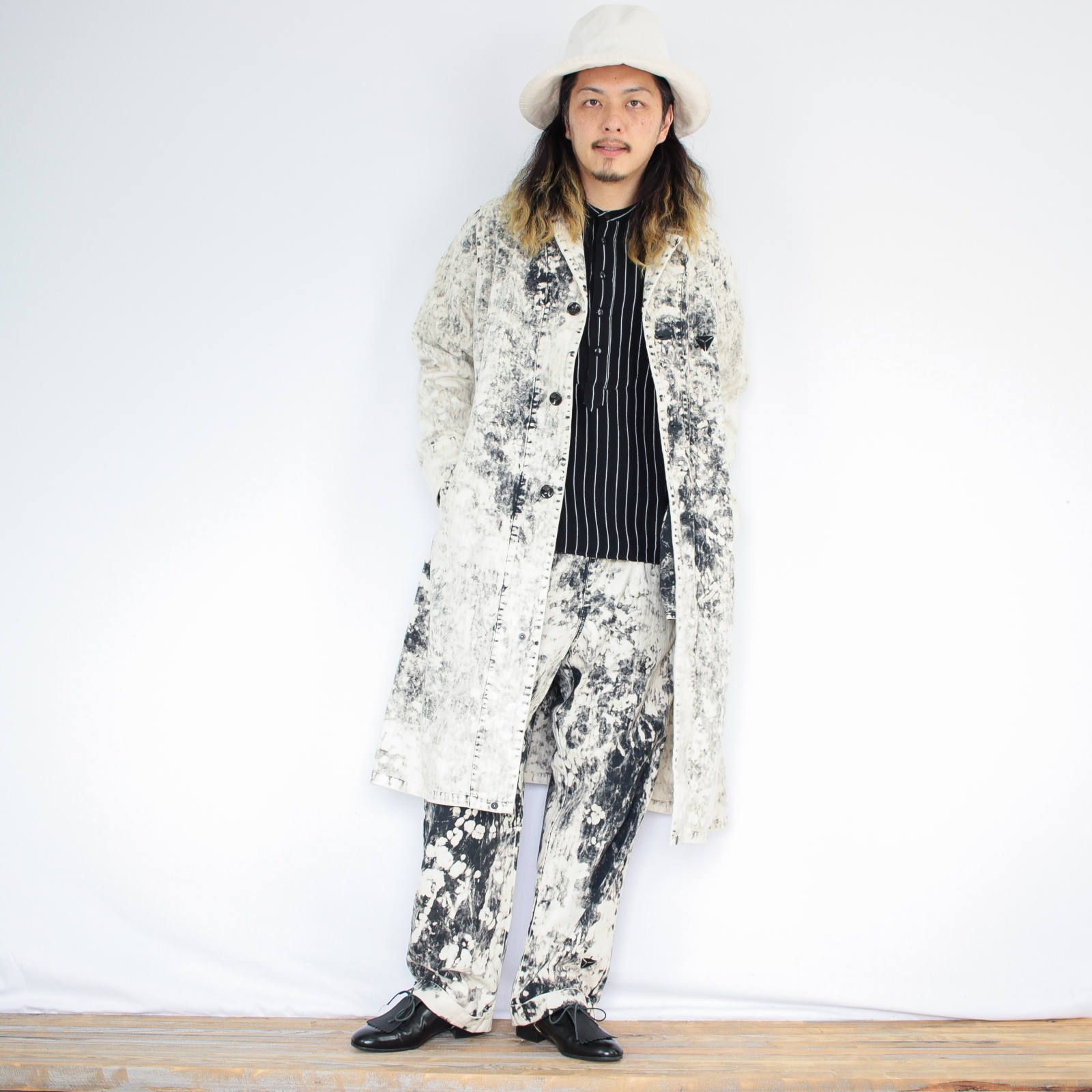 柔らかくもしっかりとしたヘリンボーン(生地の編み目がニシンの骨みたいな)生地をベースに、ブラック硫化染め+表面ムラブリーチ加工が施されてます。仕上がるまでどんな表情なのかわからないこの加工。その為、同じアイテムでも黒が強い物、白が強い物、と表情が1点1点異なります!