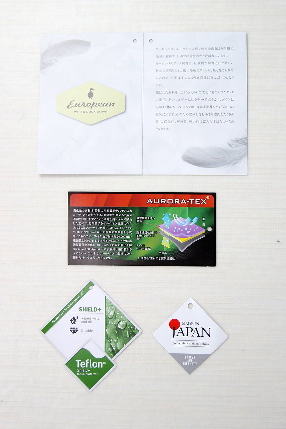 使用しているダウンはFP760以上(FP=フィルパワー[用いられている羽毛のかさ高性を表す単位]詳しくはコチラ)のダウンを採用。成熟した水鳥の羽毛を国内で洗浄・精製している為、羽毛本来の温湿度調整機能が非常に高く、丈夫で羽毛特有の匂いのないダウンです。