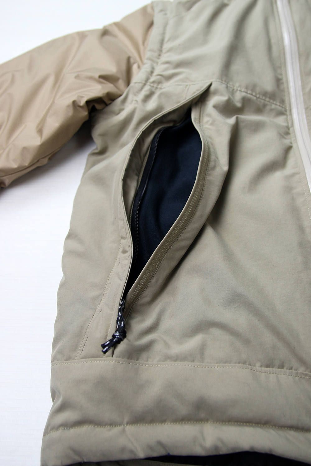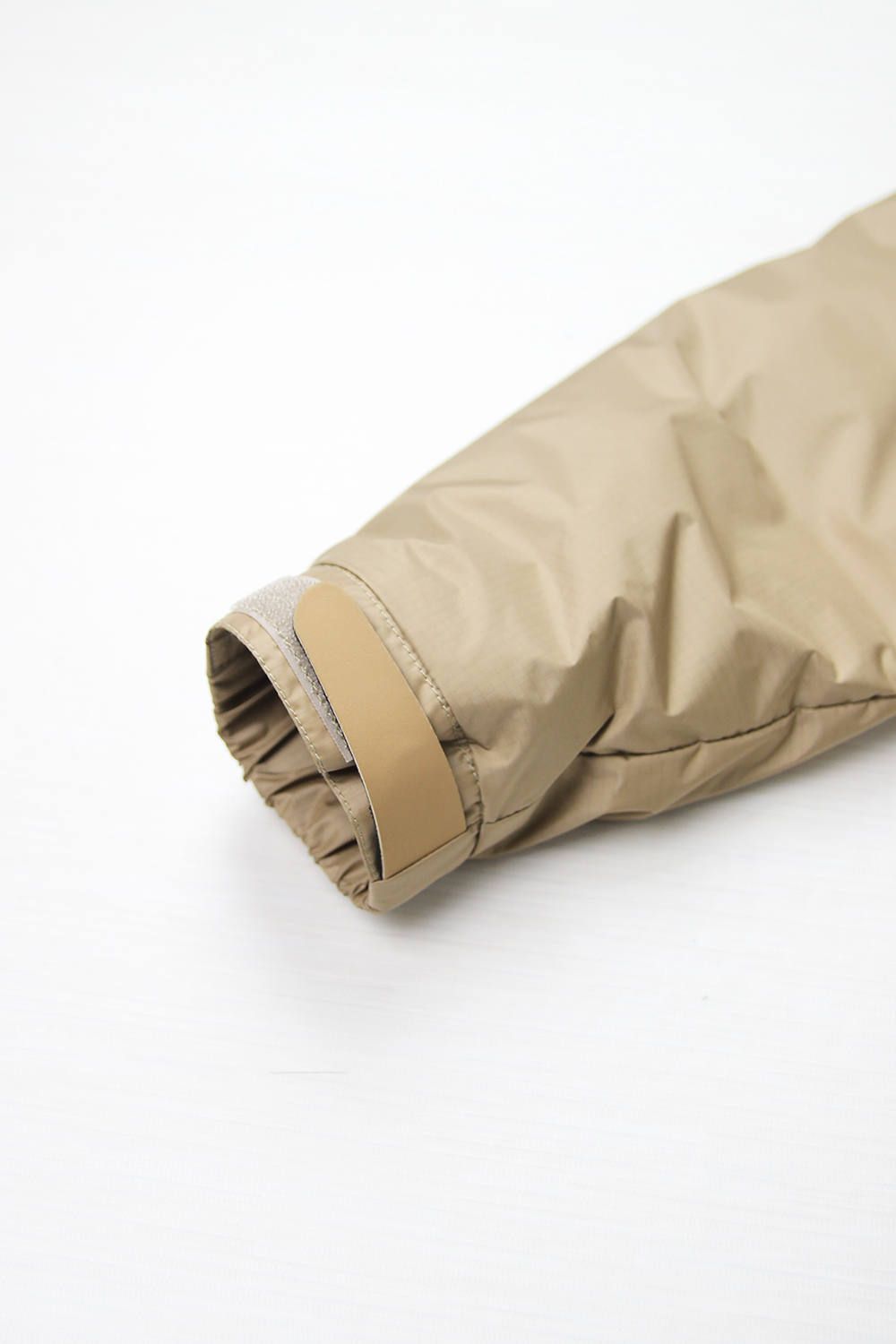 袖、フードには、高レベル防水透湿性能を兼ね備えたナイロンリップストップを使用。リップストップとは、裂け防止の為に生地に升状の加工をした生地の事で、アウトドアシュラフ(寝袋)にも用いられる優れた素材です。