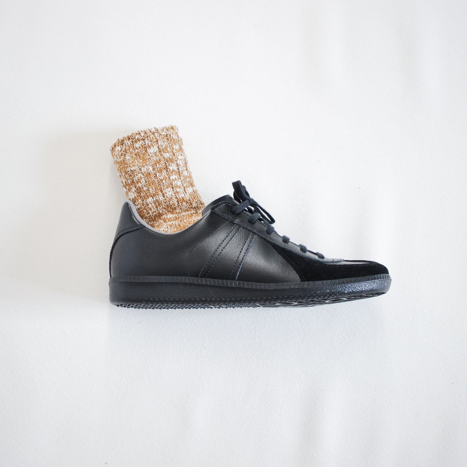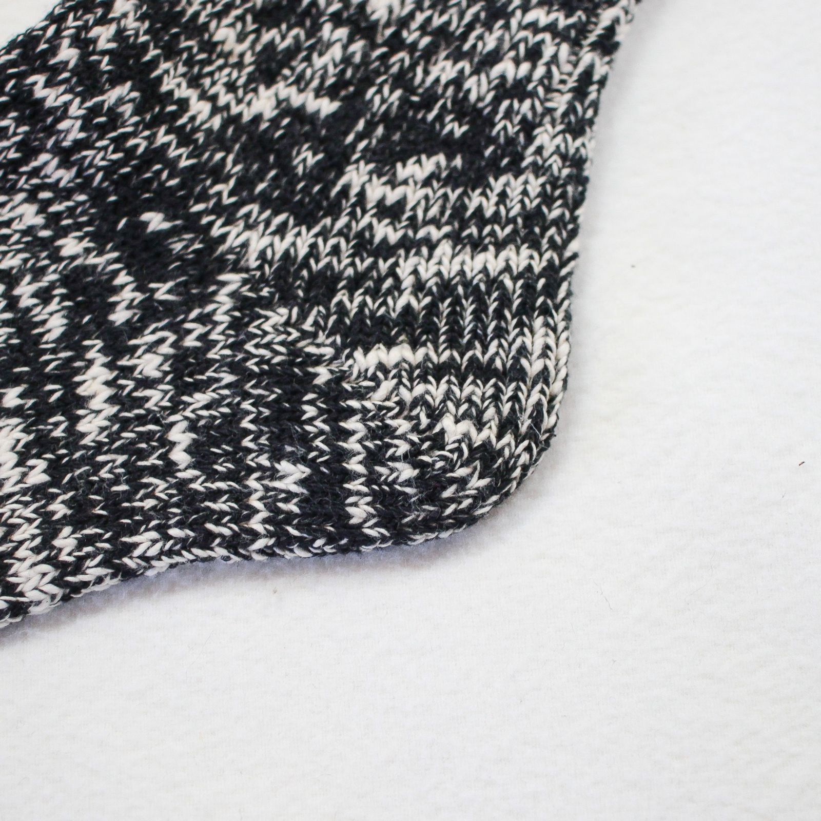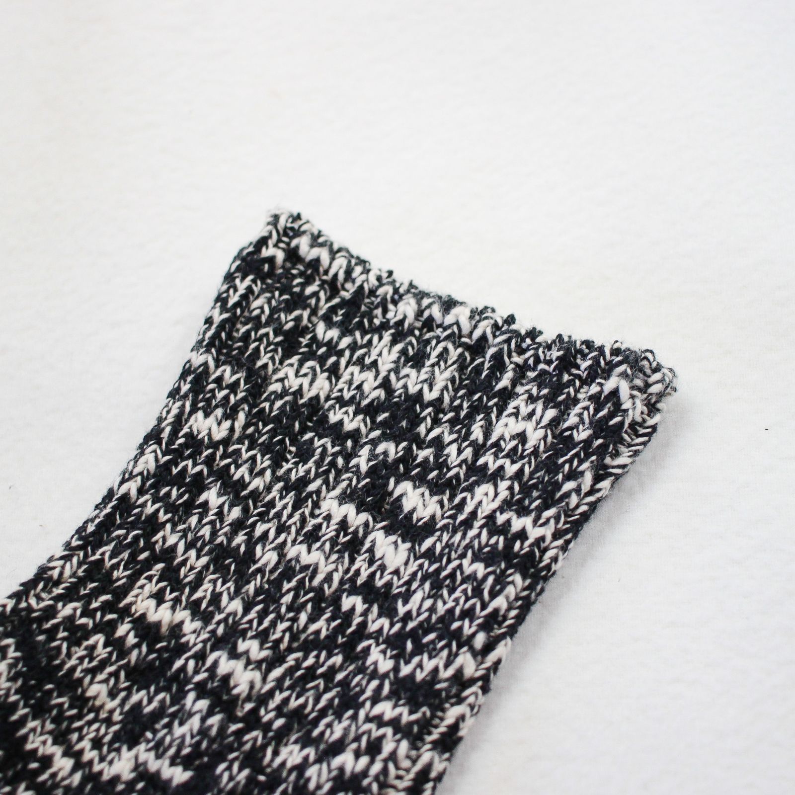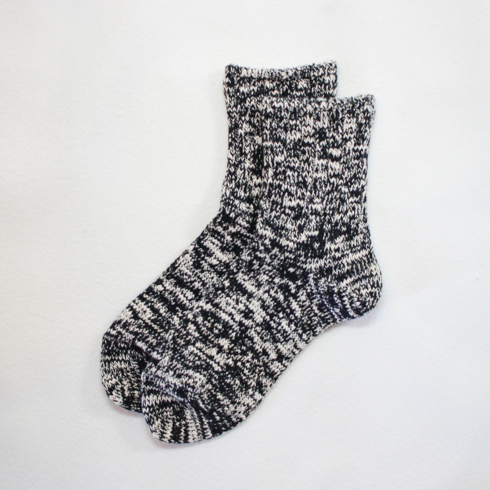 2種類の綿糸をミックスして編み立てた靴下。甘い編み目(ローゲージ)で太い綿糸のざっくりとしたドライな感触が気持ち良いアイテムです。