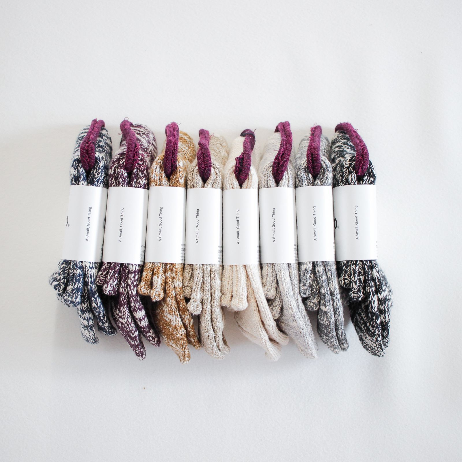 糸は染色していないオーガニックコットン糸とリサイクルコットン糸の2種類を使用。希少な旧式の編み機を使用してゆっくりと丁寧に編まれています。この旧式の編み機は現在扱える職人が少なく、その点もこの靴下の価値を上げると共に、履く人にも「特別感」を与えてくれます。