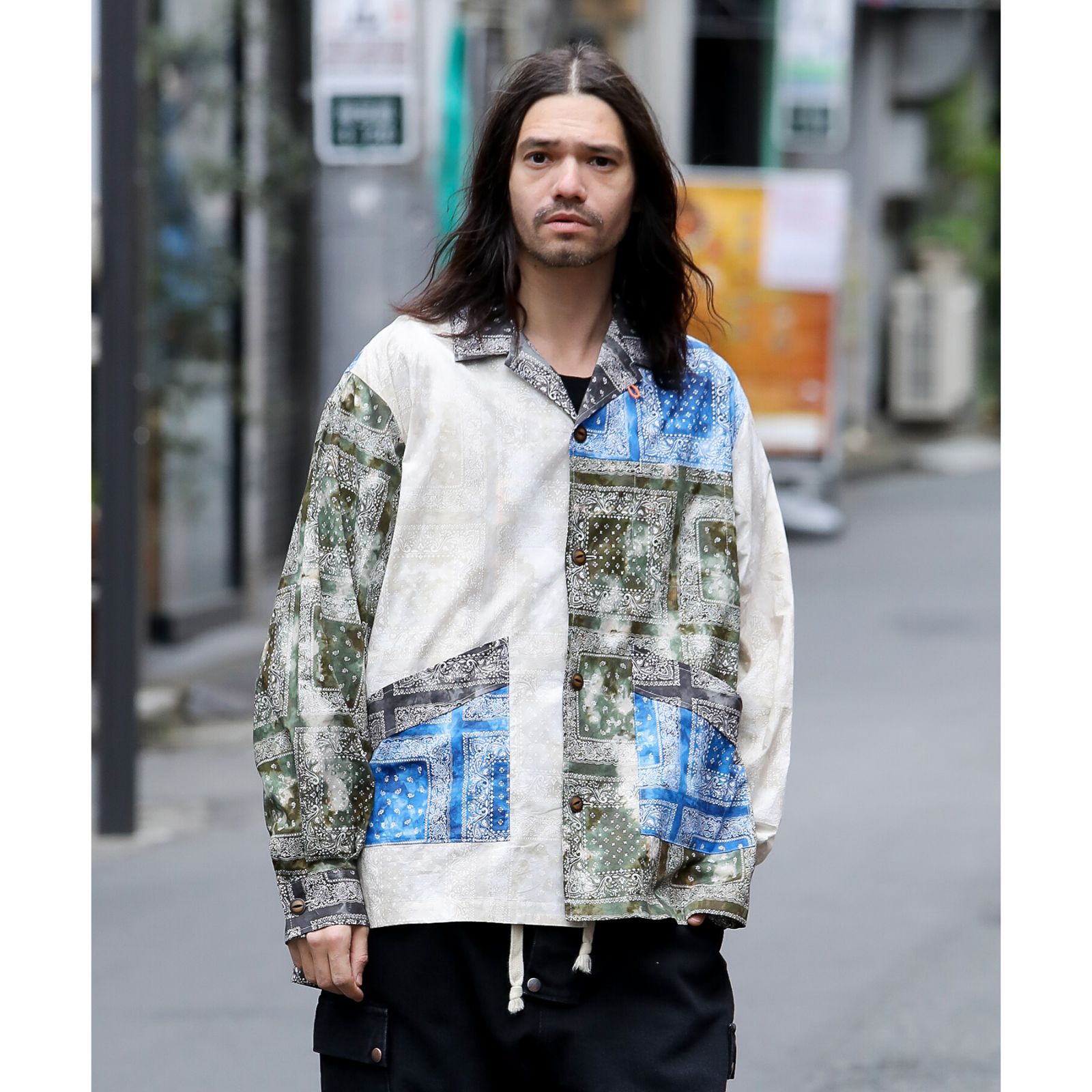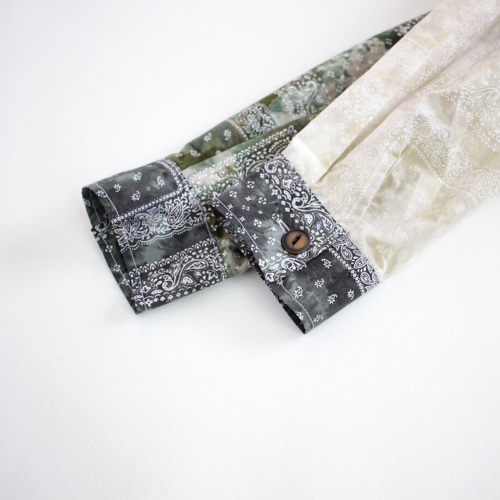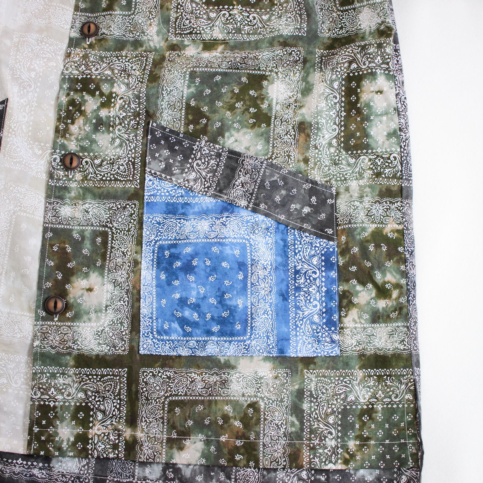 4色のバンダナ柄の生地を贅沢に使用した開襟シャツ。このバンダナ生地はそれぞれタイダイ加工が施された手の込んだ逸品。柄とタイダイの組み合わせが最高にカッコイイんです!