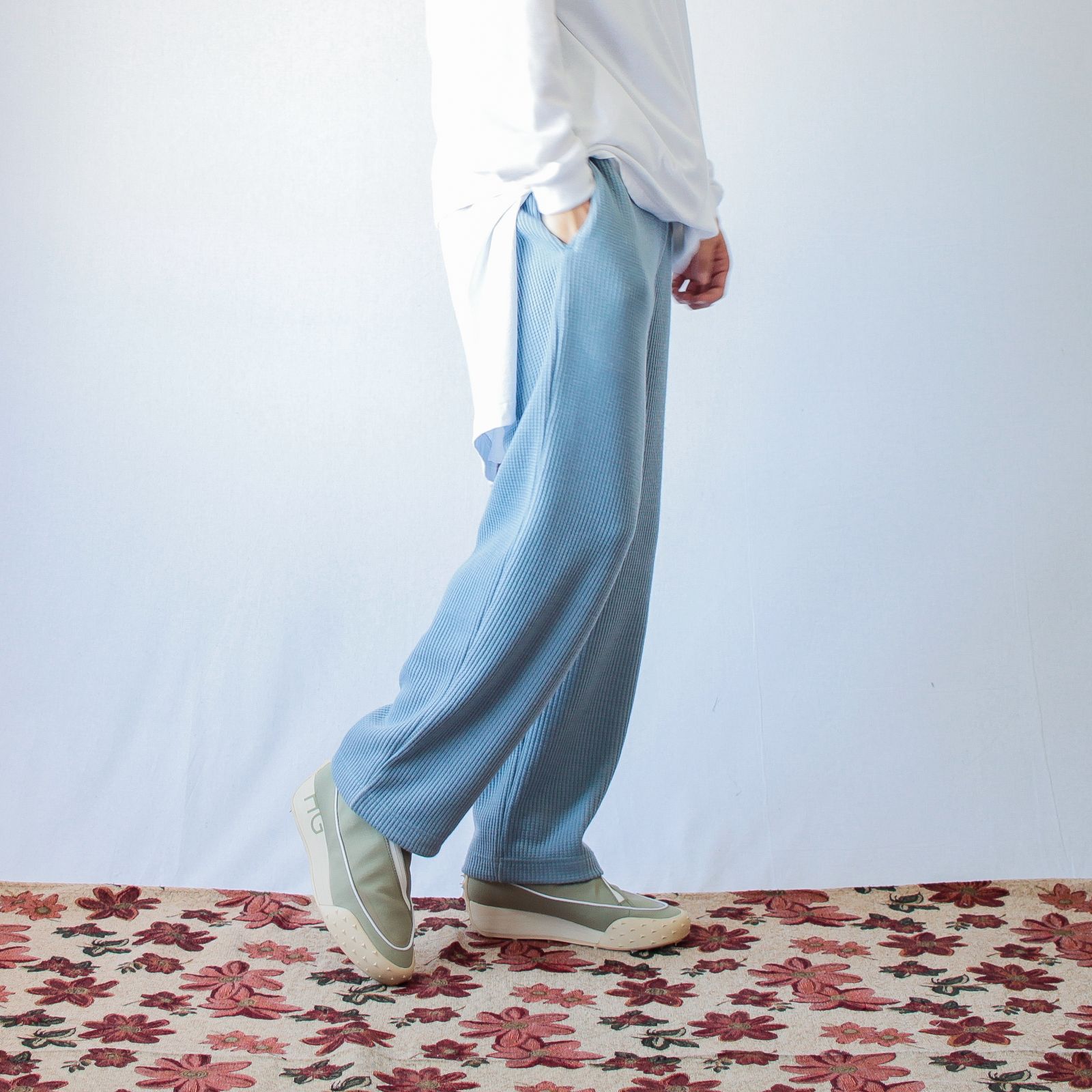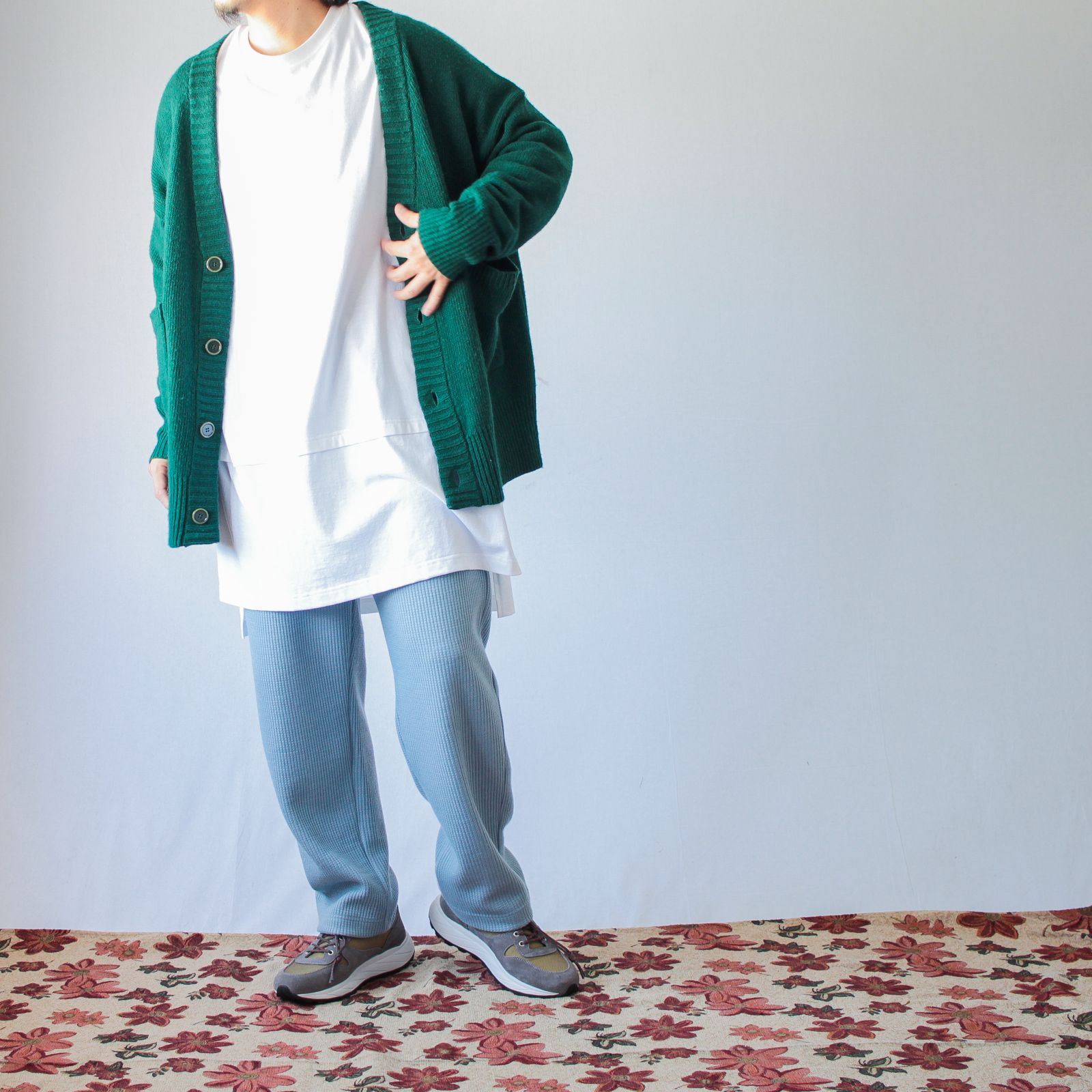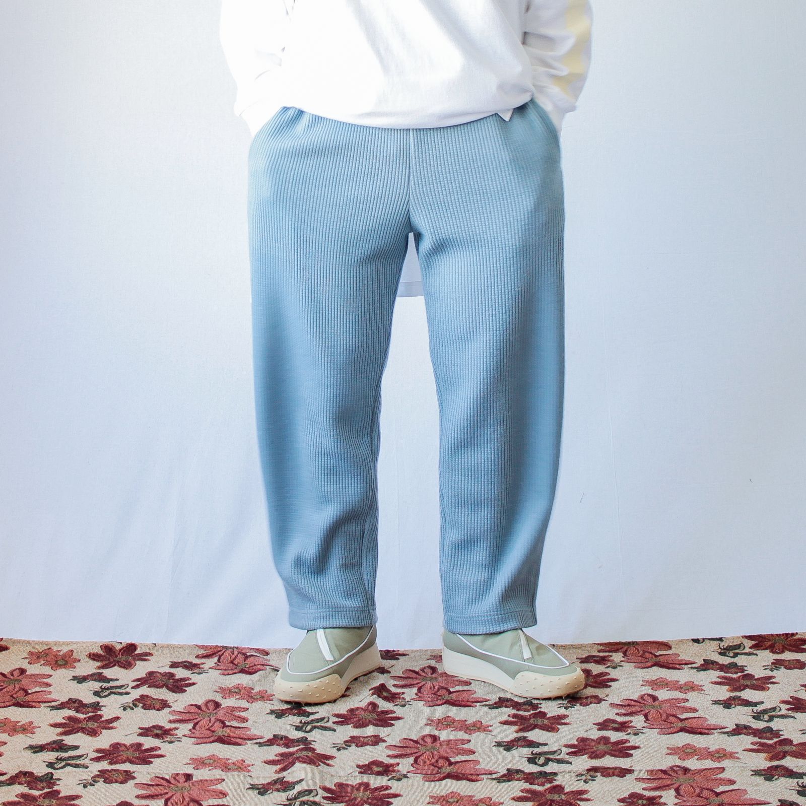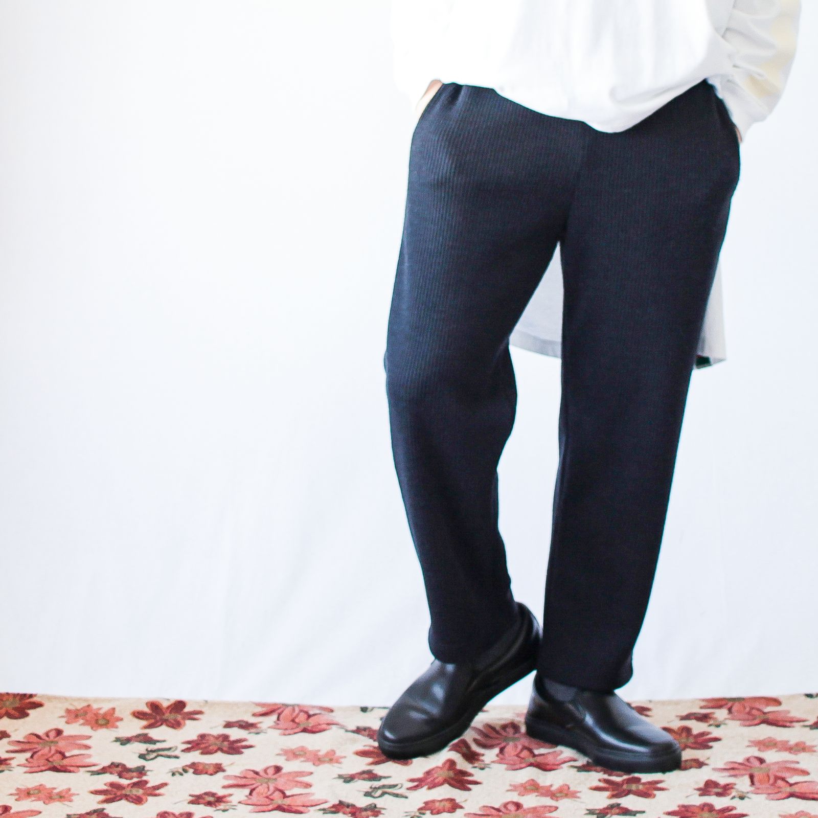 こういう楽なパンツは着用回数を重ねると形崩れや膝の伸びが気になるところですが、本アイテムはアクリルウール混の生地を使うことで形崩れし難い仕上がりに。