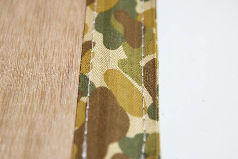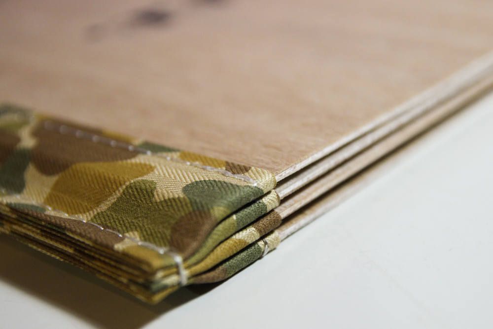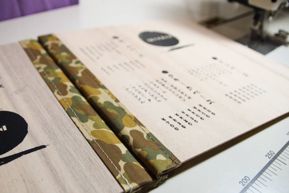 各ページのメニューをシルクスクリーンに起こし、木の板にプリント!プリントした板に迷彩柄のコットンテープをミシンで縫い付け、纏めて更に縫って完成です。
