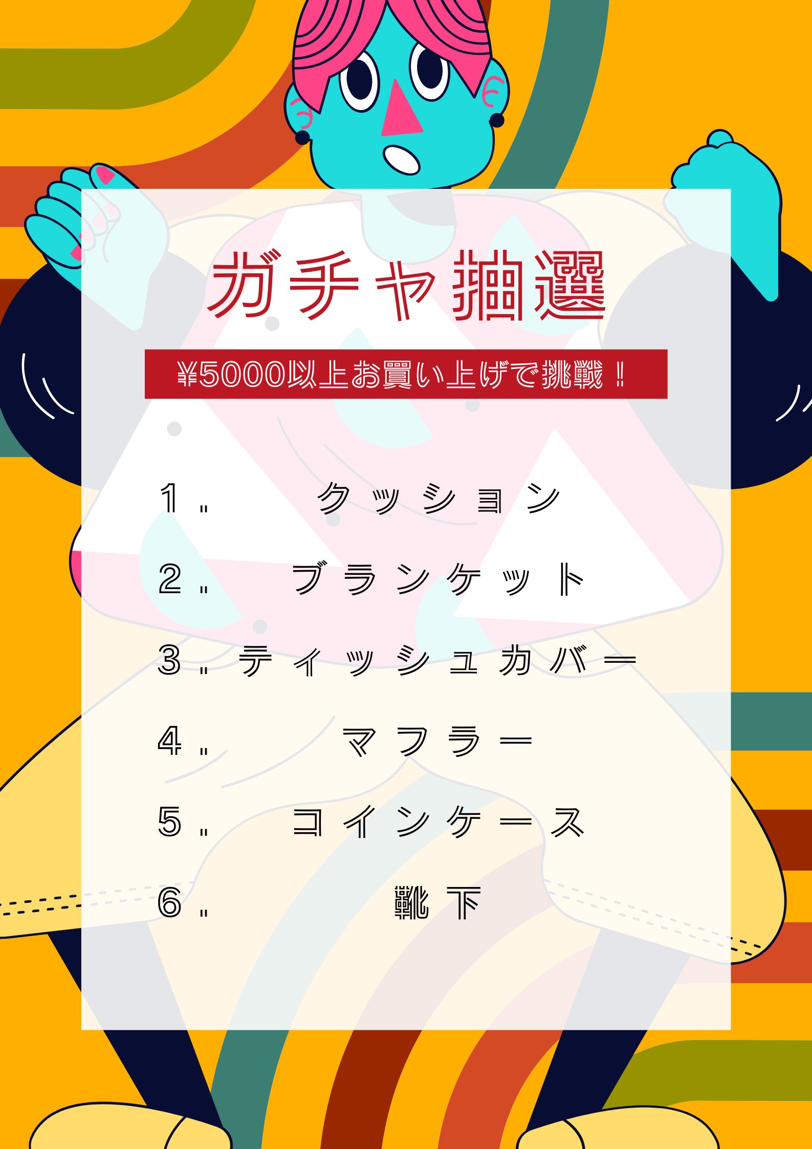 ガチャガチャは5000円以上のお買い上げでチャレンジ。(*1万円以上のお買い上げでクッションかブランケットかガチャ挑戦か選べます。)