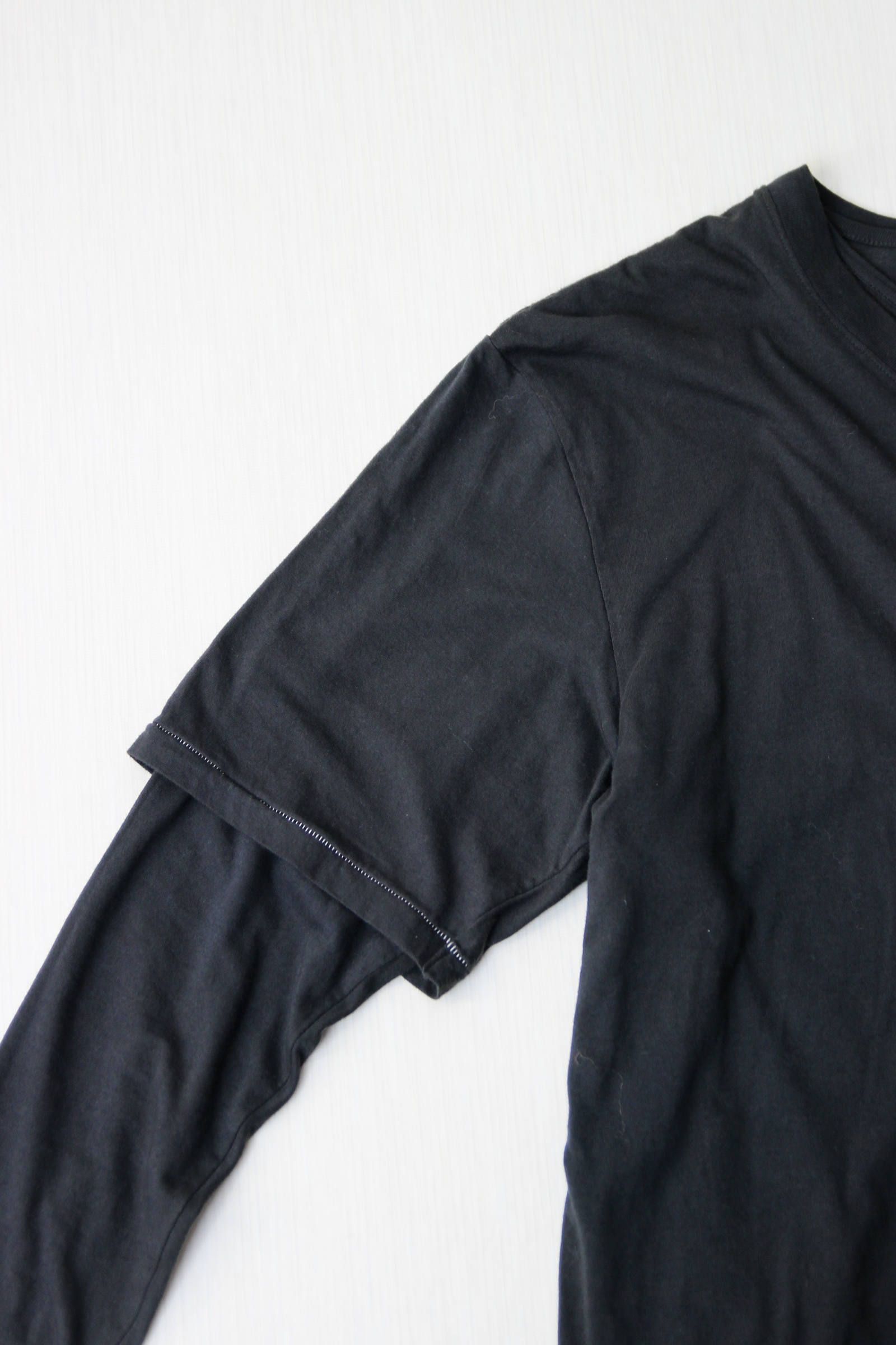 よくある重ね着風のアイテムは"袖だけつけた"とか"裾だけつけた"とかが多いですが、こちらは完全にロンTとTシャツを重ねてます!そして肩部分で固定してます。