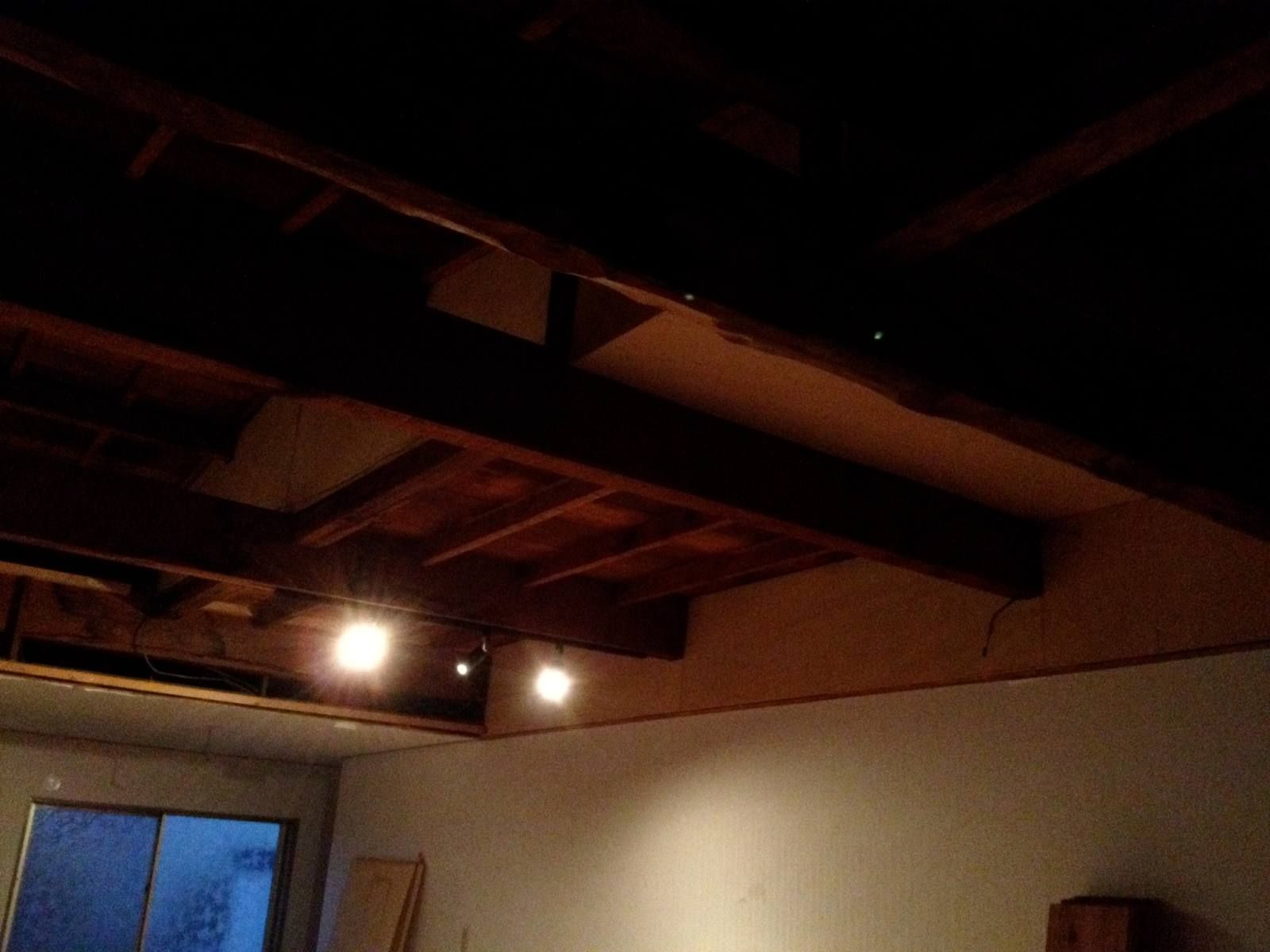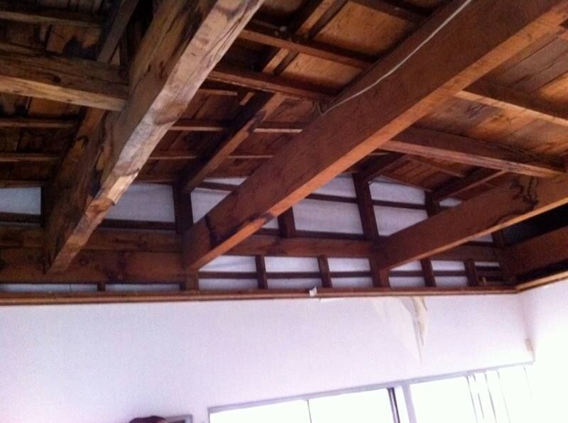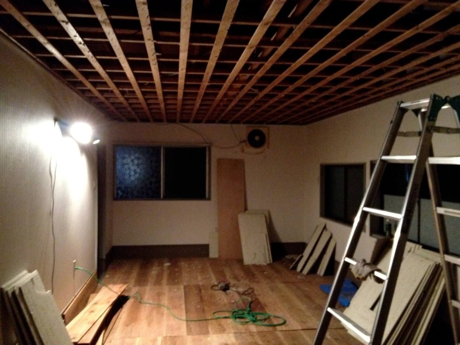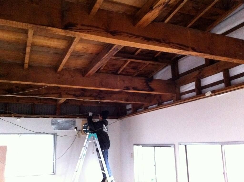 床を古い足場板にしたかったのですが、なかなか手に入れることができなかったので、先ず、杉板を敷き詰めてその上で作業をし、わざと汚れや傷を付けていきました。この写真は「天井剥がしたら梁出てくるかな??」と考えてるところです。