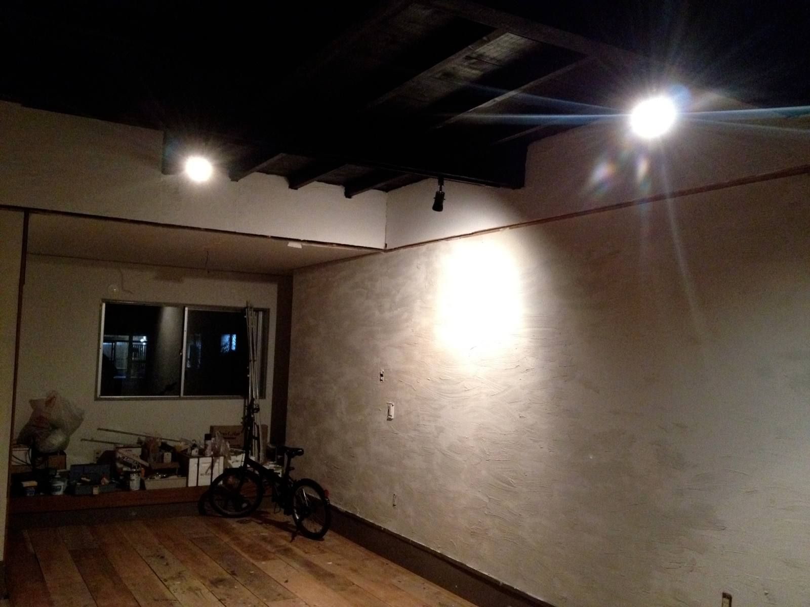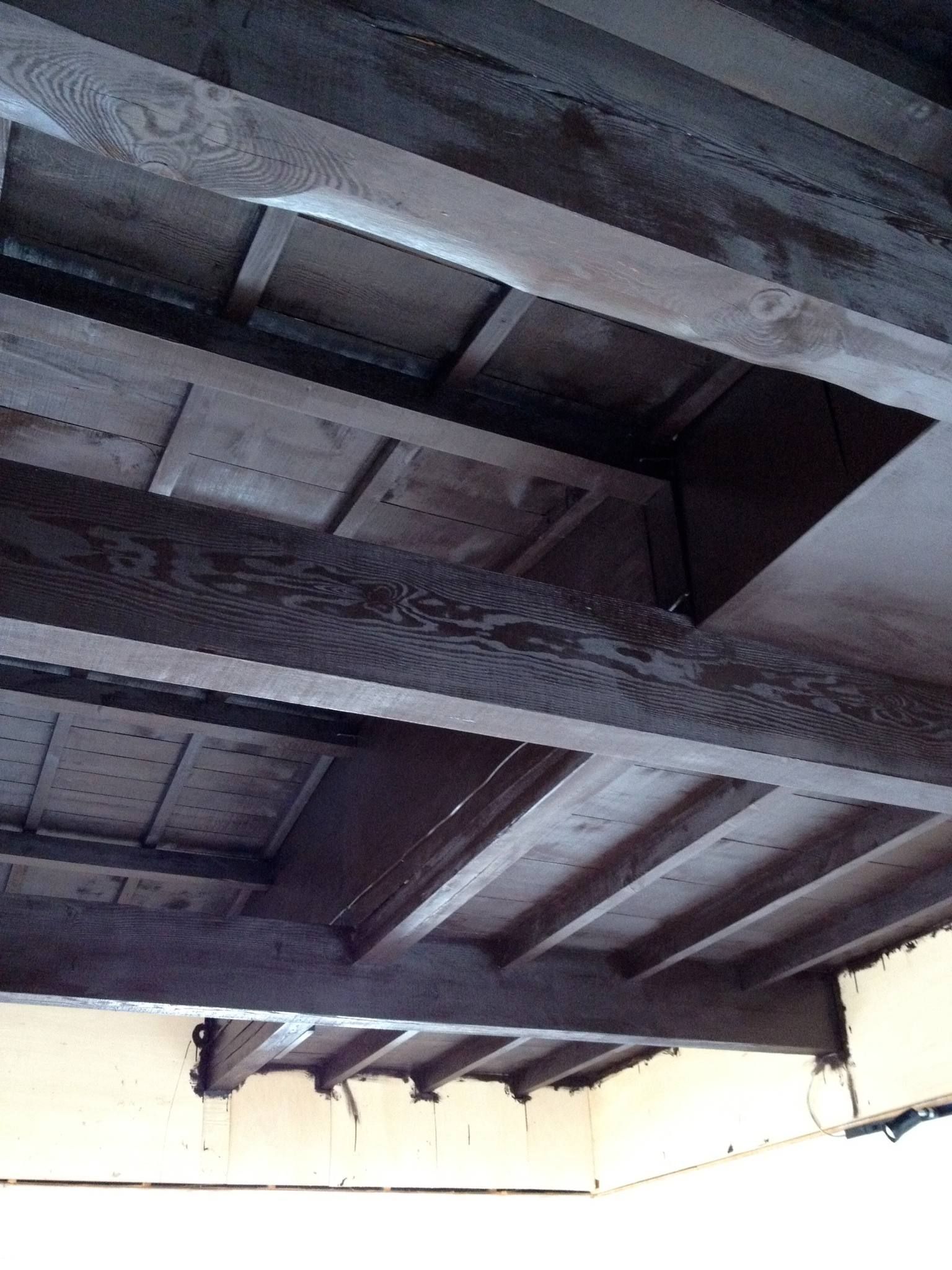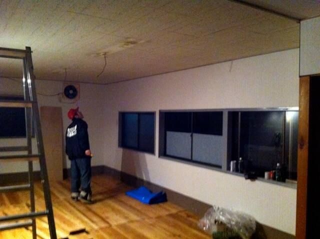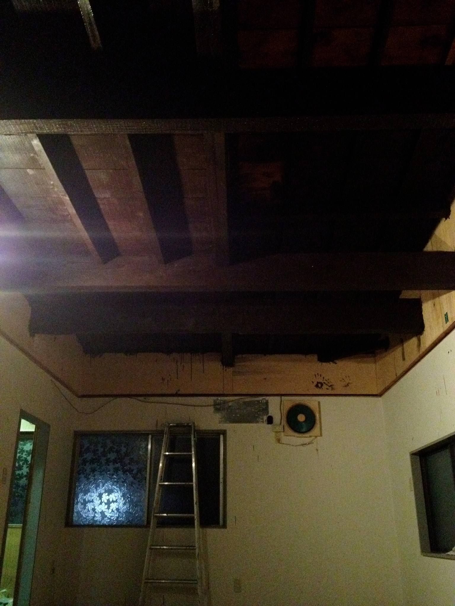 床を古い足場板にしたかったのですが、なかなか手に入れることができなかったので、先ず、杉板を敷き詰めてその上で作業をし、わざと汚れや傷を付けていきました。この写真は「天井剥がしたら梁出てくるかな??」と考えてるところです。