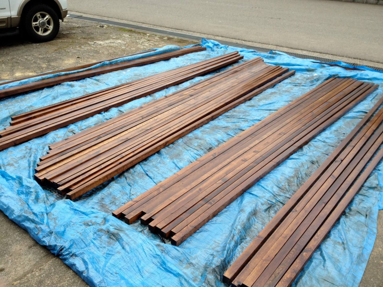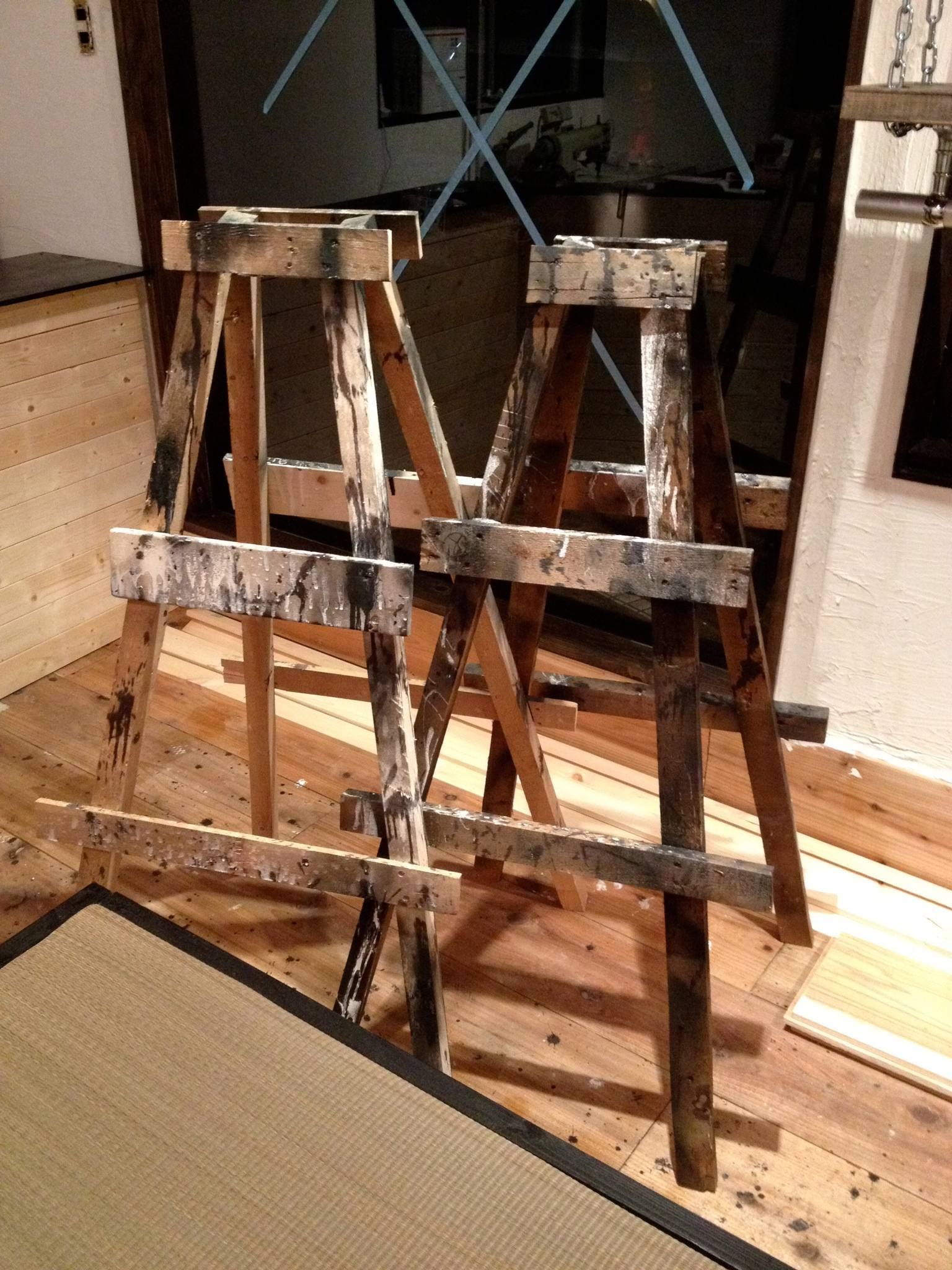 ちなみにこの段階で、一旦床板を並べ替え、汚れや傷が不自然にならないようにします。そして固定し、什器の制作に入ります。